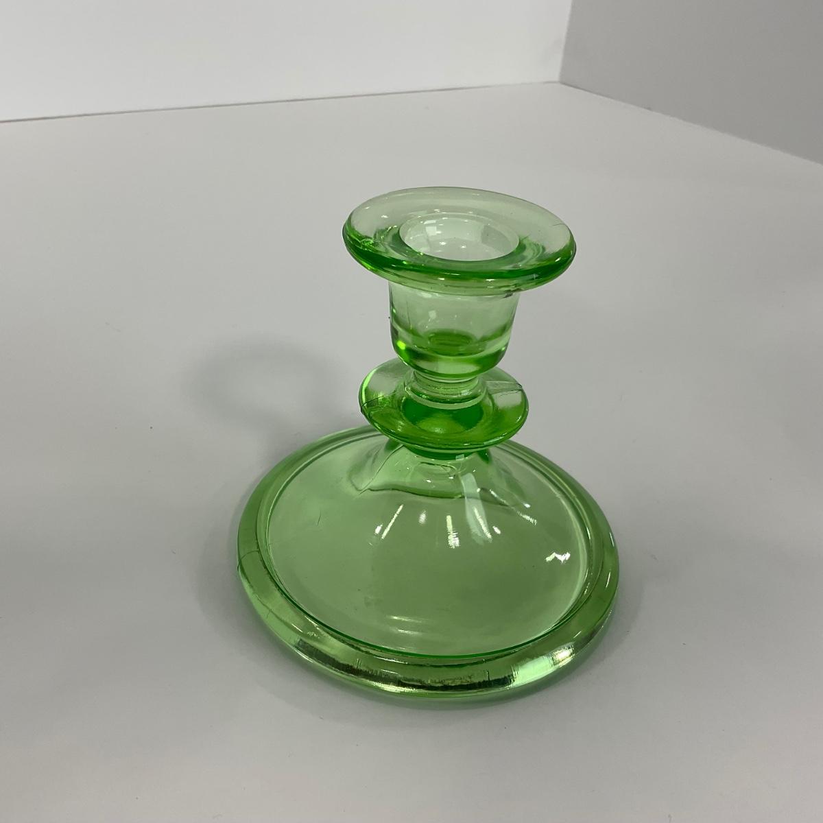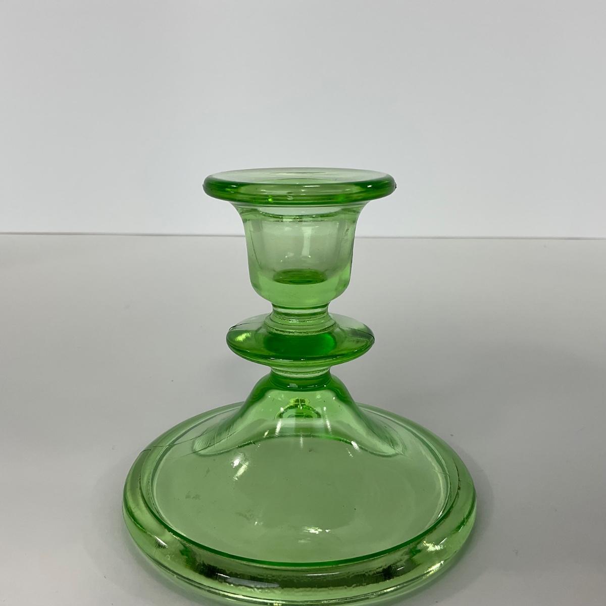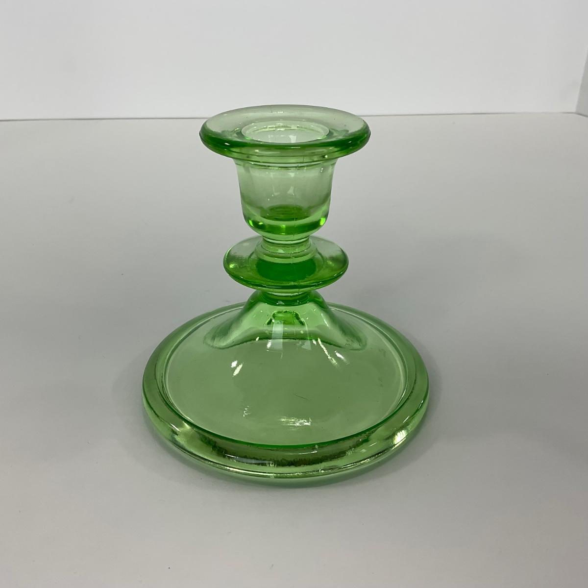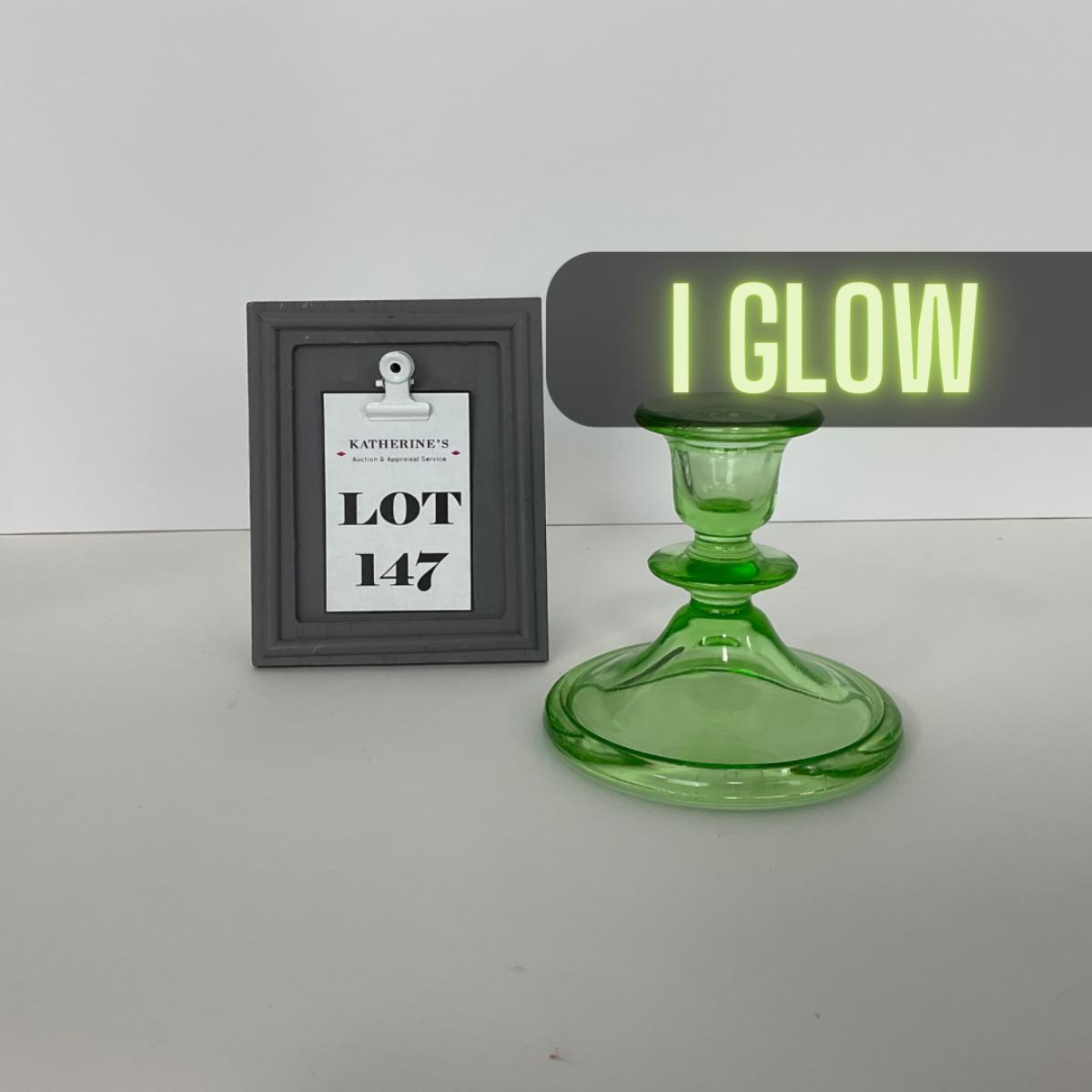 One green depression glass candle stick. I am Uranium glass so I DO GLOW under blacklight. Please see photos for details and condition. ::: Shipping is available on this lot. If you require shipping you must let us know at the close of the auction. We will coordinate with you after the item has been won. Shipping fees will include insurance up to or exceeding the value of all items being mailed. If you have any questions regarding this lot please contact the auctioneer either via this website, by direct email or by phone. PICK UP TIMES and other important information can be found in the TERMS and DESCRIPTION of the auction. Please take a look for pertinent information. Thanks!