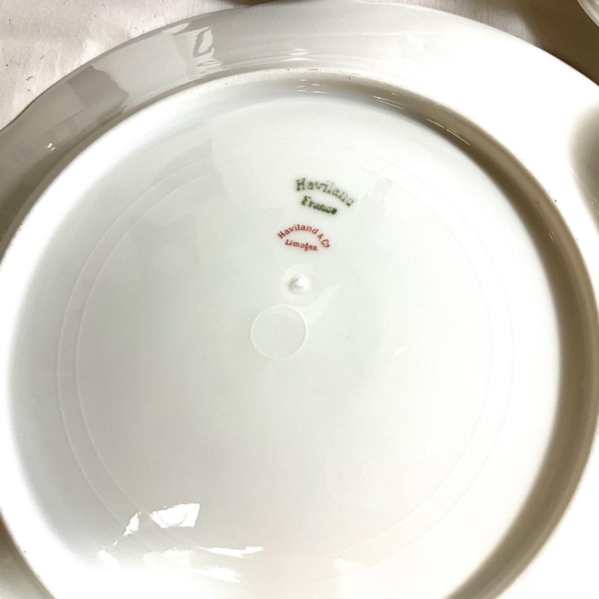 12 limoges dinner plates (4-chipped) 10 bouillons with saucers and 5 extra saucers, 10 demitasse cup and saucer with 8 scalloped limoges bowls