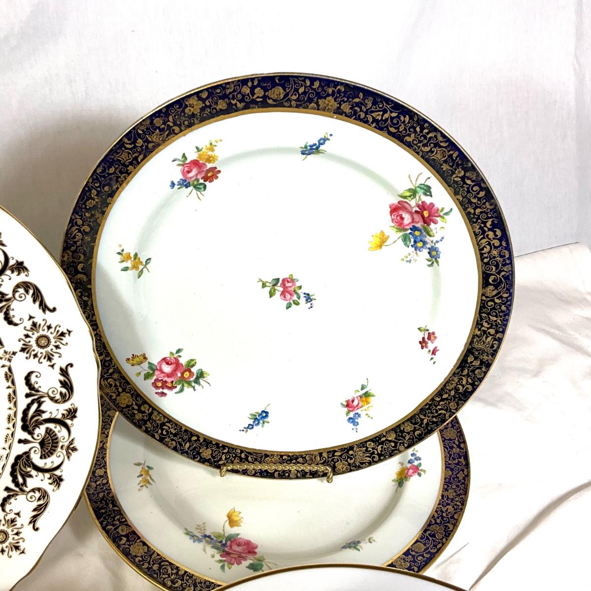 Various dinner plates , bread and butter , cups and saucers with gold and white china plates