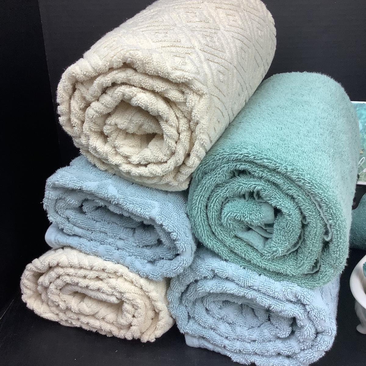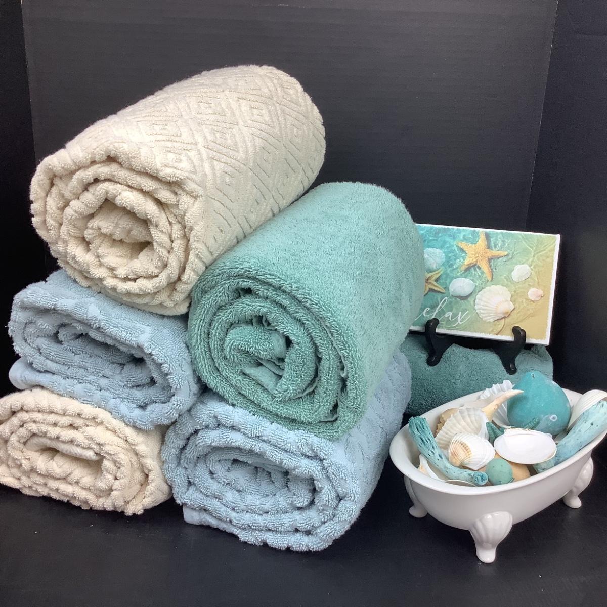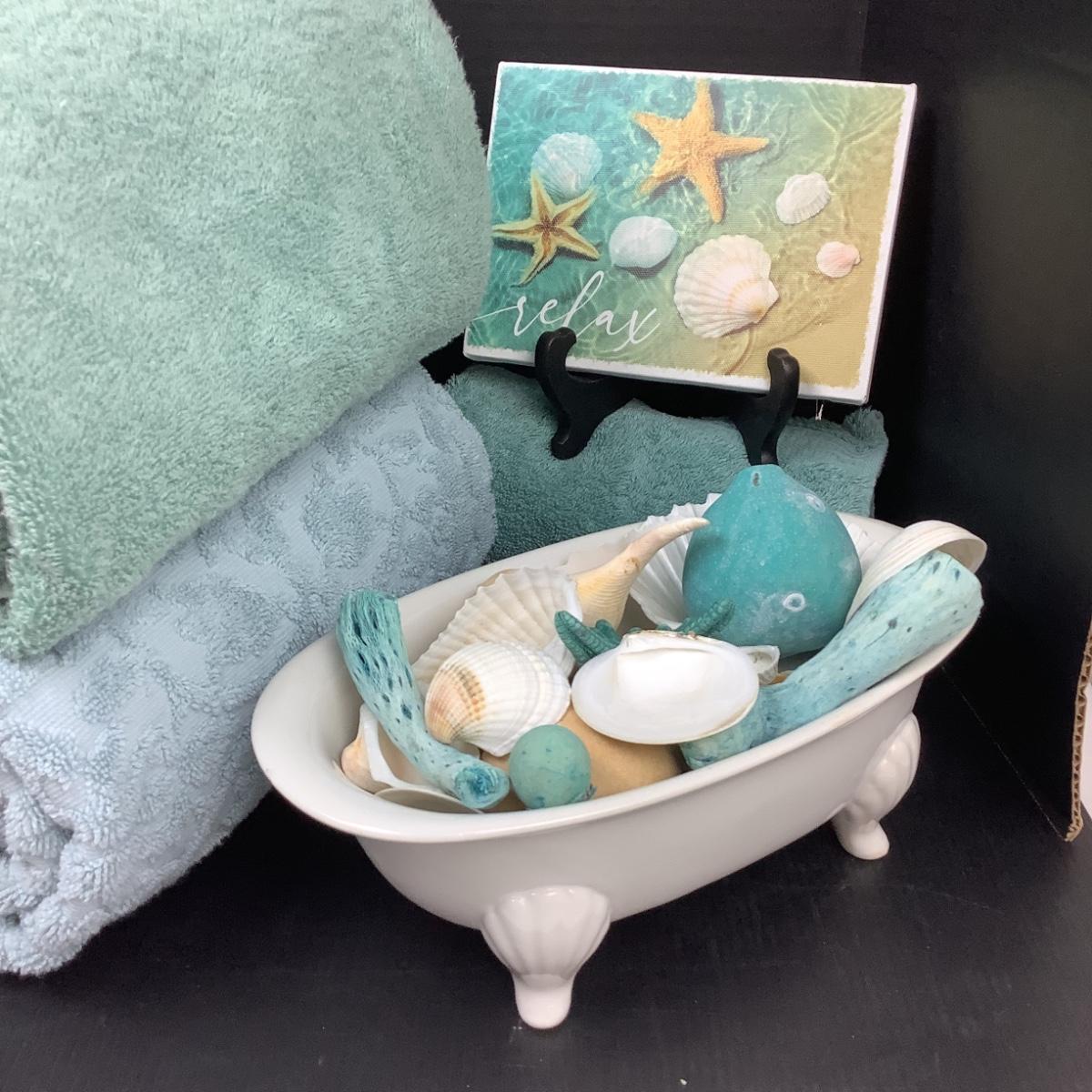 5 bath towels, 1 hand towel, small "Relax" picture and a ceramic bathtub with shells.