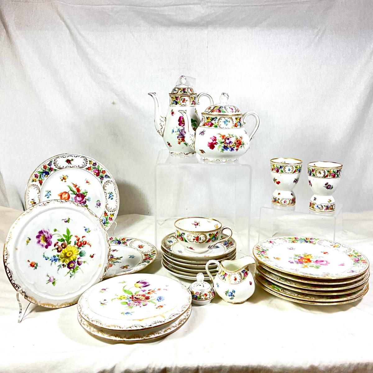 Coffee and Tea Pot , one creamer, lid to sugar, 2 trives, 2 salad plates, 2 dessert plates, one tea cup and 6 saucers