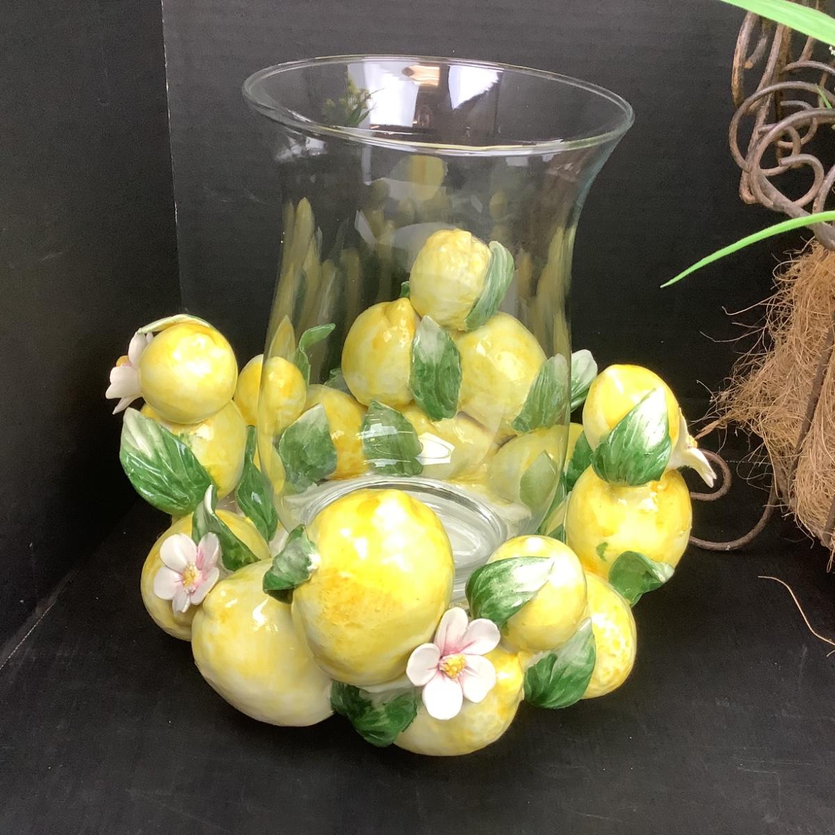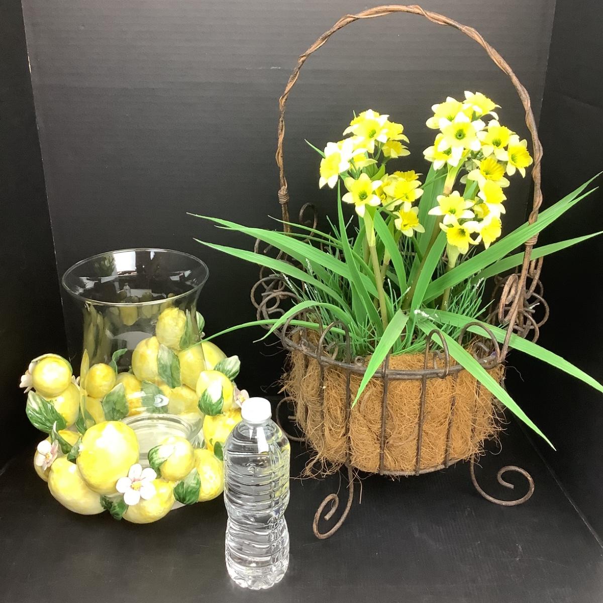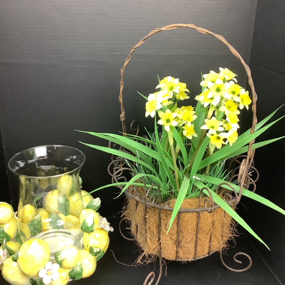 Lemon centerpiece has hurricane for candle (10" x 10"), the faux daffodils are in a metal wire basket (22" x 12").