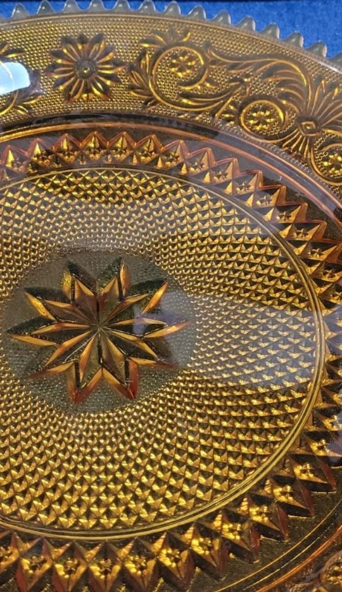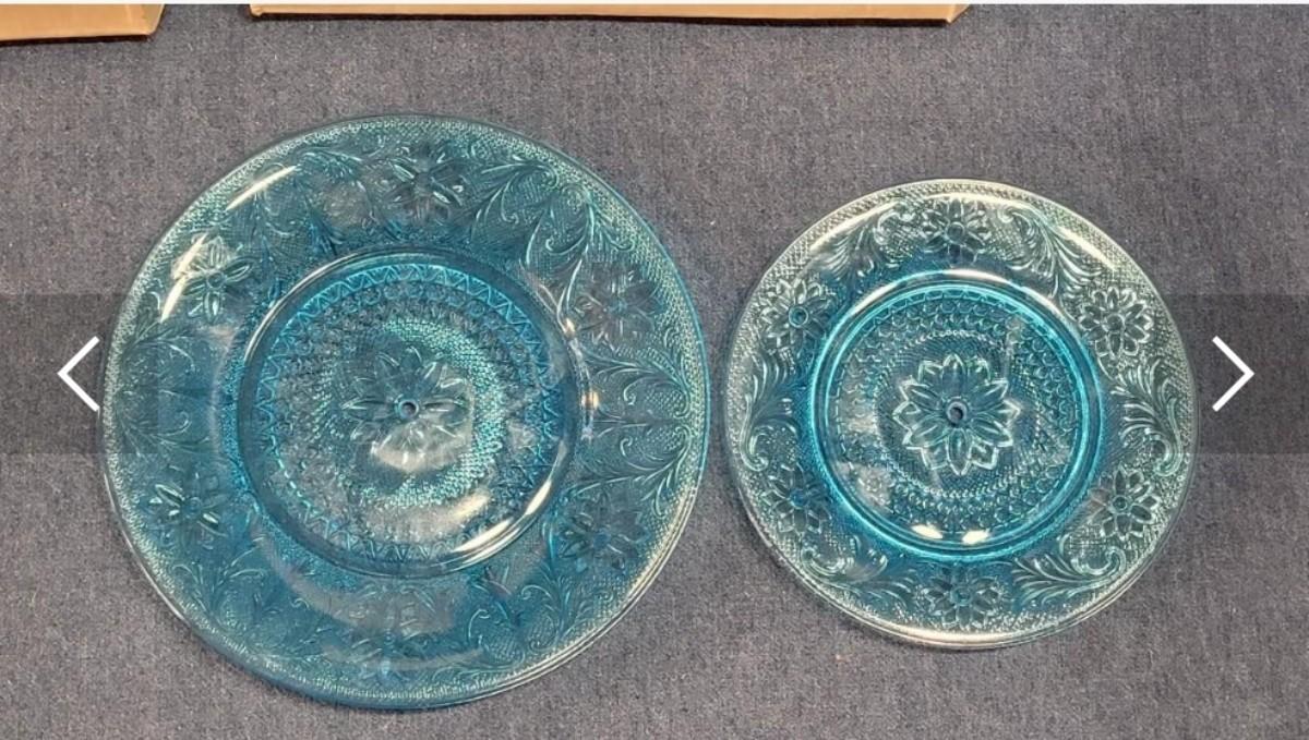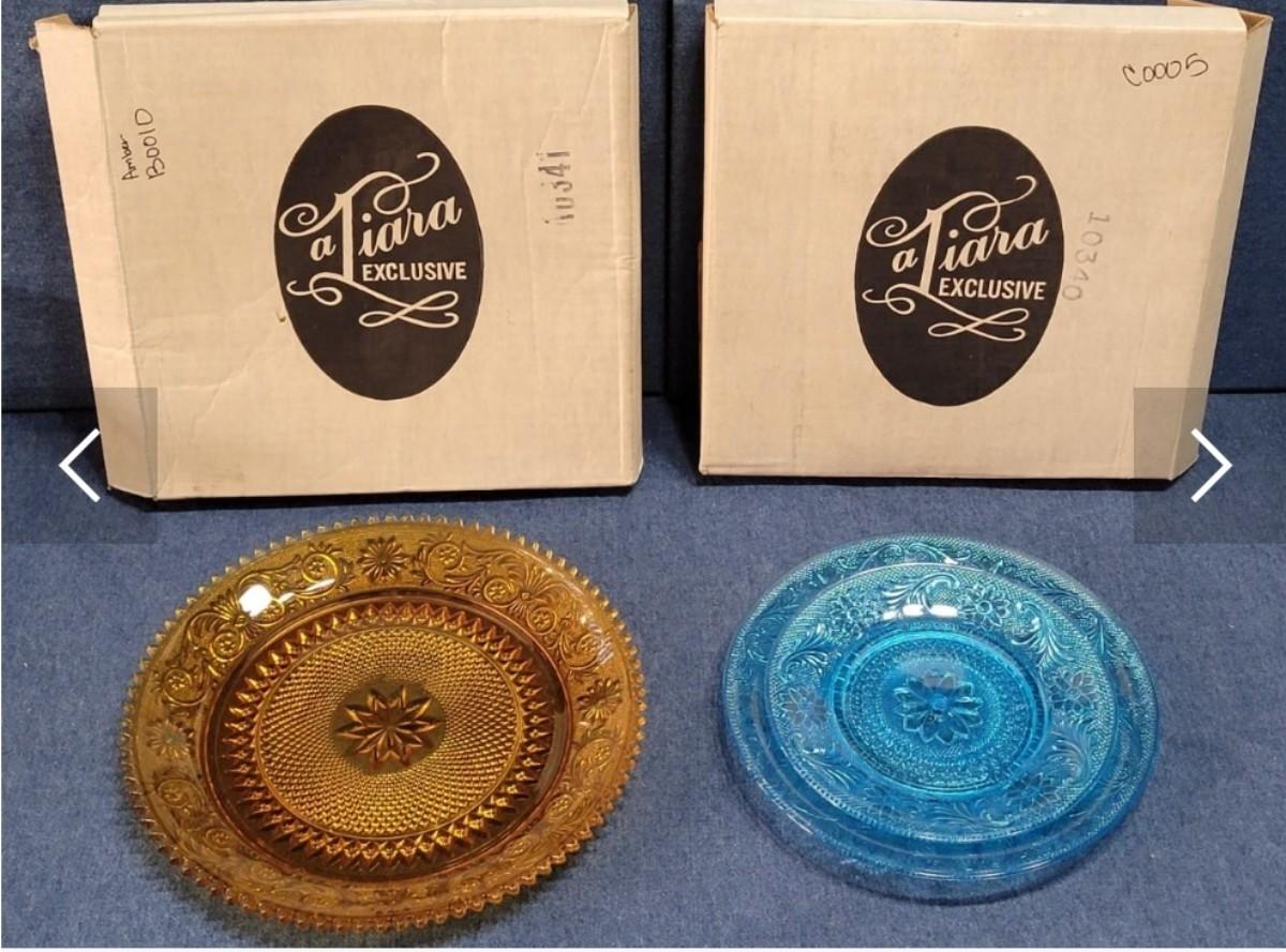 148: Vintage Yellow & Blue TIARA Glass Platters with Original Boxes