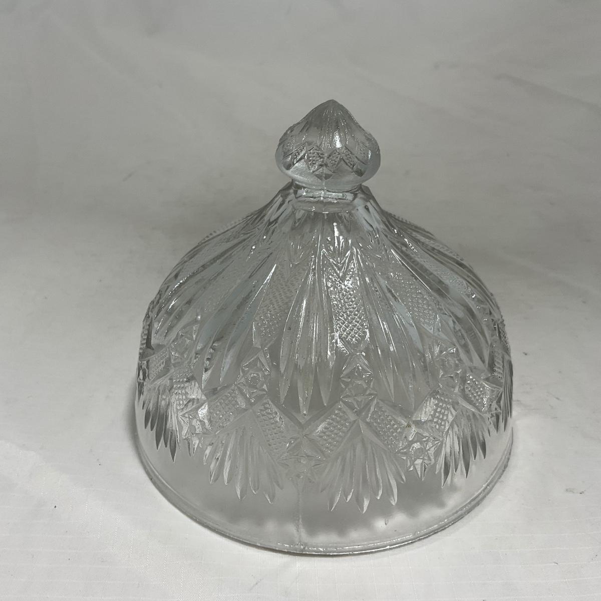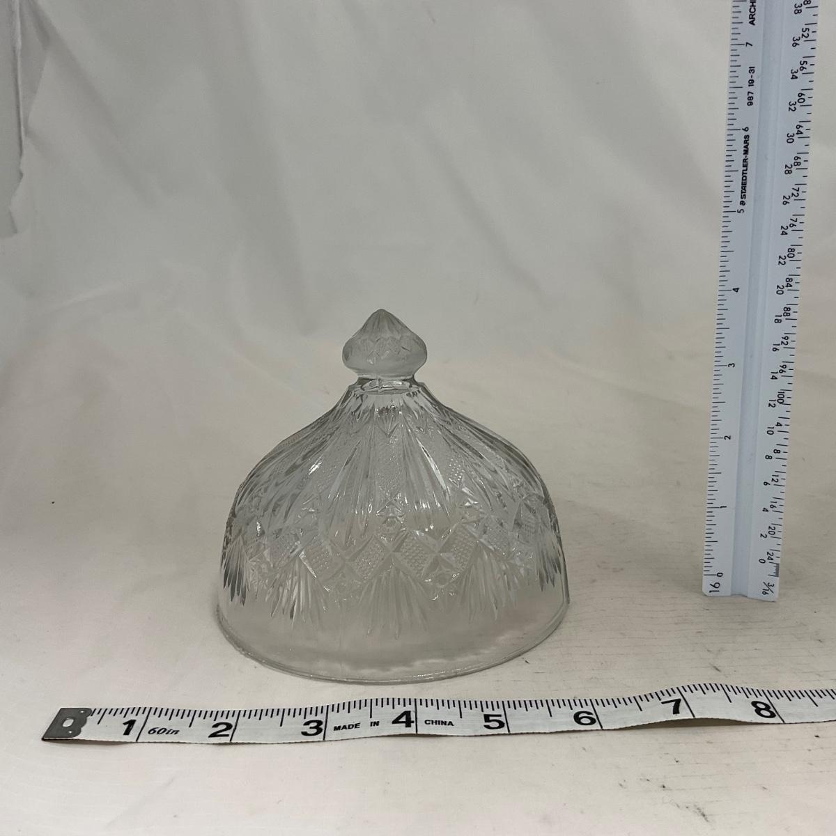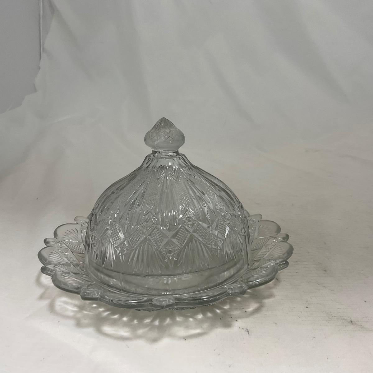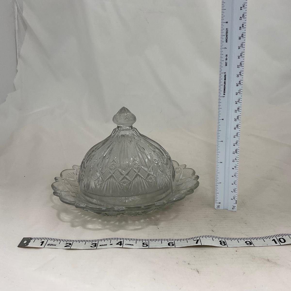 One clear glass covered butter dish with beautiful design. This piece is loved and worn were the top meets the base. Please see photos for details and condition. ::: Shipping is available on this lot. If you require shipping you must let us know at the close of the auction. We will coordinate with you after the item has been won. Shipping fees will include insurance up to or exceeding the value of all items being mailed. If you have any questions regarding this lot please contact the auctioneer either via this website, by direct email or by phone. PICK UP TIMES and other important information can be found in the TERMS and DESCRIPTION of the auction. Please take a look for pertinent information. Thanks!