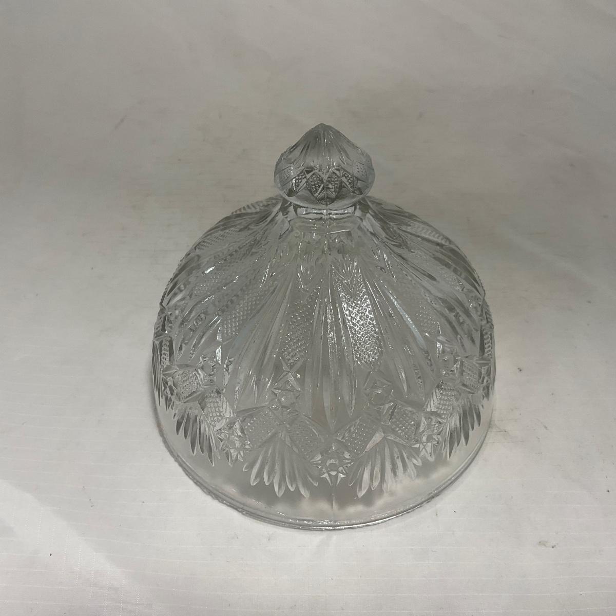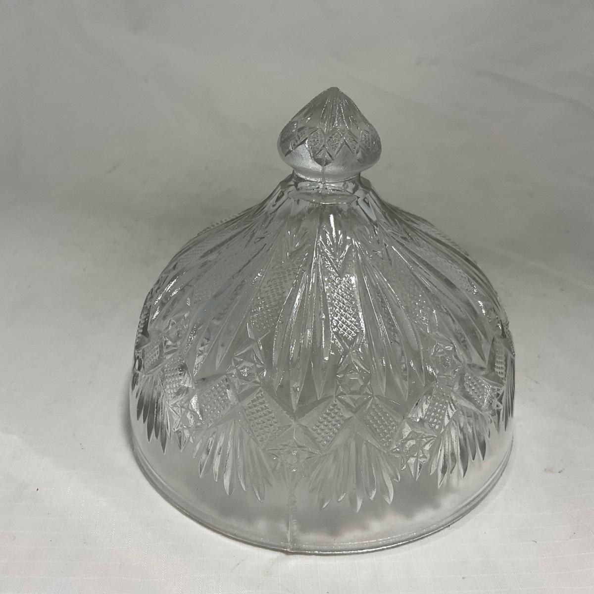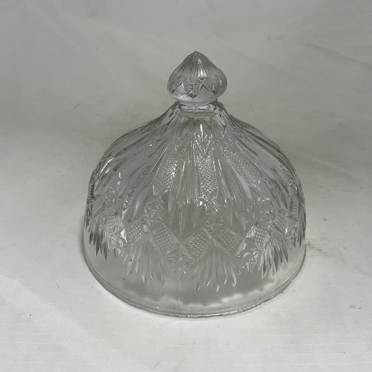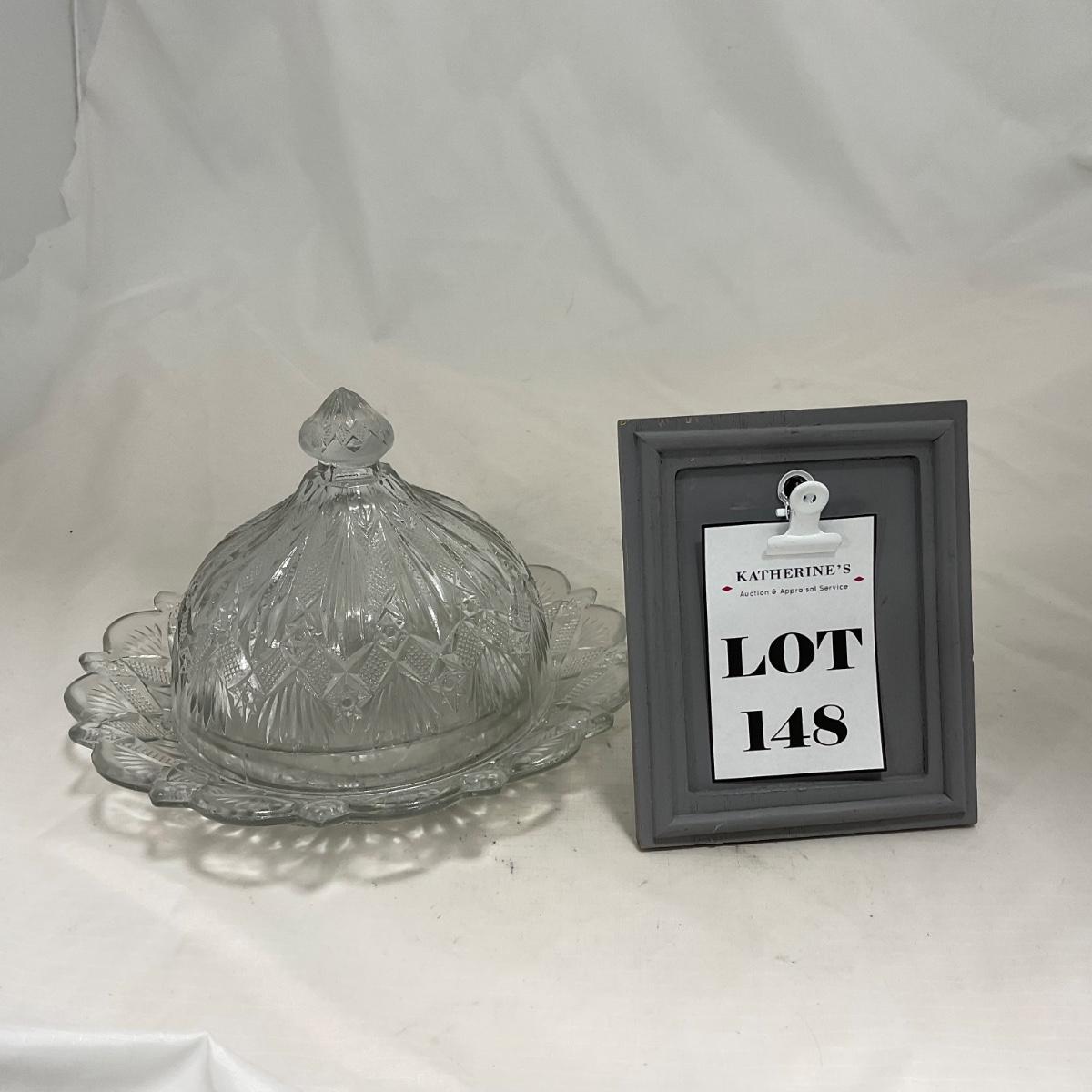 One clear glass covered butter dish with beautiful design. This piece is loved and worn were the top meets the base. Please see photos for details and condition. ::: Shipping is available on this lot. If you require shipping you must let us know at the close of the auction. We will coordinate with you after the item has been won. Shipping fees will include insurance up to or exceeding the value of all items being mailed. If you have any questions regarding this lot please contact the auctioneer either via this website, by direct email or by phone. PICK UP TIMES and other important information can be found in the TERMS and DESCRIPTION of the auction. Please take a look for pertinent information. Thanks!