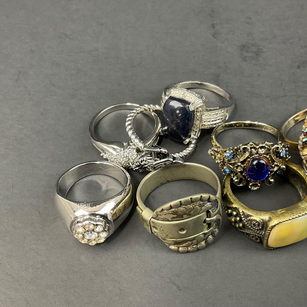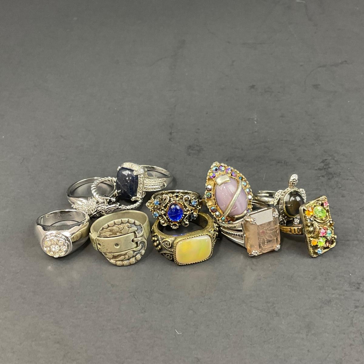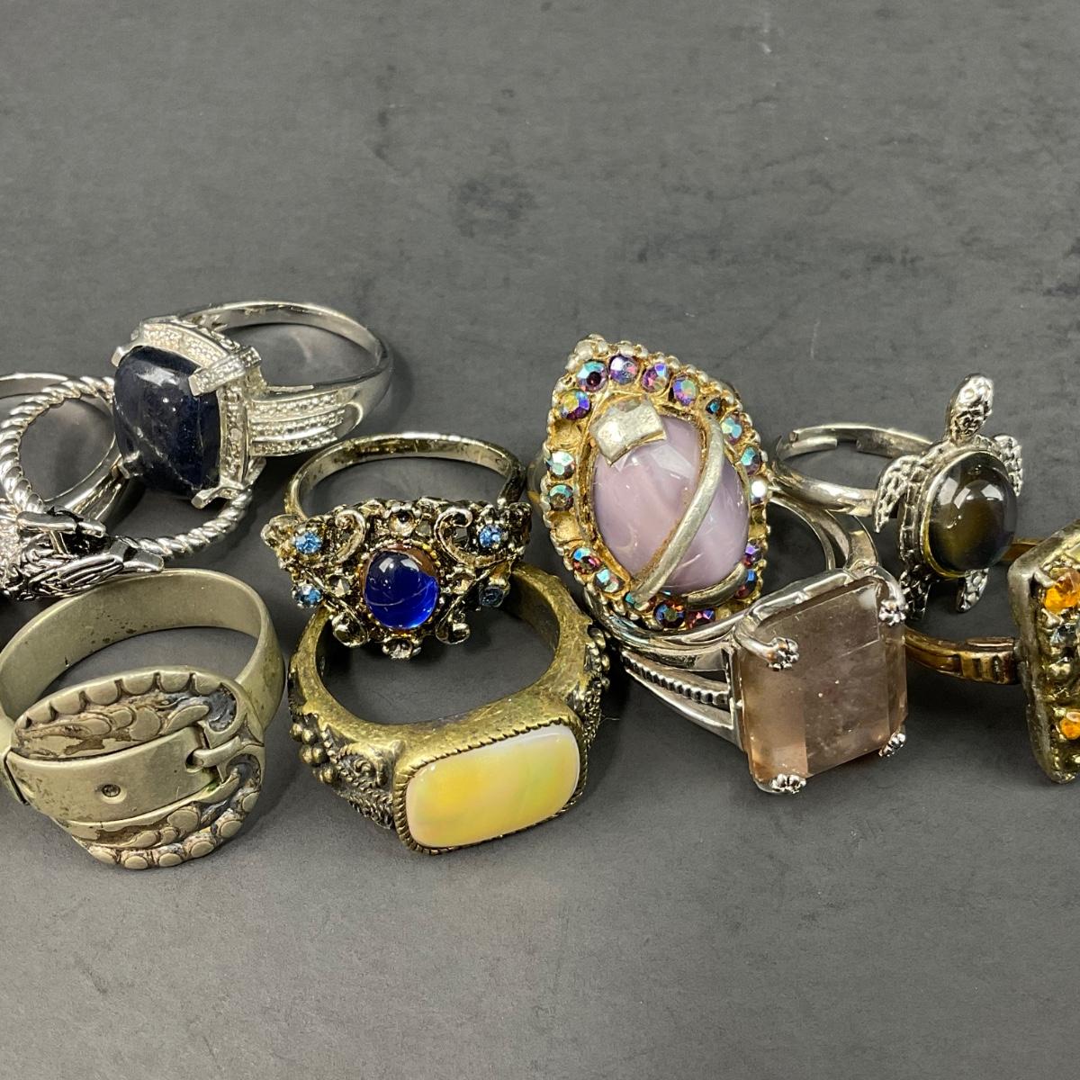 11 assorted costume jewelry rings ranging from size 6 to size 12.5 there are some adjustable rings as well. Please see photos for details and condition. Any condition statement is given as a courtesy to a client, is an opinion, and should not be treated as a statement of fact. Reference to condition written, oral or within a condition report shall not be regarded as a full account of condition and may not include all defects, alterations, or restorations. Absence of a condition report does not imply a lot is flawless or lacking imperfections or damage. Katherine’s Auction & Appraisal Service shall have no responsibility for any error or omission. Returns shall not be accepted on the basis of condition. ::: Shipping is available on this lot. If you require shipping you must let us know at the close of the auction. We will coordinate with you after the item has been won. Shipping fees will include insurance up to or exceeding the value of all items being mailed. If you have any questions regarding this lot please contact the auctioneer either via this website, by direct email or by phone. PICK UP TIMES and other important information can be found in the TERMS and DESCRIPTION of the auction. Please take a look for pertinent information. Thanks!