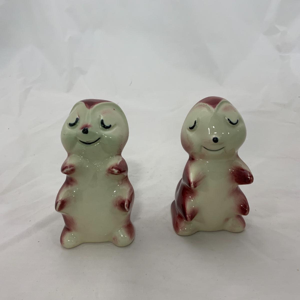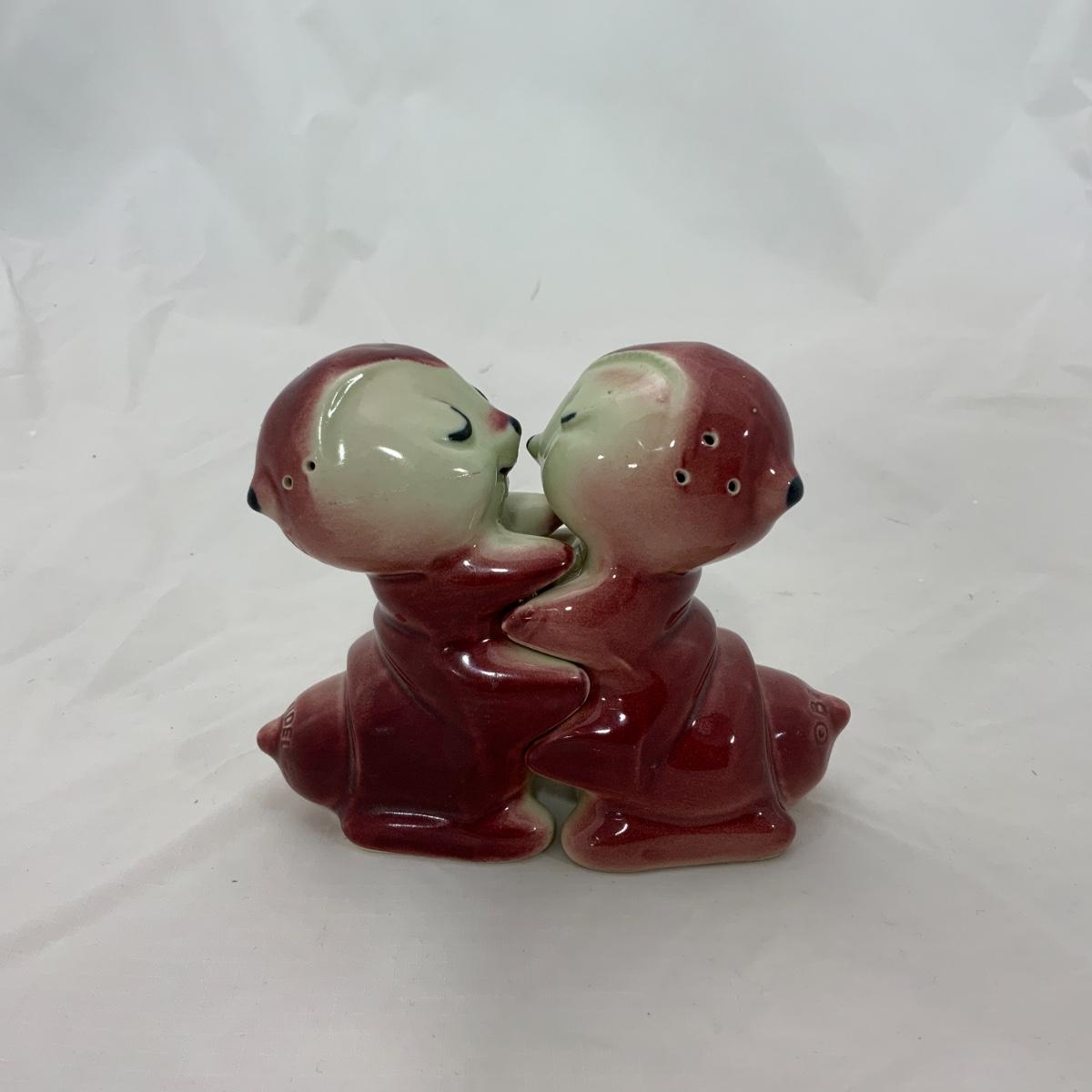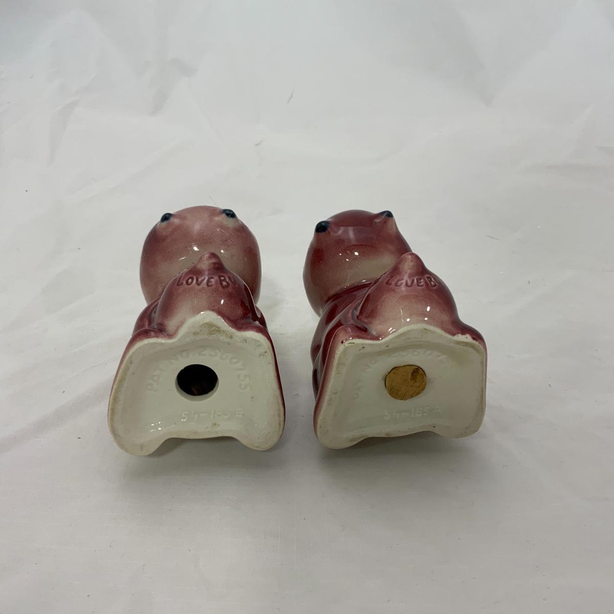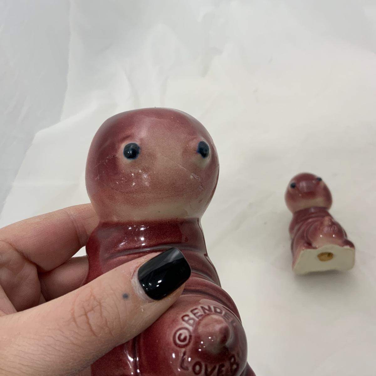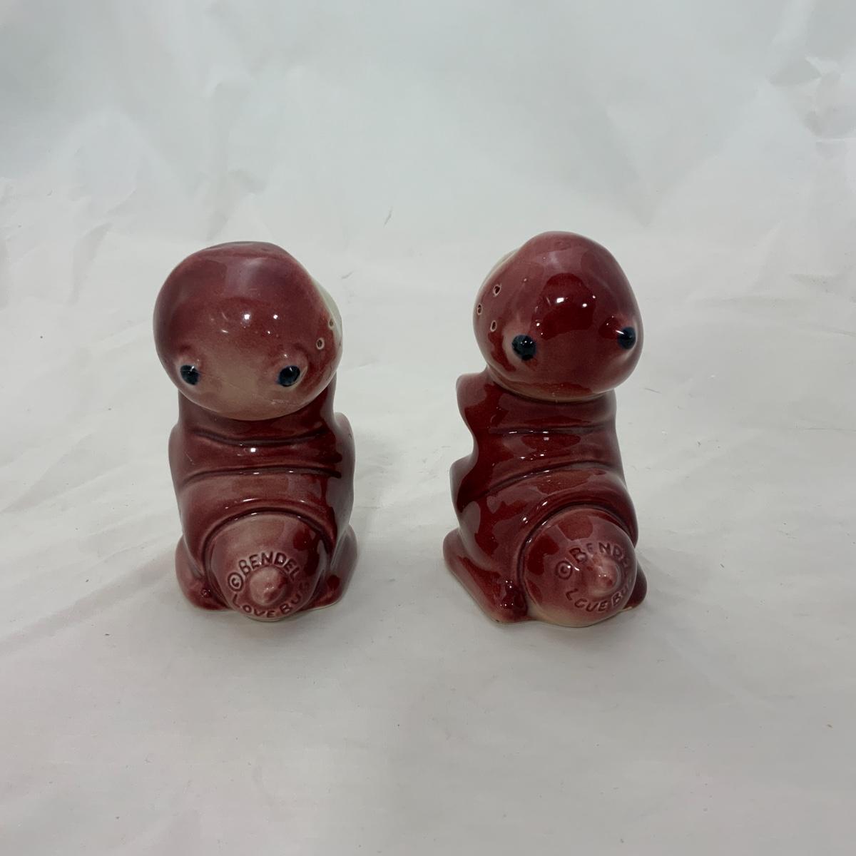 From the Estate of Peter and Alice Radovanovich: A sweet little set of 1950s R. Bendel Love Bug Huggies. Unfortunately one of them has taken a tumble, and was repaired. PLEASE see photos for details and condition. ::: Shipping is NOT available on this lot. If you have any questions regarding this lot please contact the auctioneer either via this website, by direct email or by phone. PICK UP TIMES and other important information can be found in the TERMS and DESCRIPTION of the auction. Please take a look for pertinent information. Thanks!