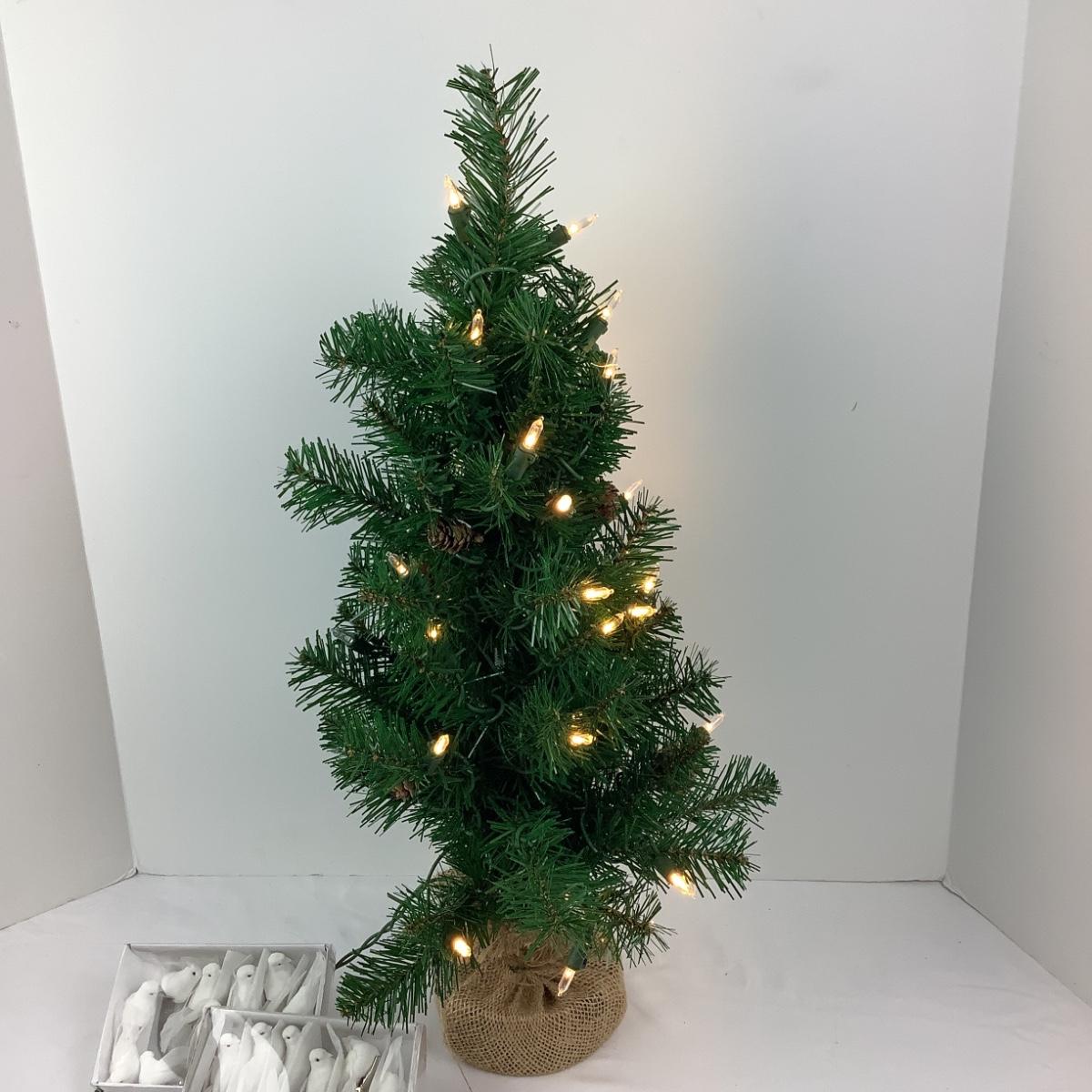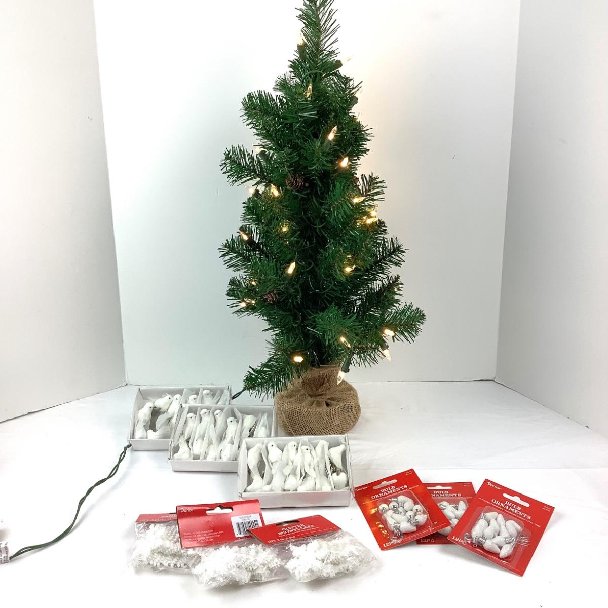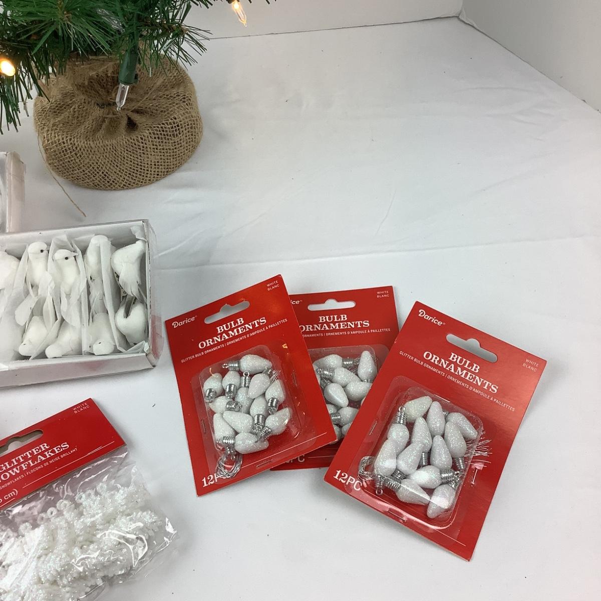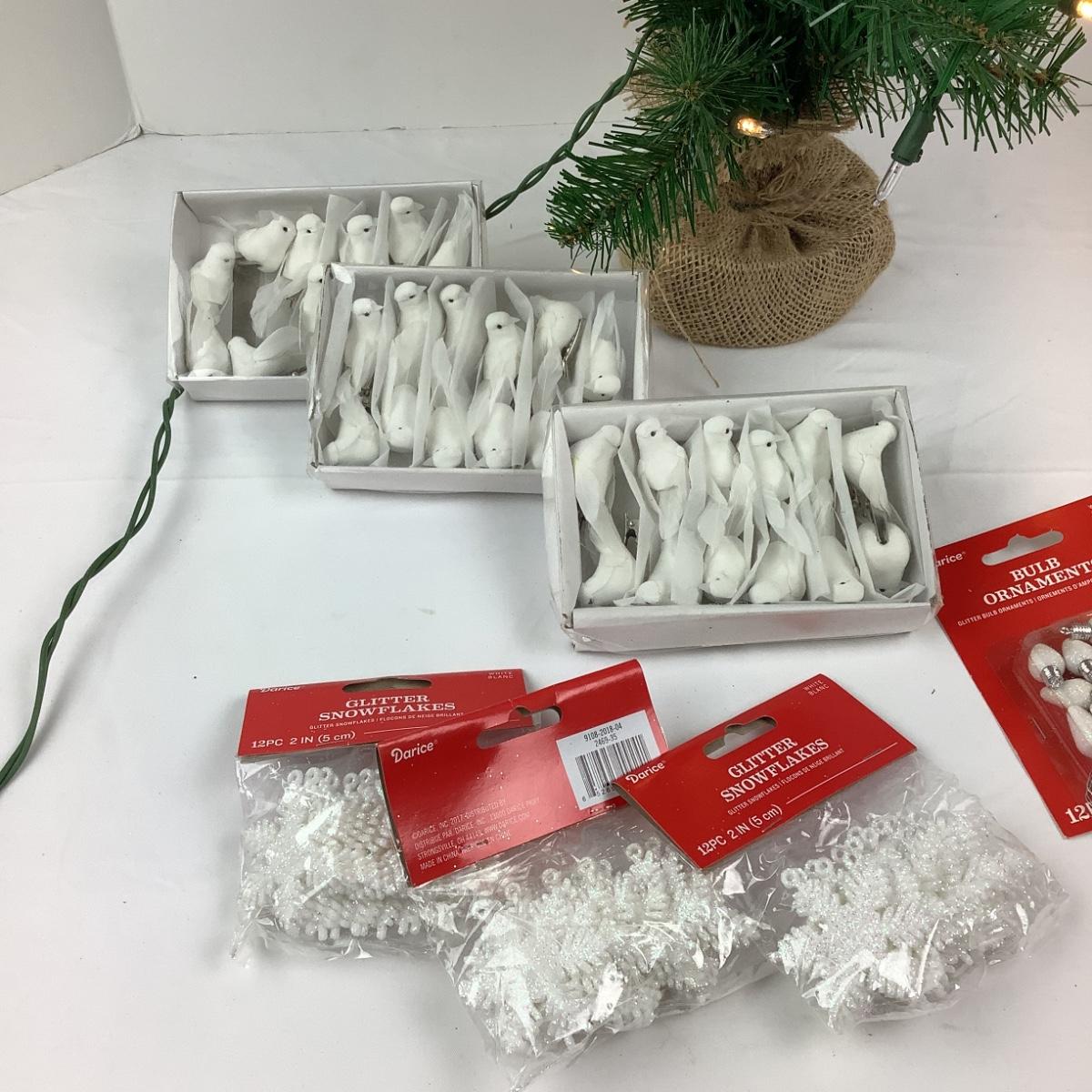 The tree is has lights and measures 24” tall, There are 3 boxes of new doves, glitter white bulbs and snowflakes.