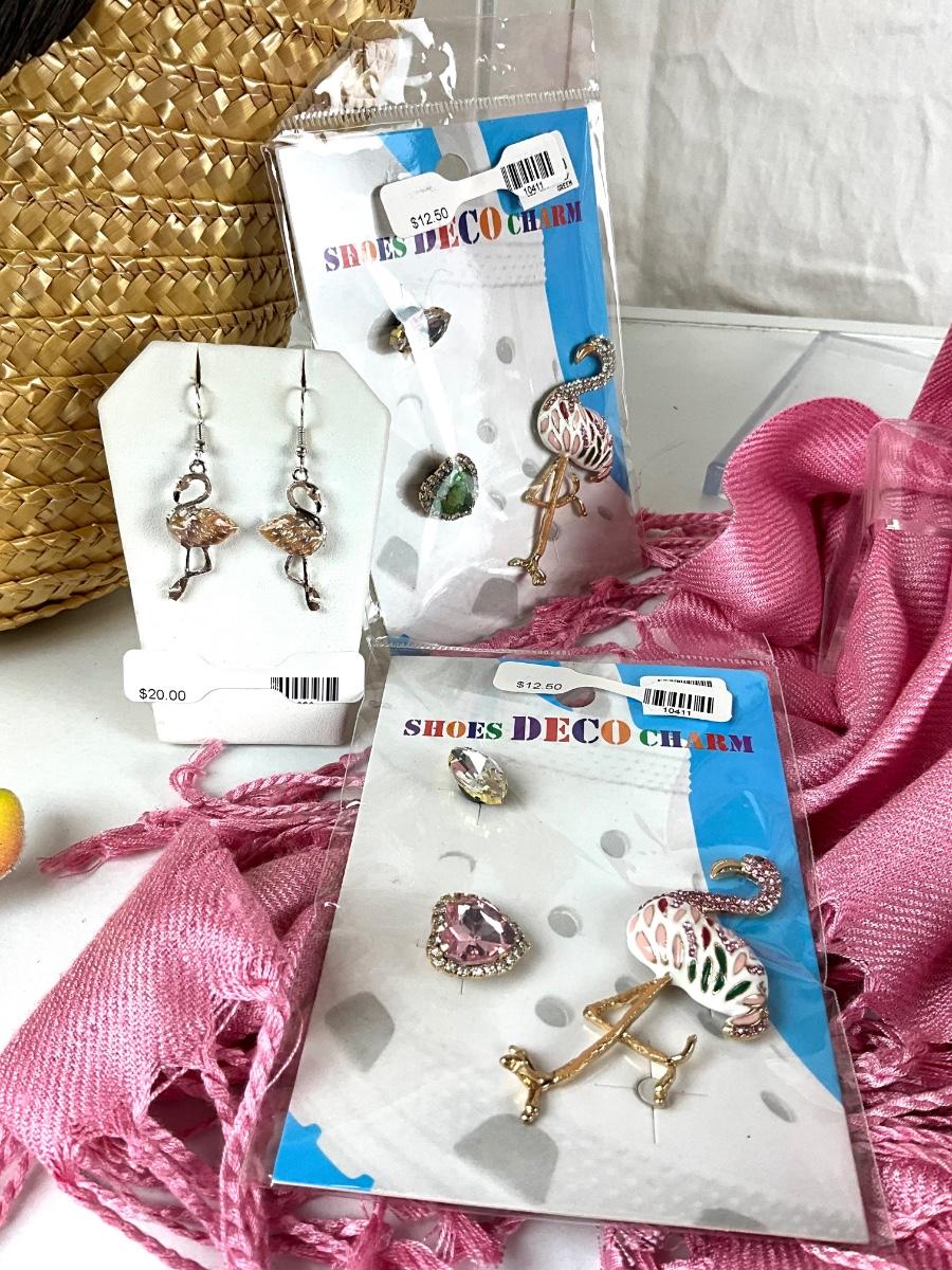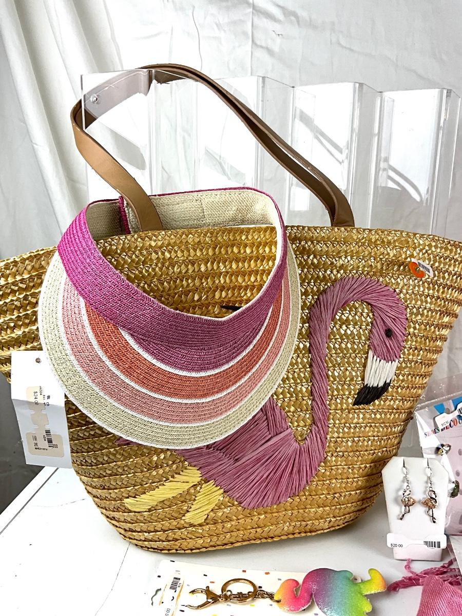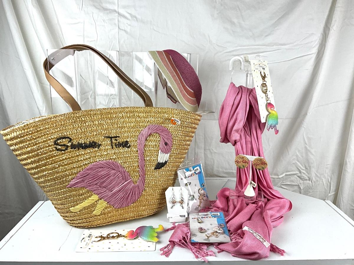 149 Flamingo Lot with Scarf, Keychain, Straw Bag, Visor, Shoe Charms