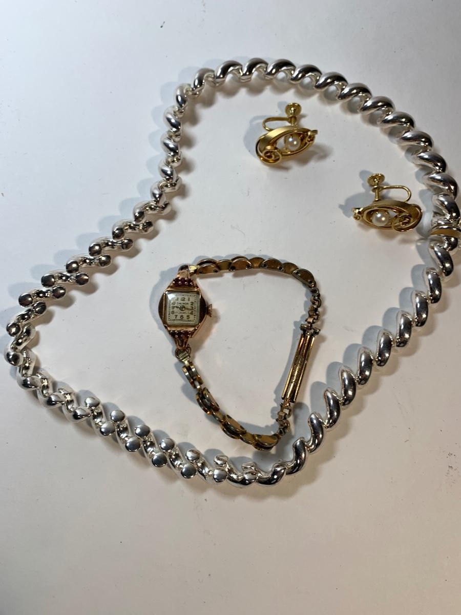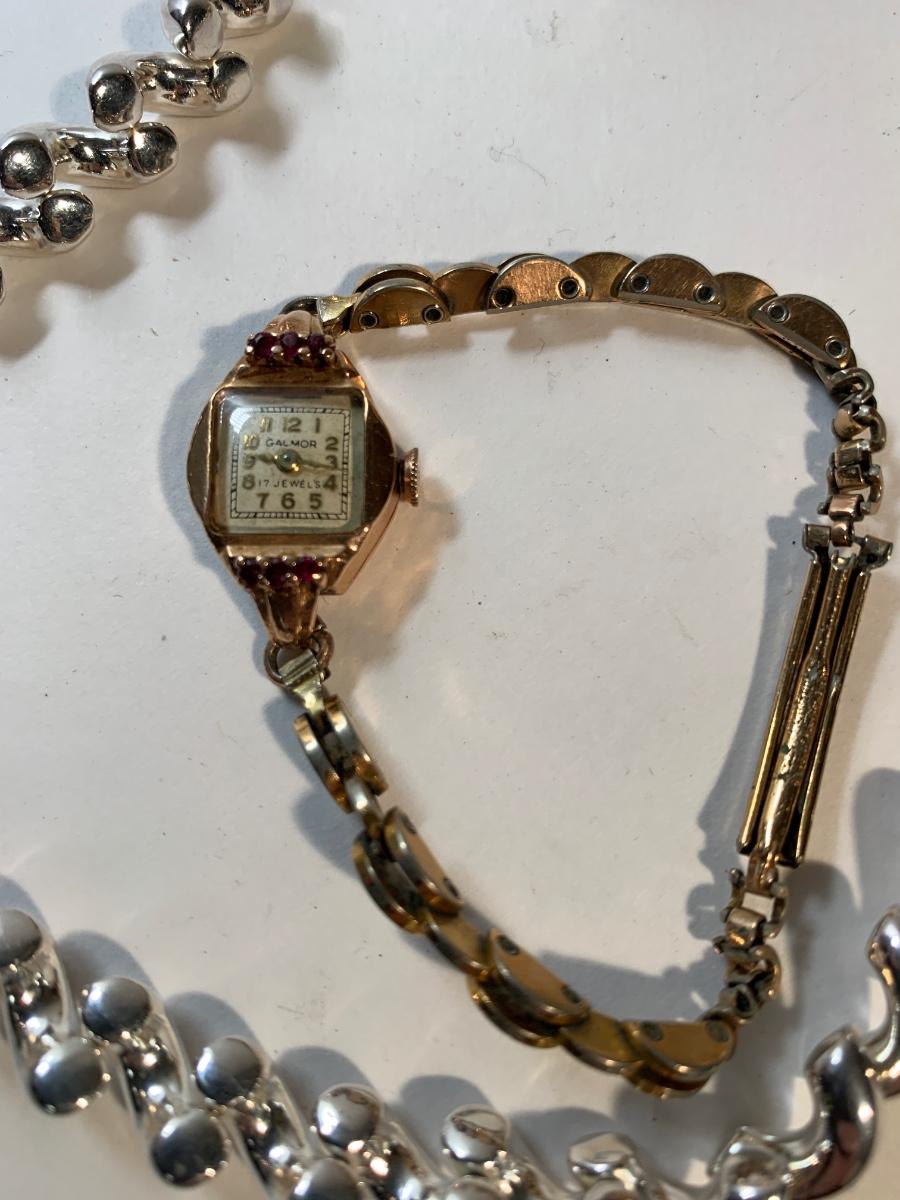 Galor 14ct rose gold and rubies vintage watch together with costume ear rings and necklace