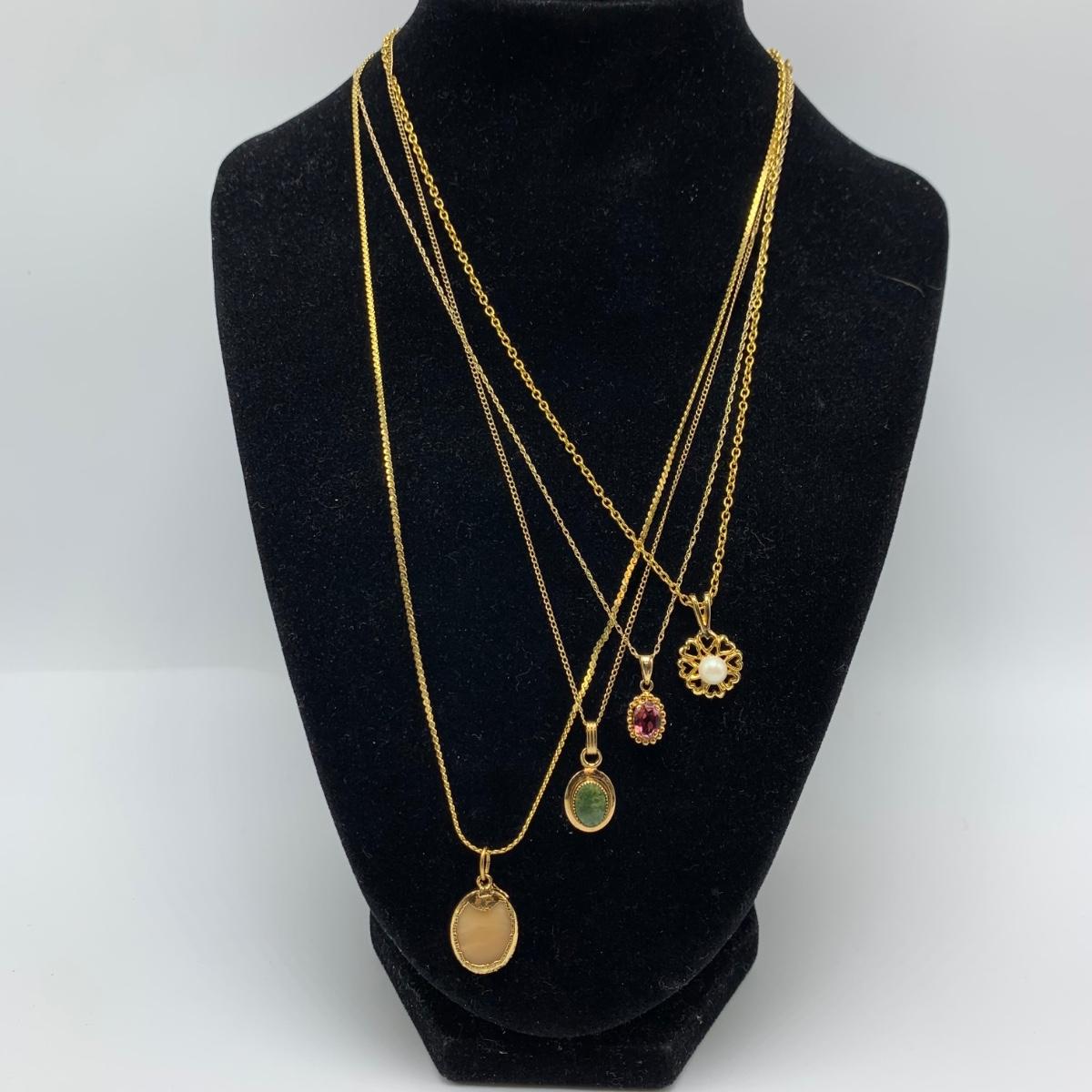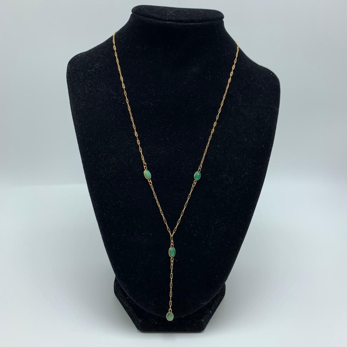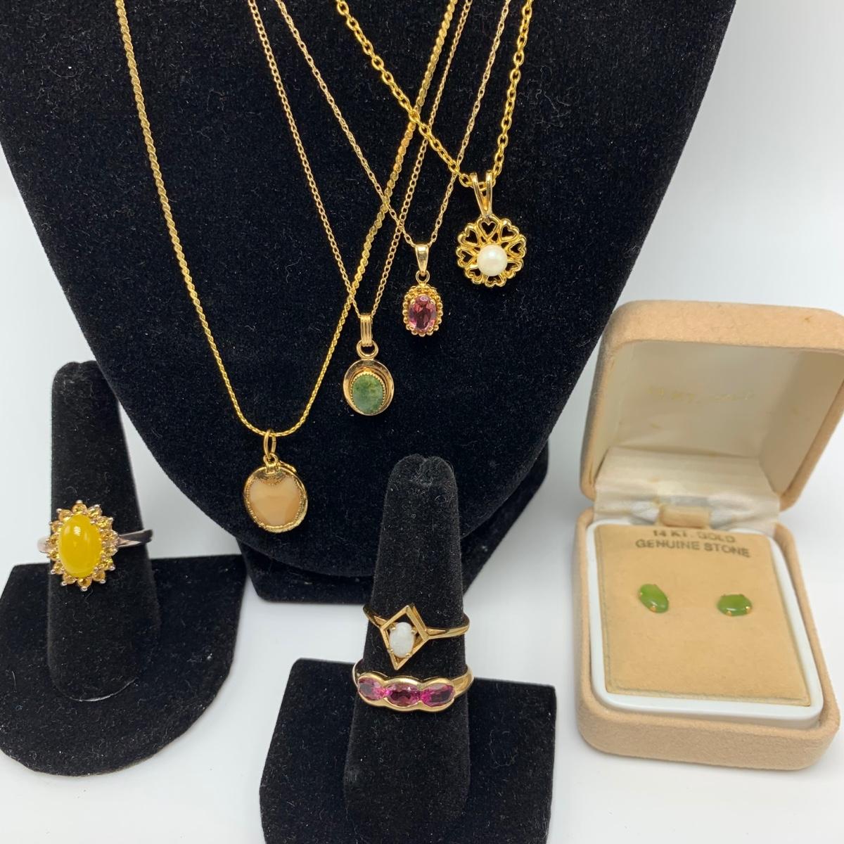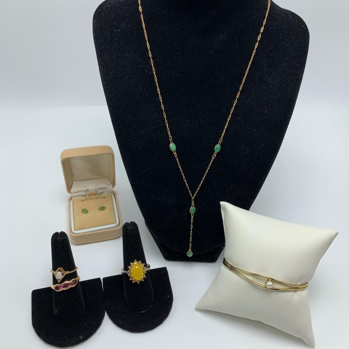 Five necklaces, four rings, a cuff bracelet, a pair of stud earrings, and a loose green gemstone. Longest necklace chain that has oval tan colored stone is 20”; it has no markings, nor does the necklace with the pearl-like bead. Necklace with pink colored gemstone and its pendant are marked “˜14K’. Chain with single green pendant is marked “˜Sarah Cov 1/20 12K’. Necklace with four green gemstones is marked “˜CID 10K’. The ring with the large yellow stone is marked 925, the one with pink stones is marked 10K, and the one with the white stone is marked “˜18K HGE’. This one shows wear to the band and does not appear to be solid 18K. Please see photos for all markings found. We cannot guarantee the authenticity of the gemstones.