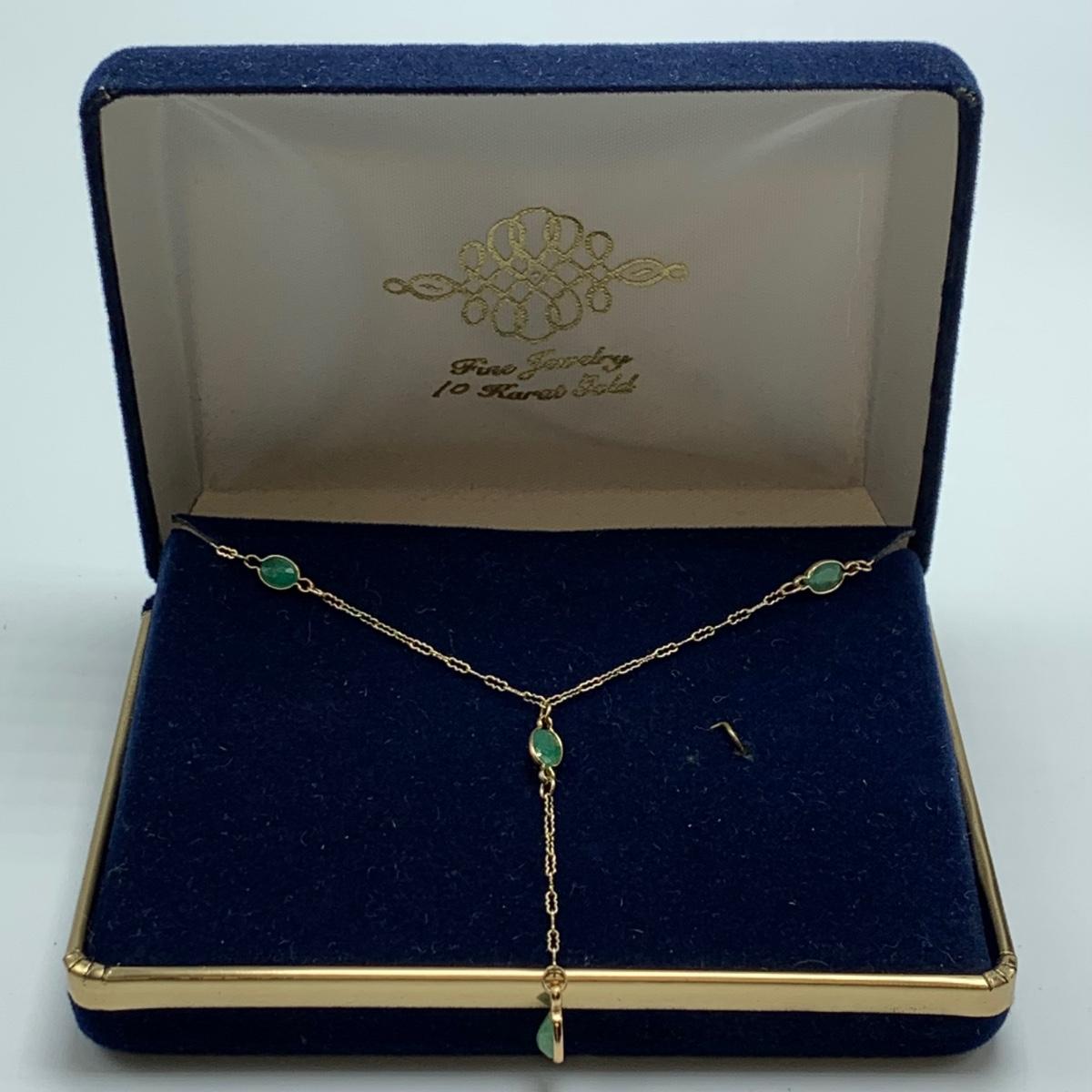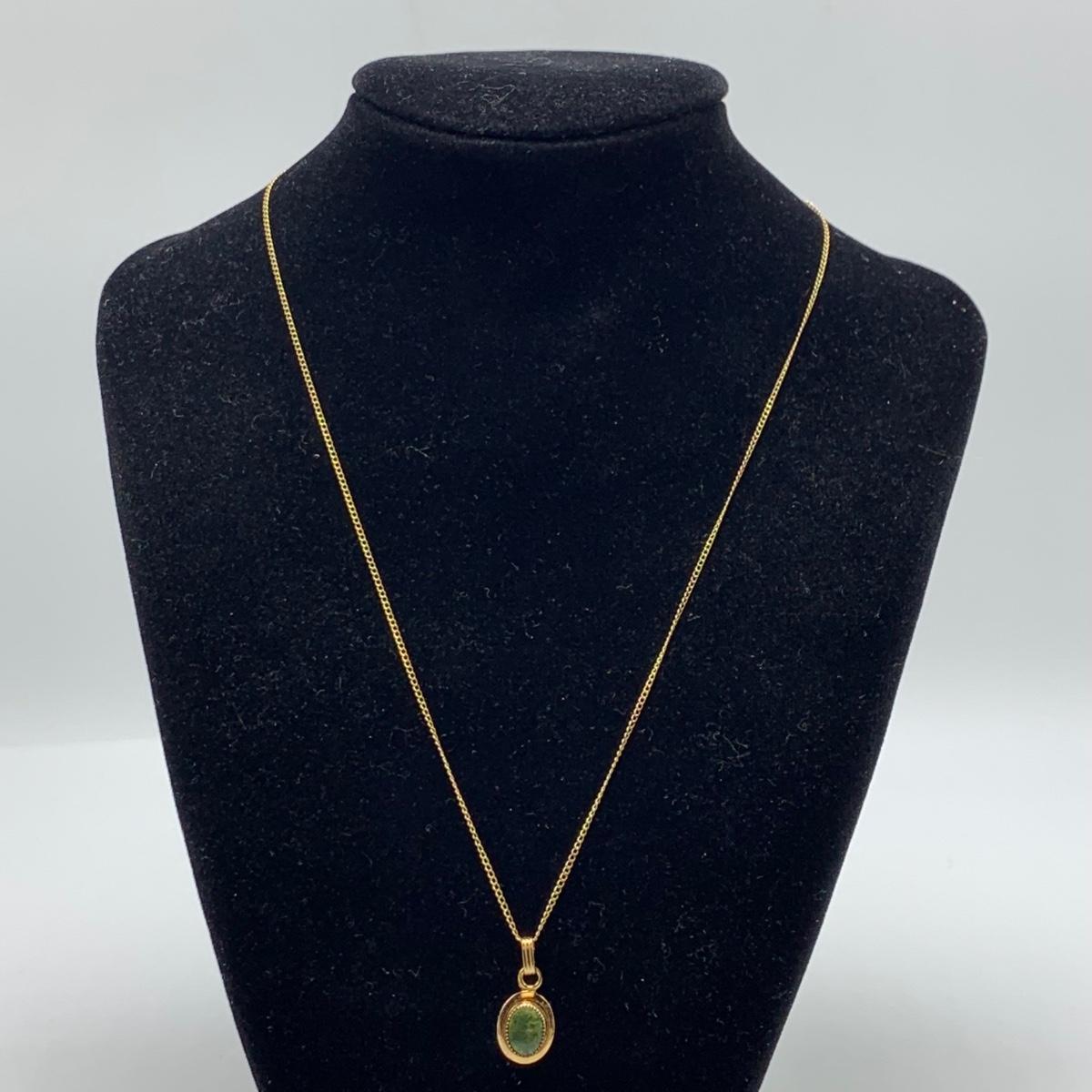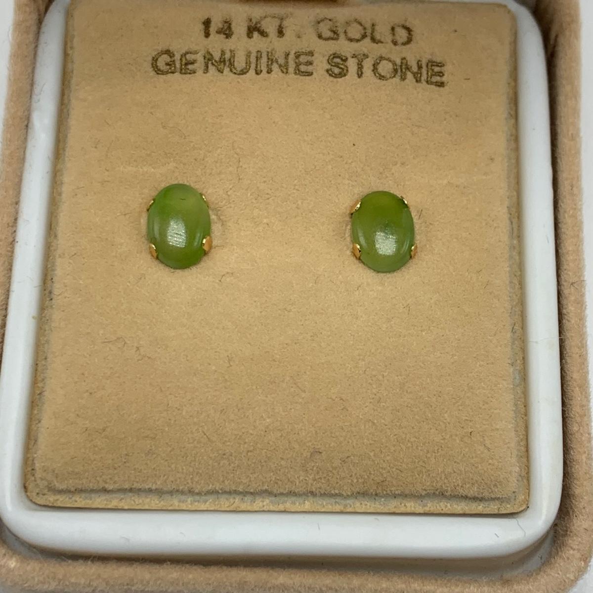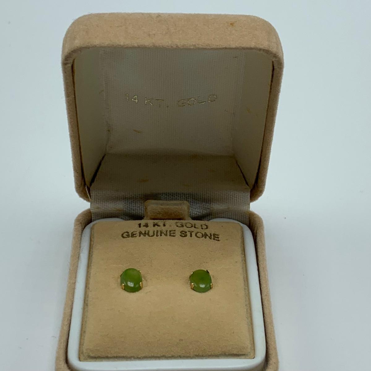 Five necklaces, four rings, a cuff bracelet, a pair of stud earrings, and a loose green gemstone. Longest necklace chain that has oval tan colored stone is 20”; it has no markings, nor does the necklace with the pearl-like bead. Necklace with pink colored gemstone and its pendant are marked “˜14K’. Chain with single green pendant is marked “˜Sarah Cov 1/20 12K’. Necklace with four green gemstones is marked “˜CID 10K’. The ring with the large yellow stone is marked 925, the one with pink stones is marked 10K, and the one with the white stone is marked “˜18K HGE’. This one shows wear to the band and does not appear to be solid 18K. Please see photos for all markings found. We cannot guarantee the authenticity of the gemstones.