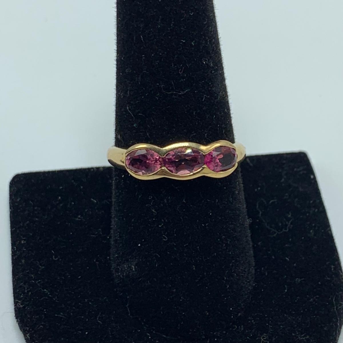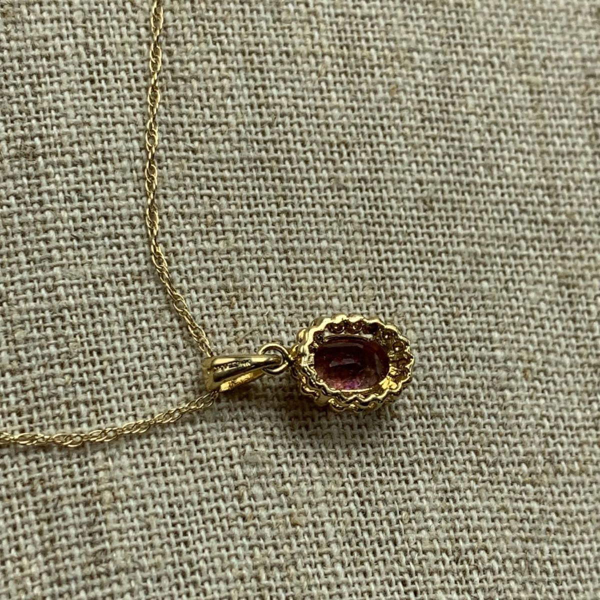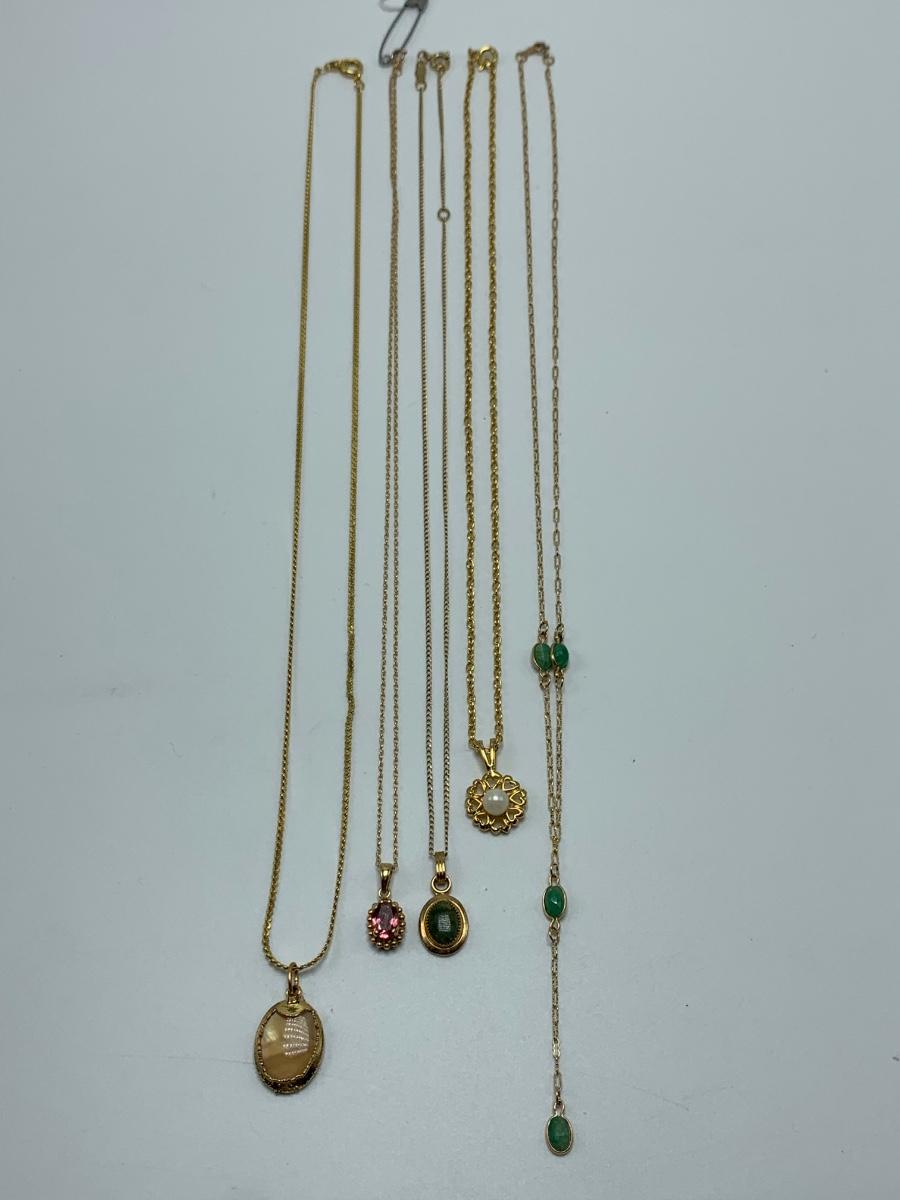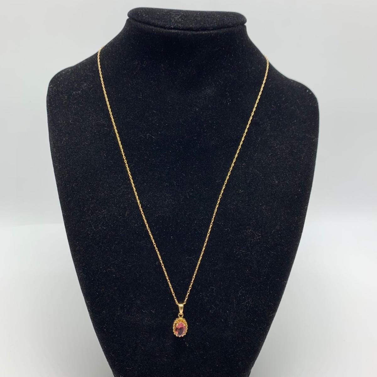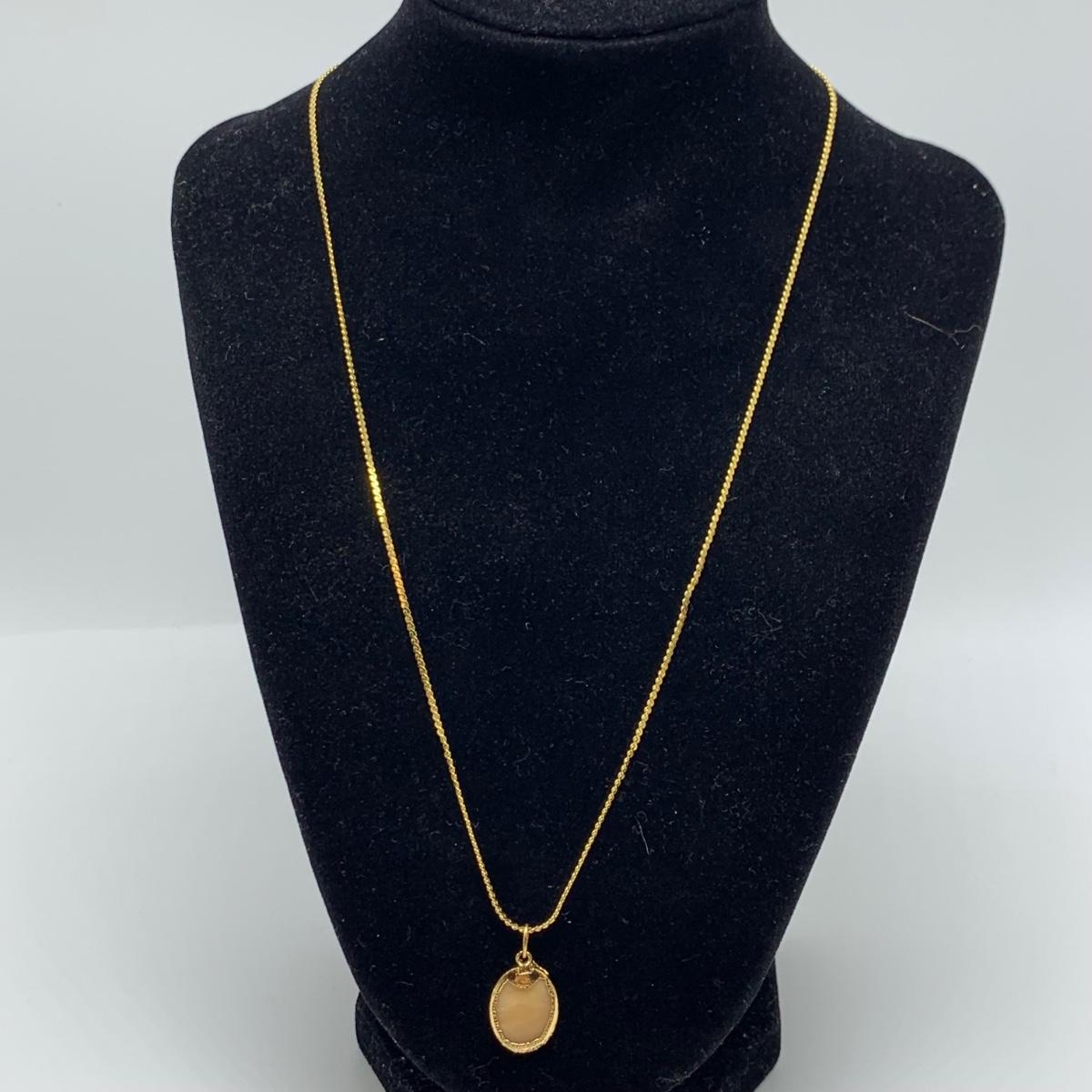 Five necklaces, four rings, a cuff bracelet, a pair of stud earrings, and a loose green gemstone. Longest necklace chain that has oval tan colored stone is 20”; it has no markings, nor does the necklace with the pearl-like bead. Necklace with pink colored gemstone and its pendant are marked “˜14K’. Chain with single green pendant is marked “˜Sarah Cov 1/20 12K’. Necklace with four green gemstones is marked “˜CID 10K’. The ring with the large yellow stone is marked 925, the one with pink stones is marked 10K, and the one with the white stone is marked “˜18K HGE’. This one shows wear to the band and does not appear to be solid 18K. Please see photos for all markings found. We cannot guarantee the authenticity of the gemstones.