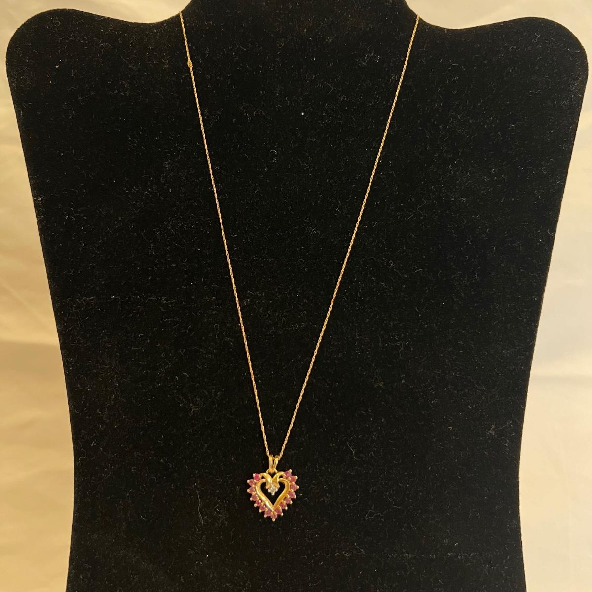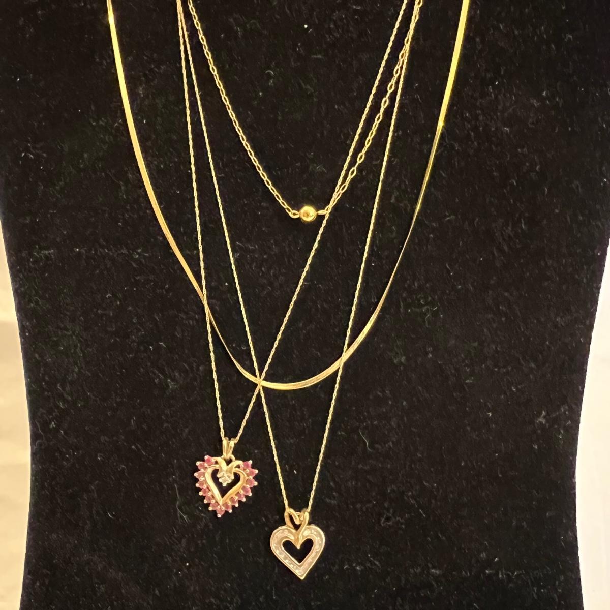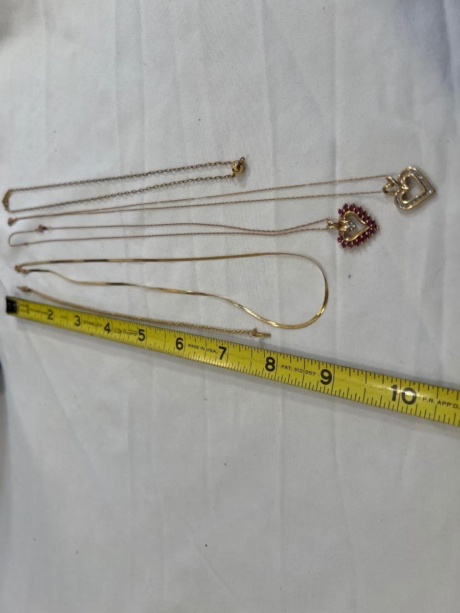 Four necklaces and one bracelet includes the following - 14K (one necklace & one bracelet), one necklace stamped '1/20 12K', and 10K (two necklaces with heart shaped pendants); both the pendants and their chains are marked 10K. Note the heart with ruby colored stones has a small knot in the chain which needs unknotting and the pendant has one diamond that tested as a real diamond. The other heart is comprised of multiple rhinestones. See images for all markings and sizes.