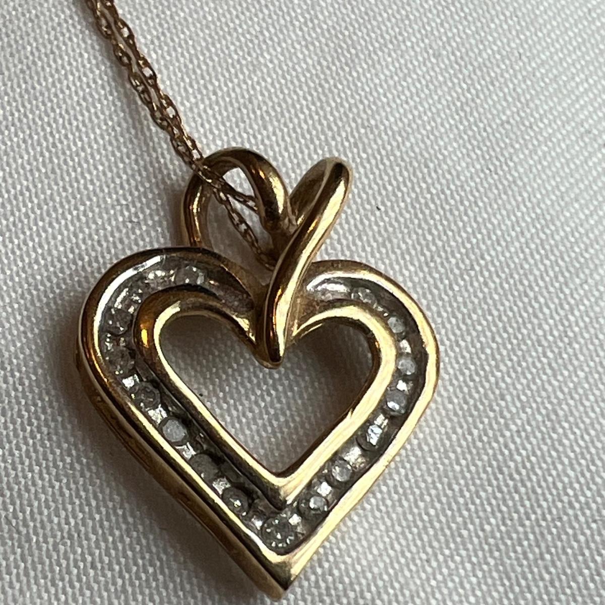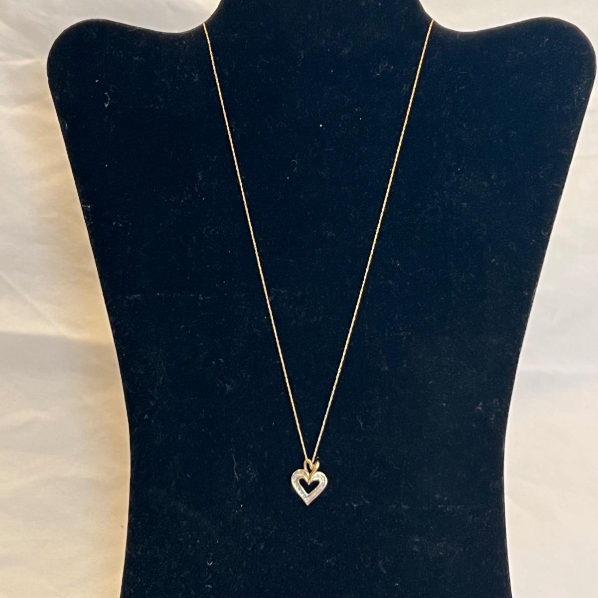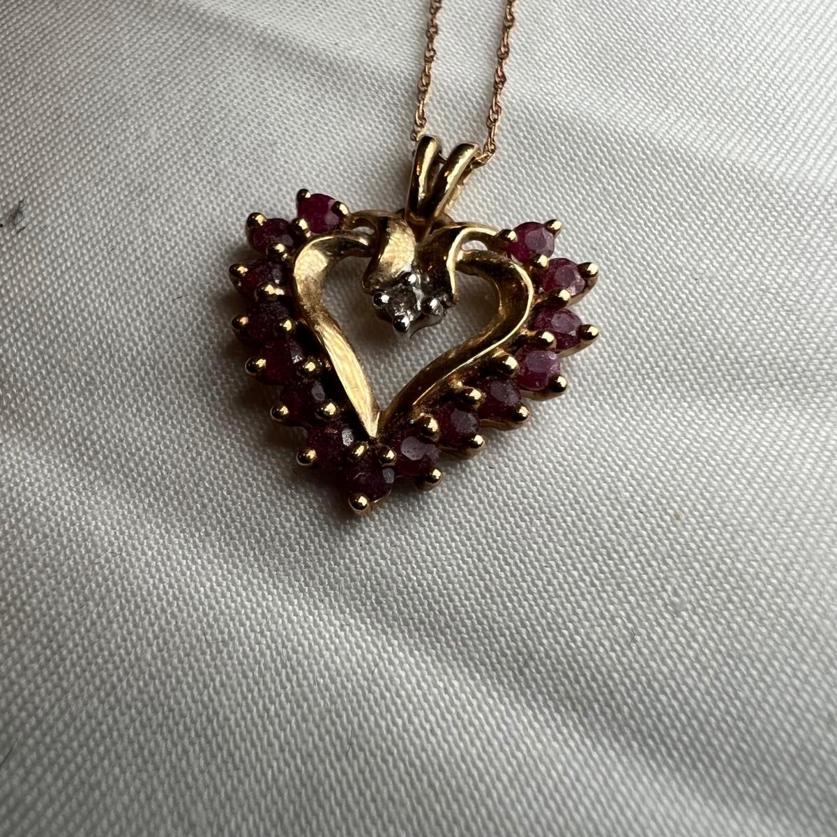 Four necklaces and one bracelet includes the following - 14K (one necklace & one bracelet), one necklace stamped '1/20 12K', and 10K (two necklaces with heart shaped pendants); both the pendants and their chains are marked 10K. Note the heart with ruby colored stones has a small knot in the chain which needs unknotting and the pendant has one diamond that tested as a real diamond. The other heart is comprised of multiple rhinestones. See images for all markings and sizes.