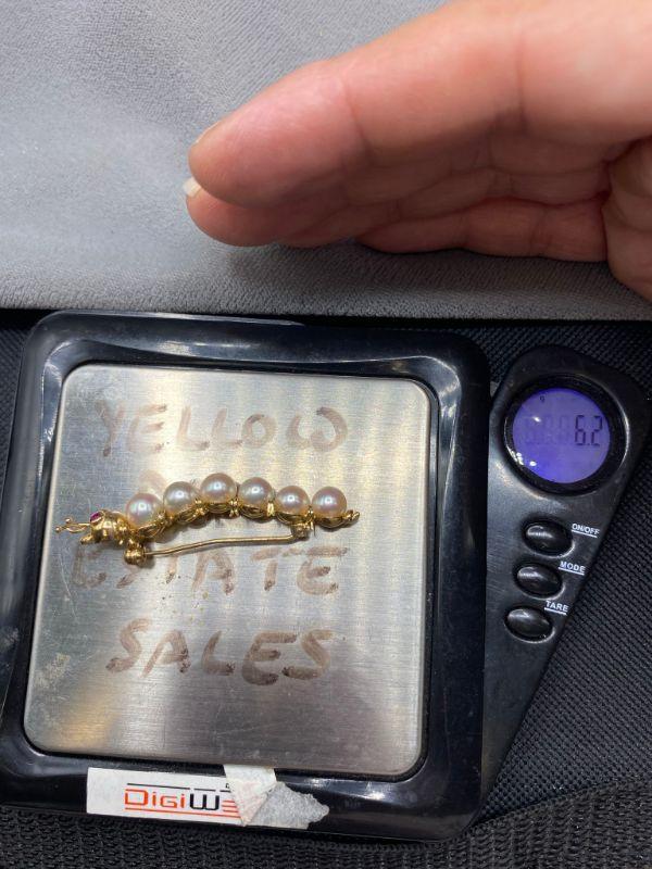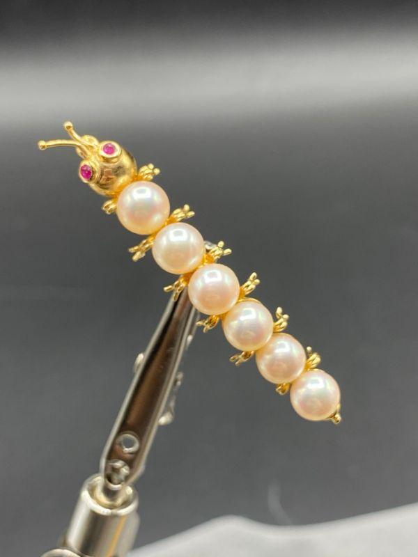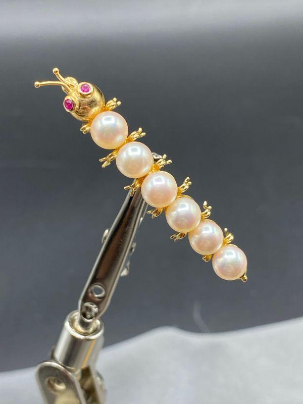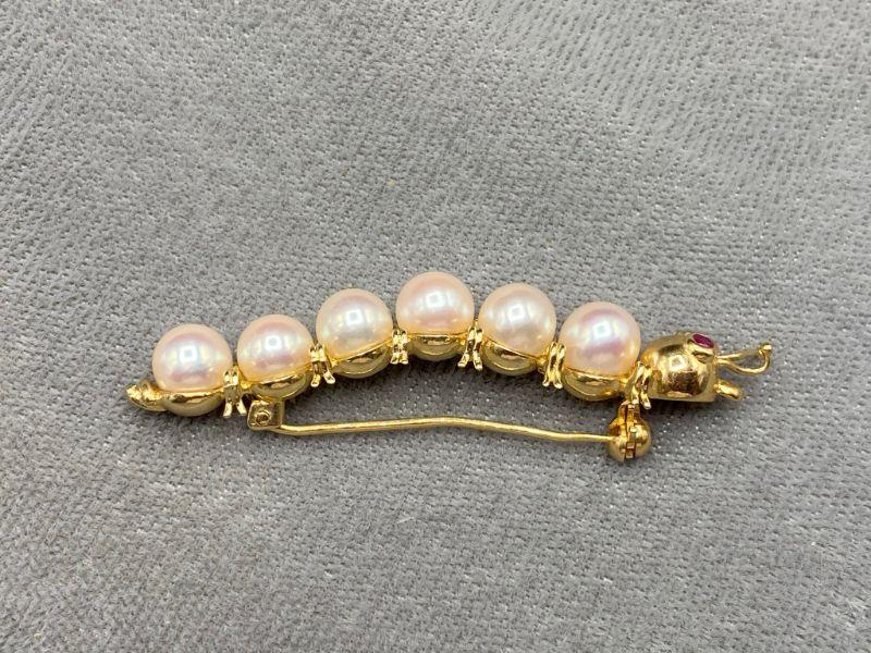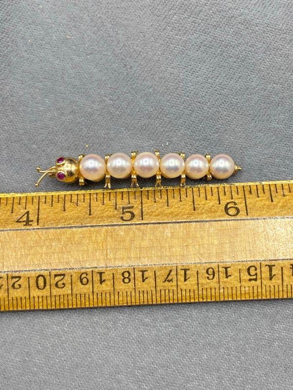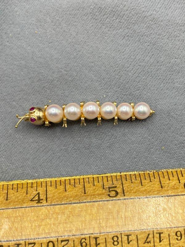 14k/585 yellow gold caterpillar brooch. Has pearls for body segments and what look like ruby eyes. Very cute. Marked on the underside.at the tail. About 2" length.