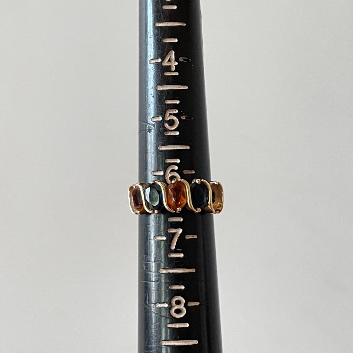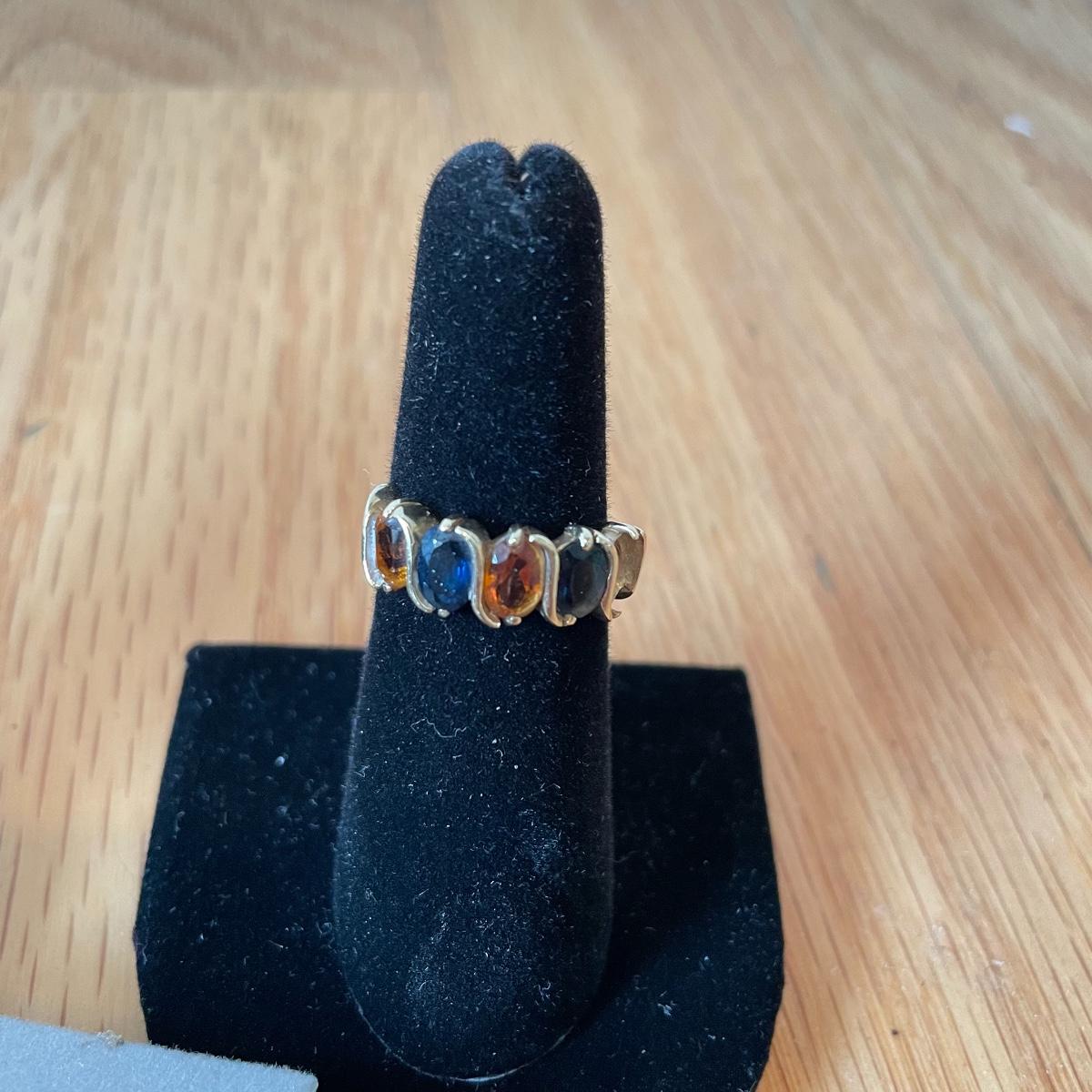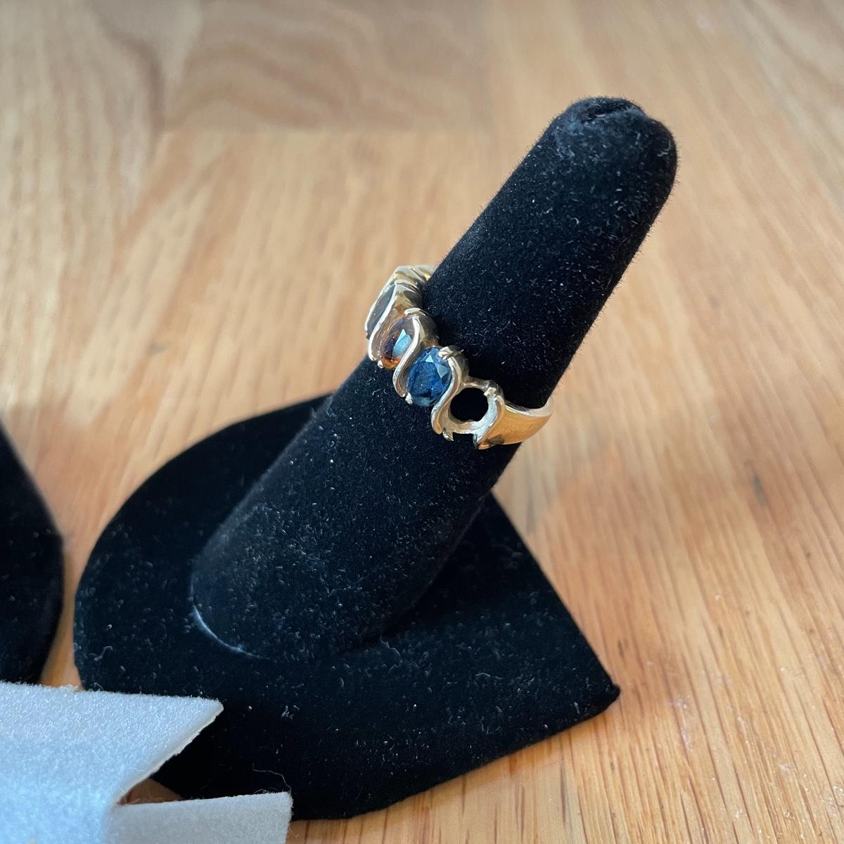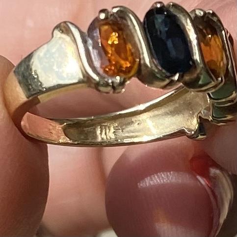 Midnight blue sapphire and amber colored stones in a 14k marked band. This ring is missing one stone. The other ring has cutouts and is marked 585. Lastly, a multicolored gold pendant marked 14k. See images. We have not verified any stone. Shipping available.