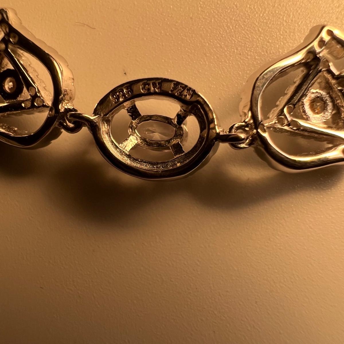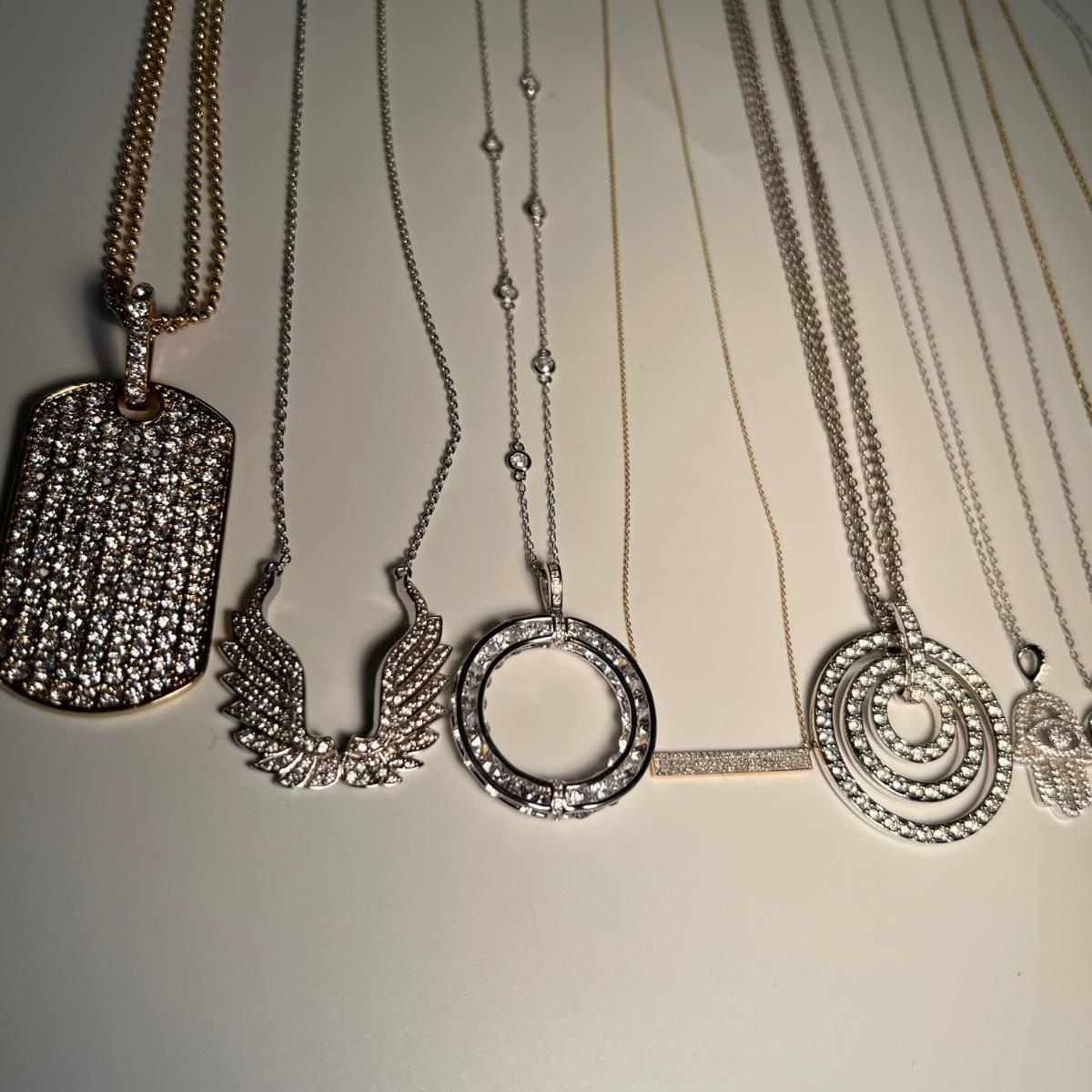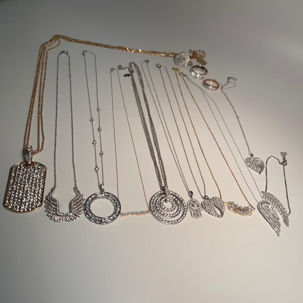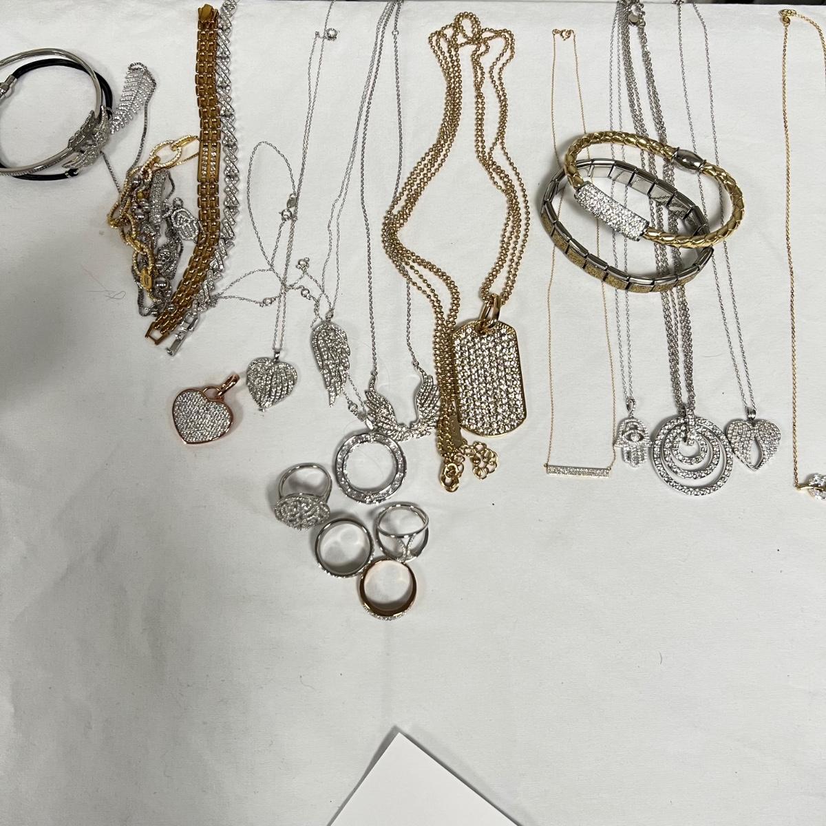 This eye catching assortment of necklaces, bracelets and rings includes 14K, 925, bronze and more. All stamps are shown in images when found - seven of the ten necklaces, six of eleven bracelets and three of four rings are marked 925. The bar shaped pendant is marked 14K and the chain is marked 585. All rings are size 9 except one which is shown in images on ring sizer. The heart shaped pendant is stamped Bronze, Made in Italy, it measures 1” x 1”. Dog tag necklace chain is 32” long and is the longest of all, shortest is the 14K necklace measuring 16”. Please see photos for all markings found. We cannot guarantee the authenticity of the gemstones.