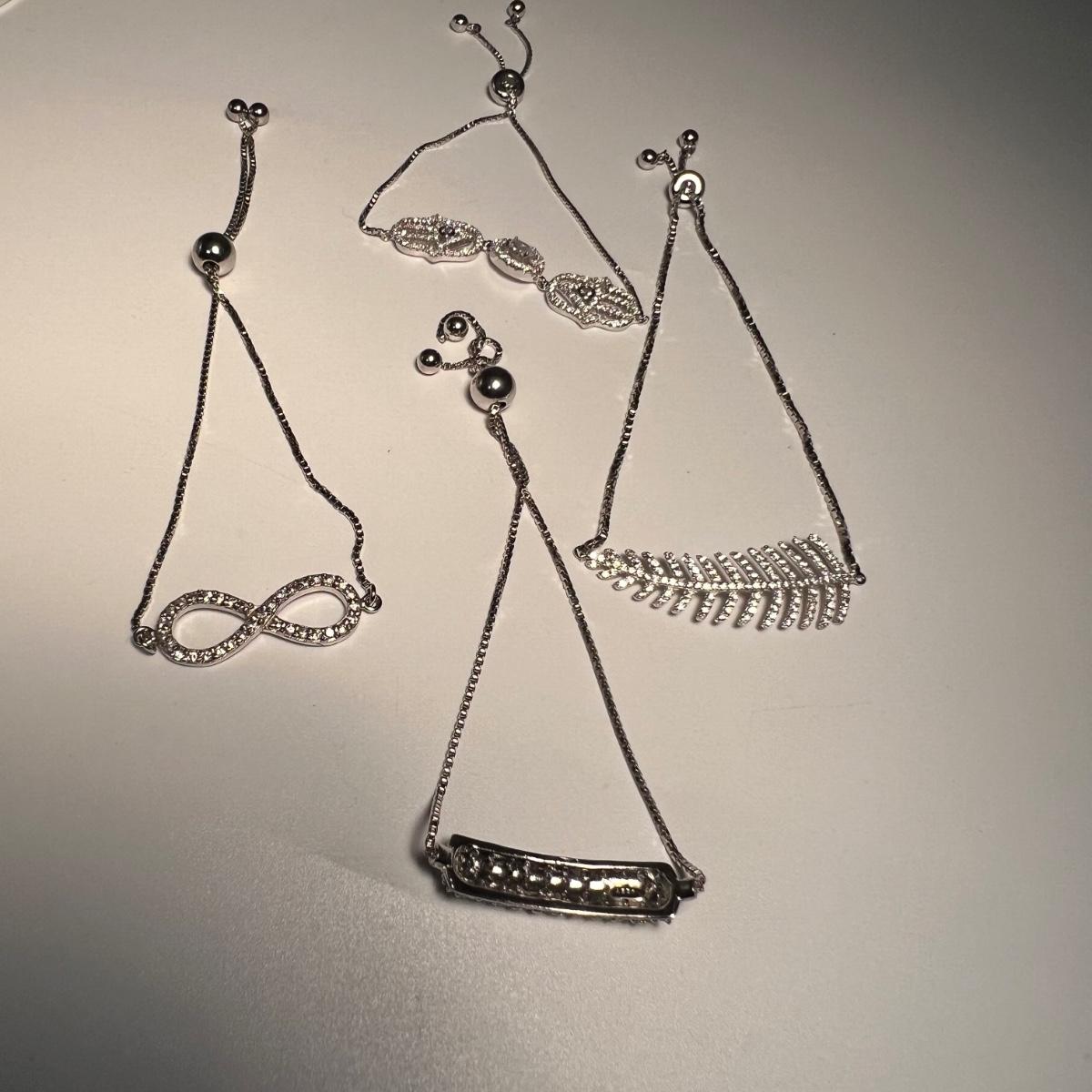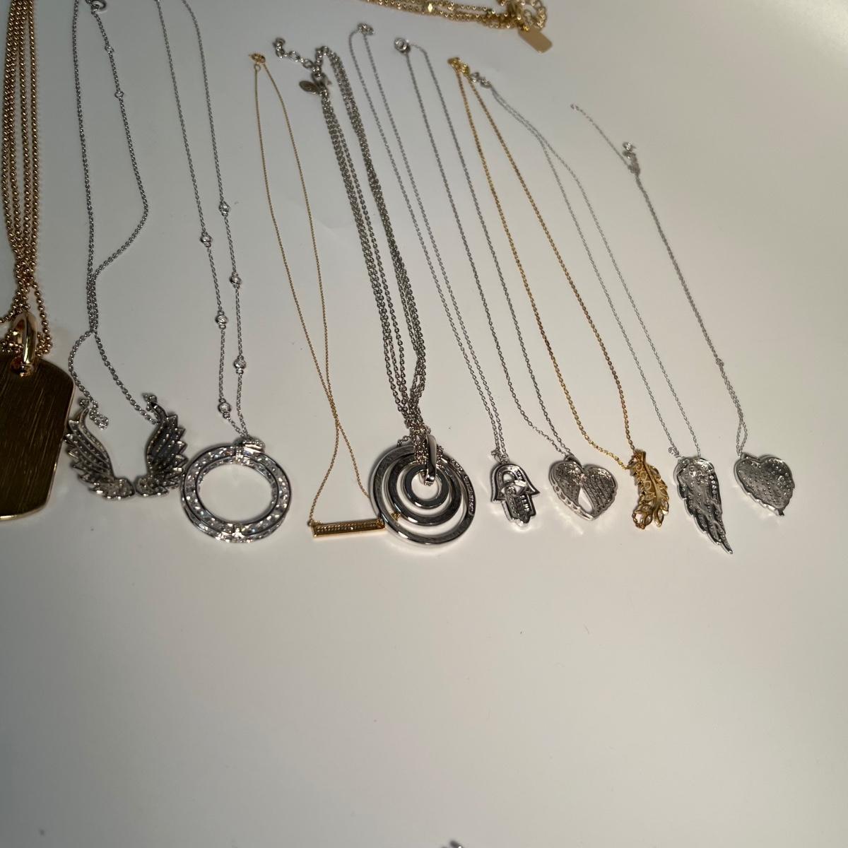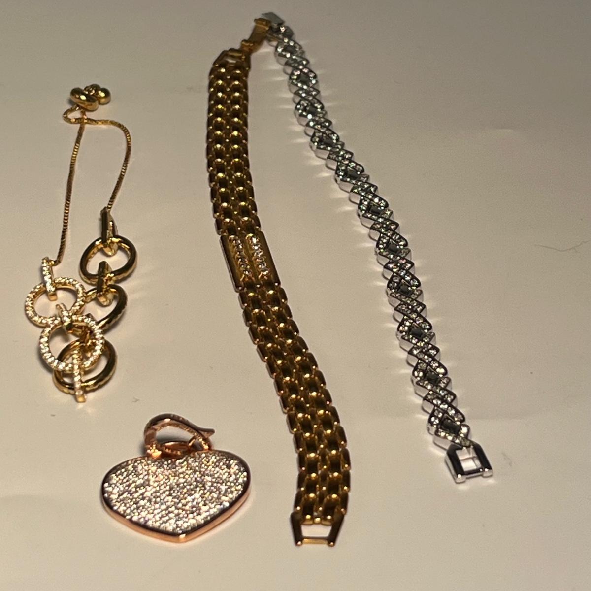 This eye catching assortment of necklaces, bracelets and rings includes 14K, 925, bronze and more. All stamps are shown in images when found - seven of the ten necklaces, six of eleven bracelets and three of four rings are marked 925. The bar shaped pendant is marked 14K and the chain is marked 585. All rings are size 9 except one which is shown in images on ring sizer. The heart shaped pendant is stamped Bronze, Made in Italy, it measures 1” x 1”. Dog tag necklace chain is 32” long and is the longest of all, shortest is the 14K necklace measuring 16”. Please see photos for all markings found. We cannot guarantee the authenticity of the gemstones.