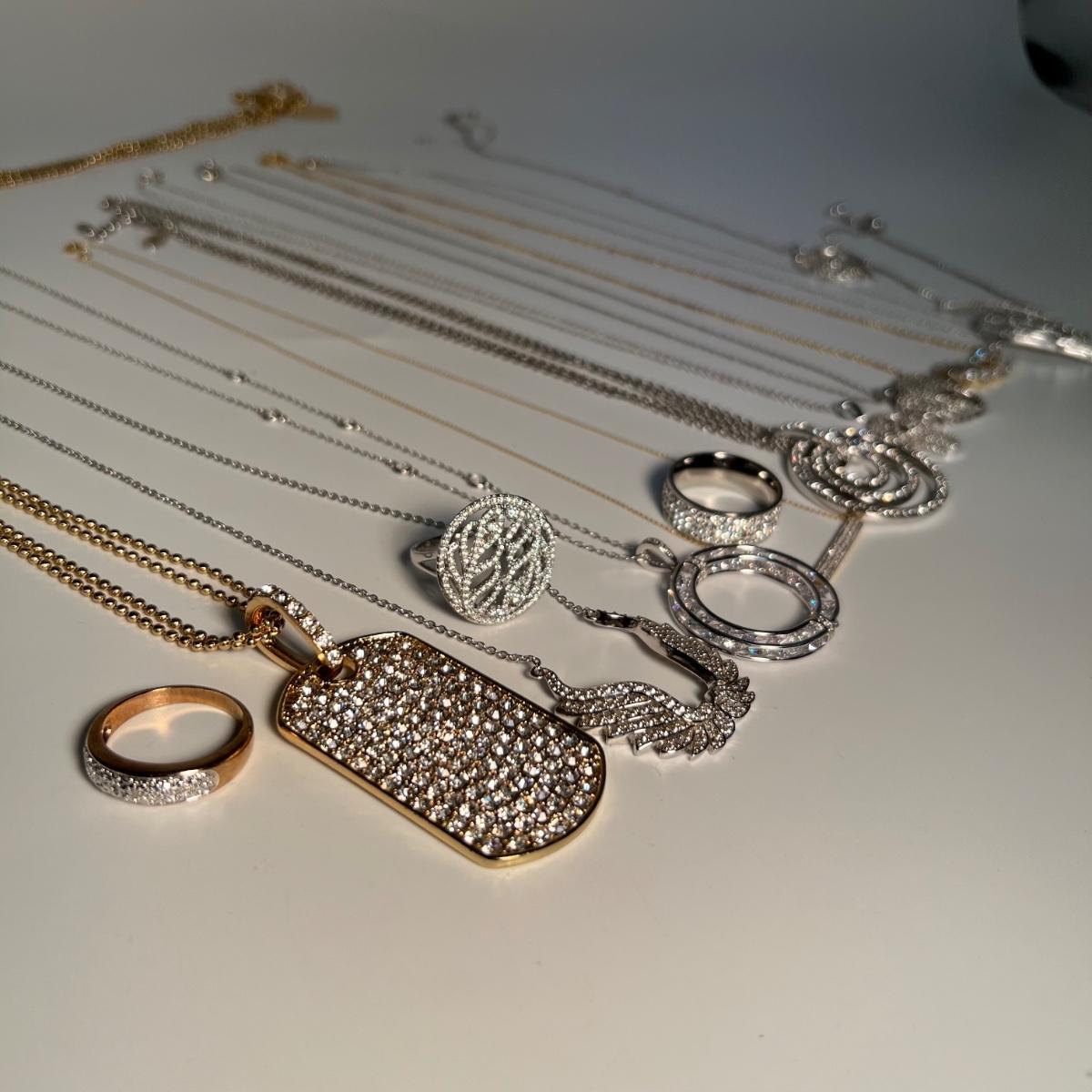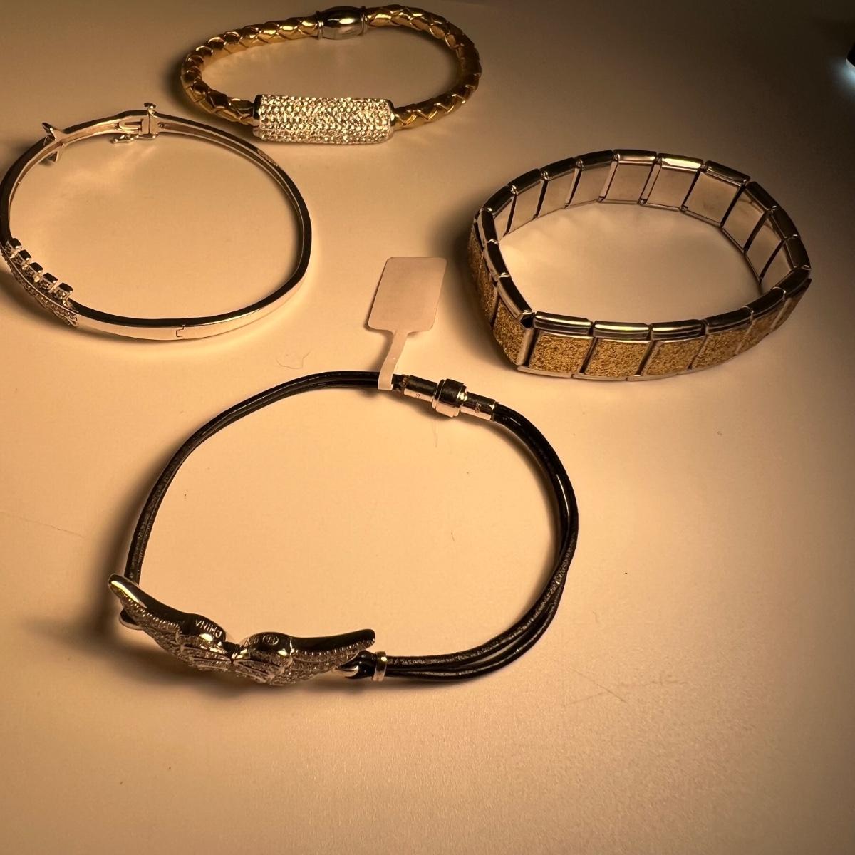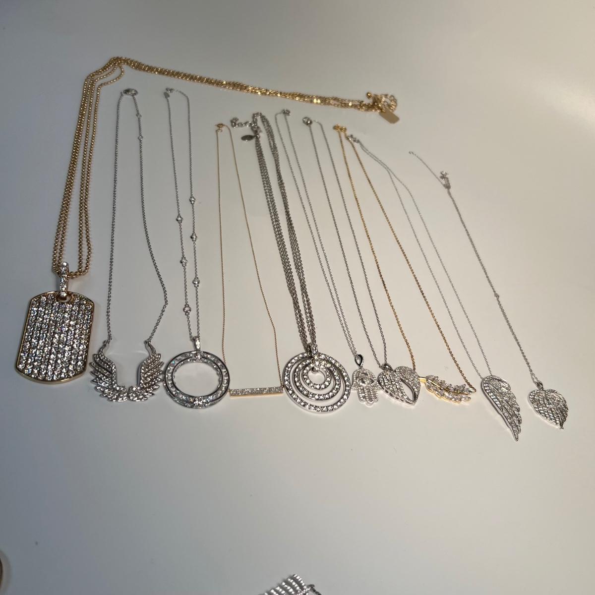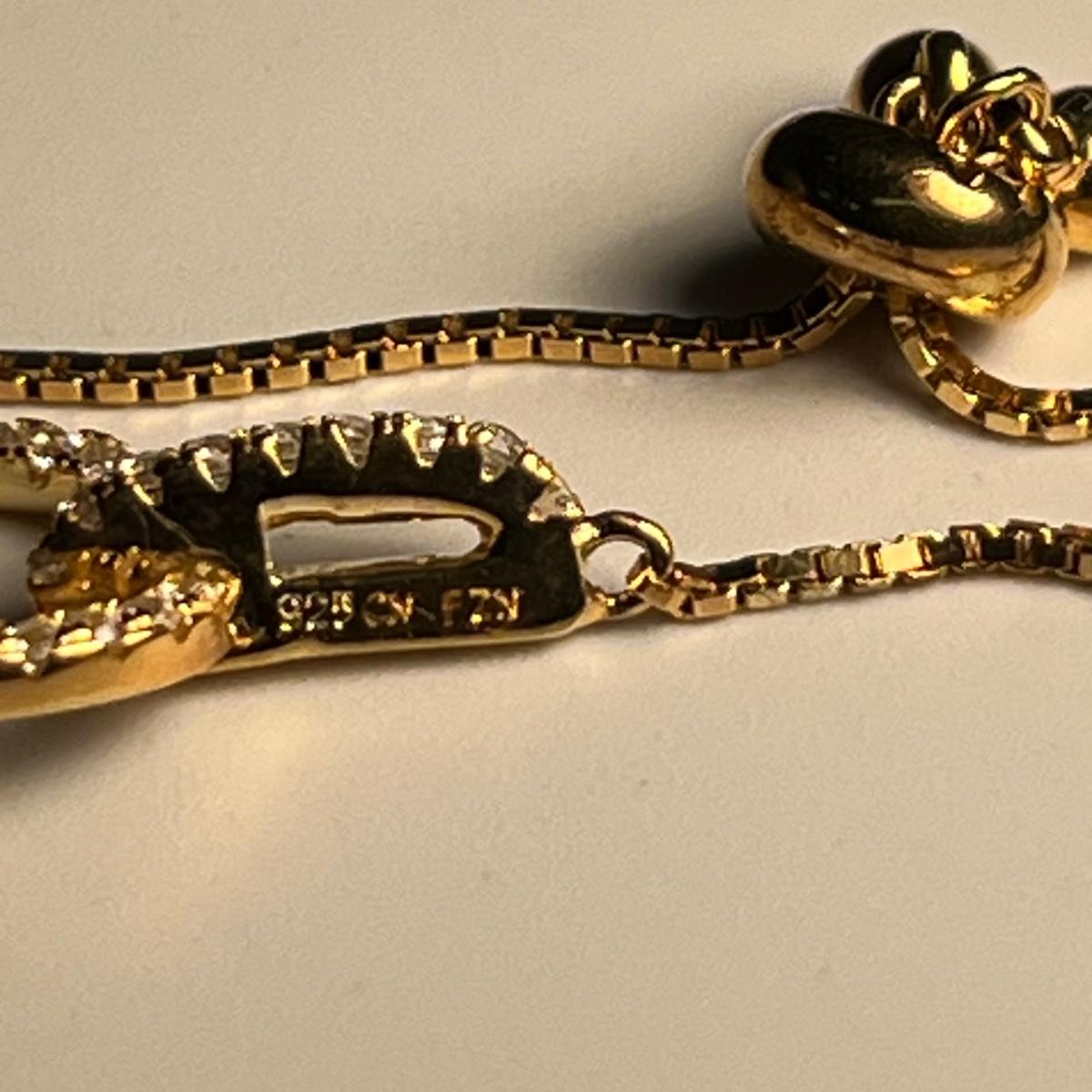 This eye catching assortment of necklaces, bracelets and rings includes 14K, 925, bronze and more. All stamps are shown in images when found - seven of the ten necklaces, six of eleven bracelets and three of four rings are marked 925. The bar shaped pendant is marked 14K and the chain is marked 585. All rings are size 9 except one which is shown in images on ring sizer. The heart shaped pendant is stamped Bronze, Made in Italy, it measures 1” x 1”. Dog tag necklace chain is 32” long and is the longest of all, shortest is the 14K necklace measuring 16”. Please see photos for all markings found. We cannot guarantee the authenticity of the gemstones.