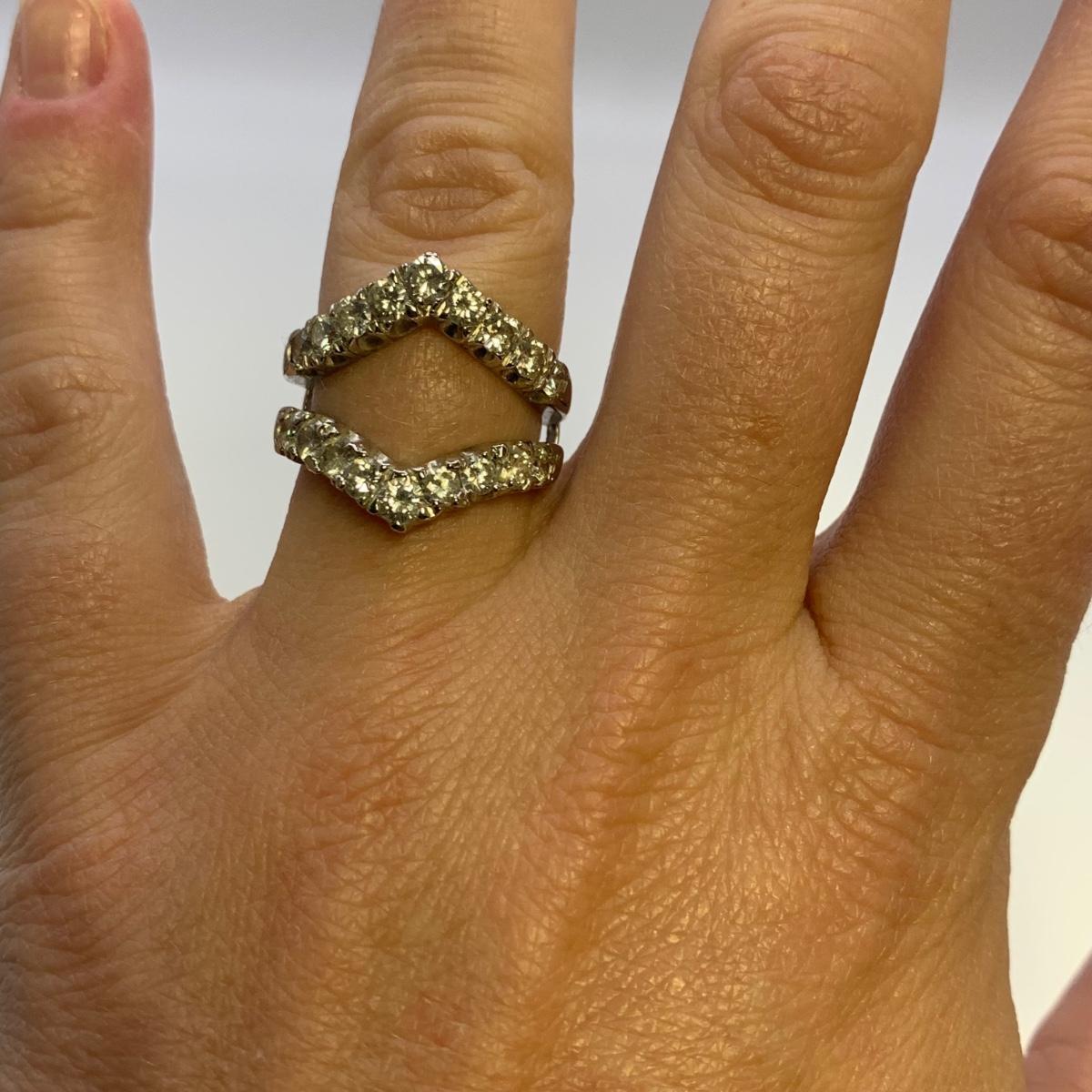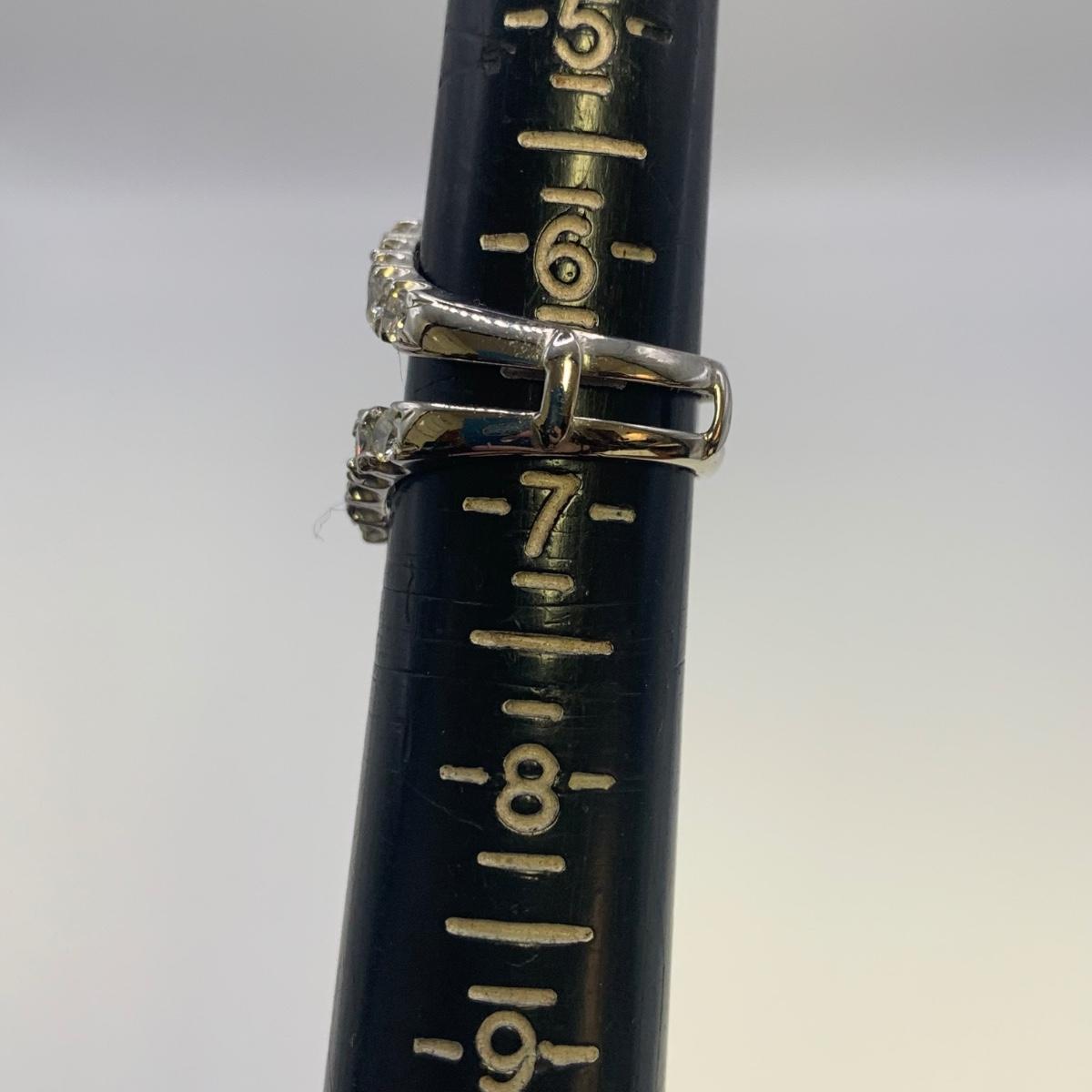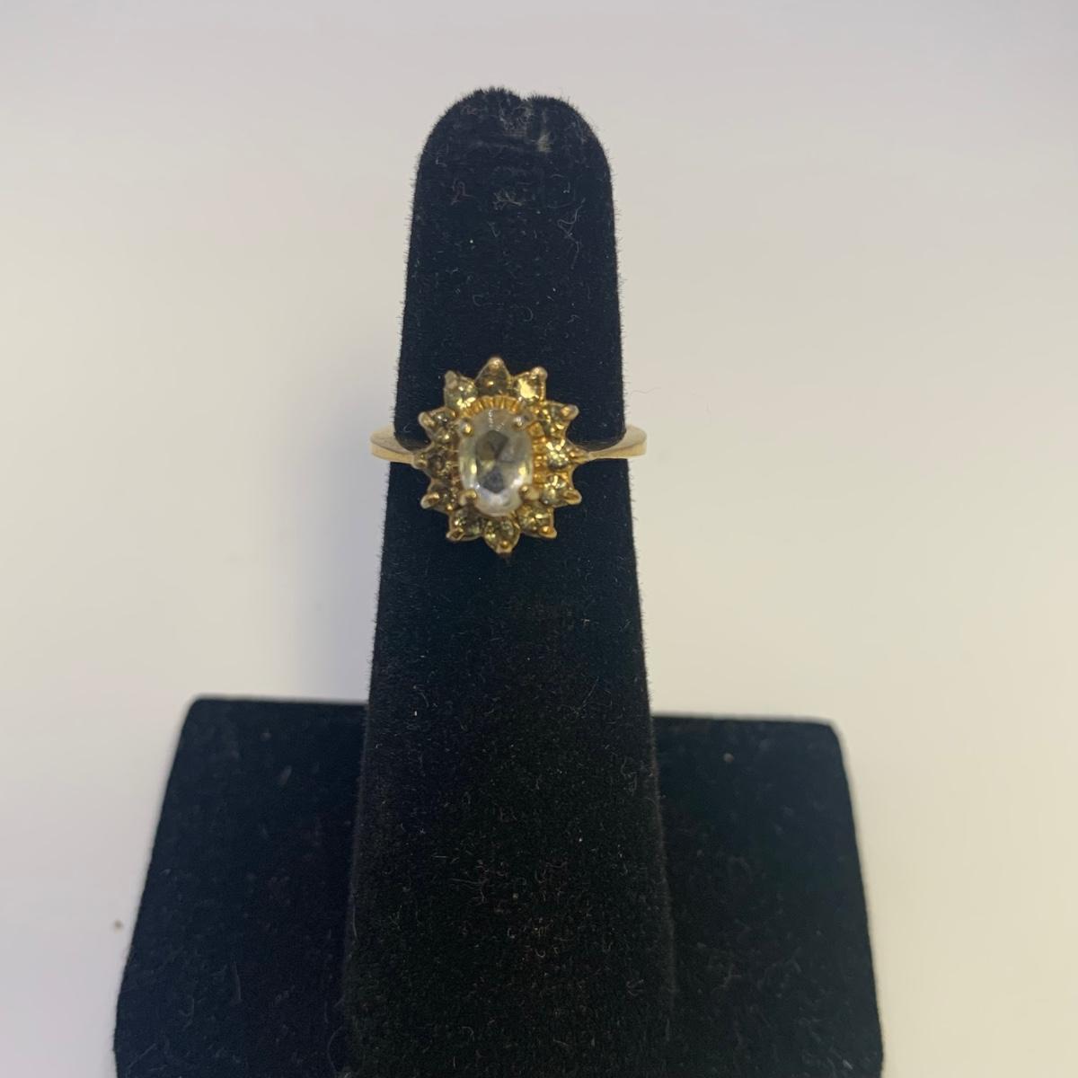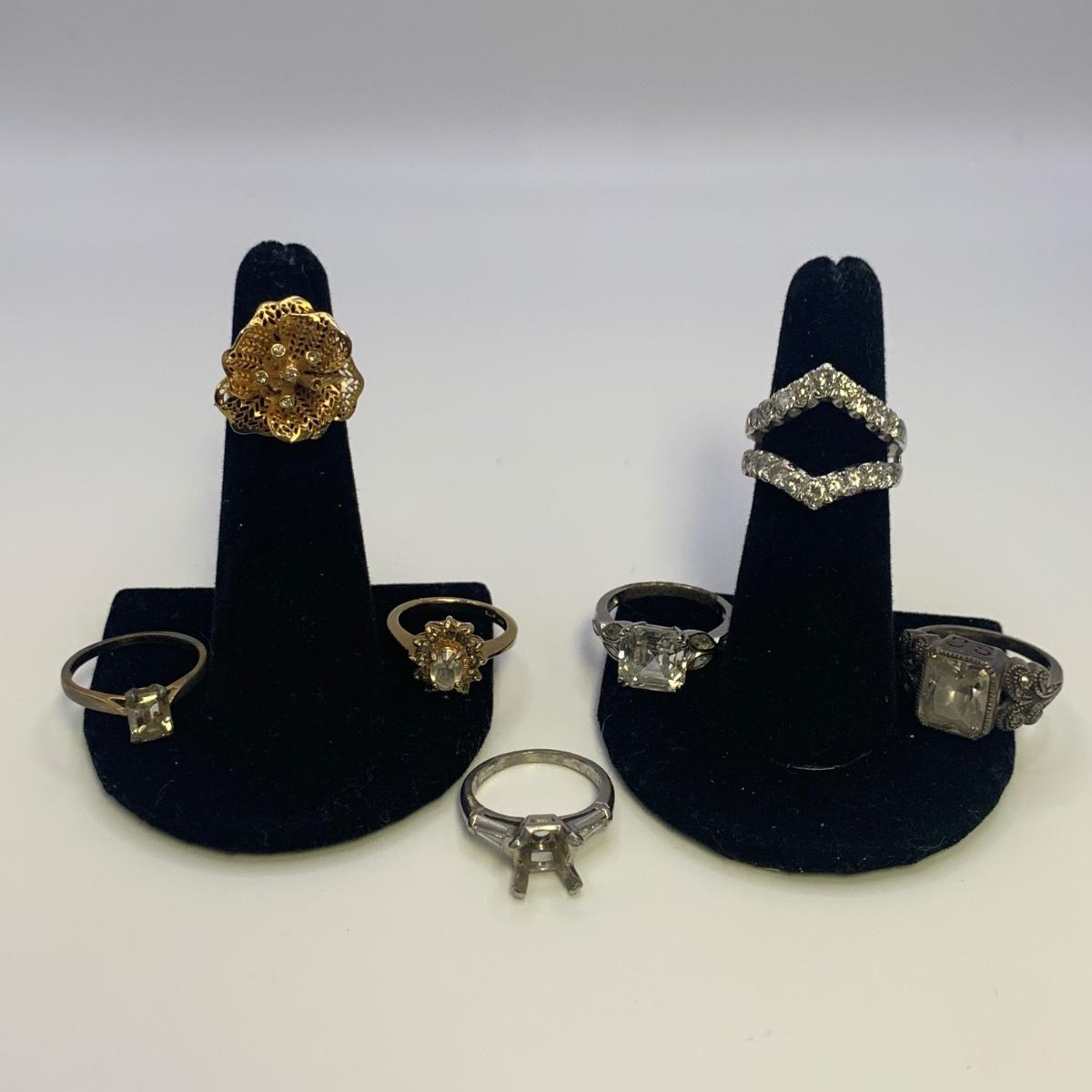 A variety of seven rings. All have clear sparkling gemstones. The gold flower is stamped ‘PSP 14K’. It is missing one small gemstone. The ring enhancer ring with the two bands is marked ‘14K’. One ring that fits perfectly inside the ring enhancer is missing its main stone. It was two gemstones in the band that both tested positive as diamonds with our diamond tester. Its band has hallmarks stamped but they are illegible. Please see photos for hallmarks on the other rings and all sizes. One is marked 925, others are illegible.