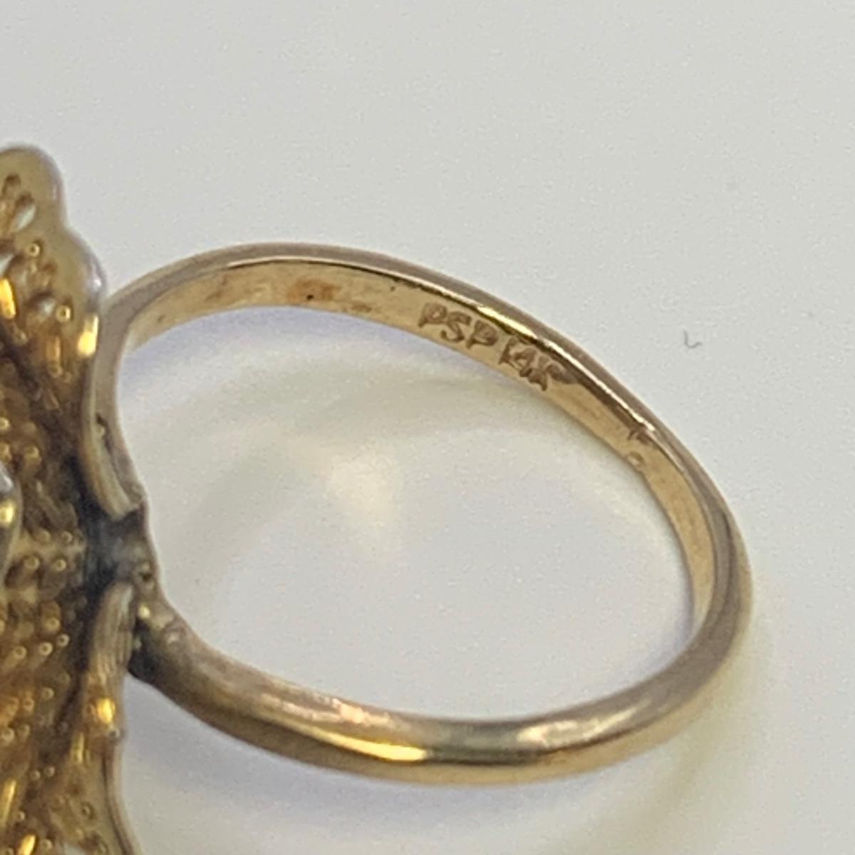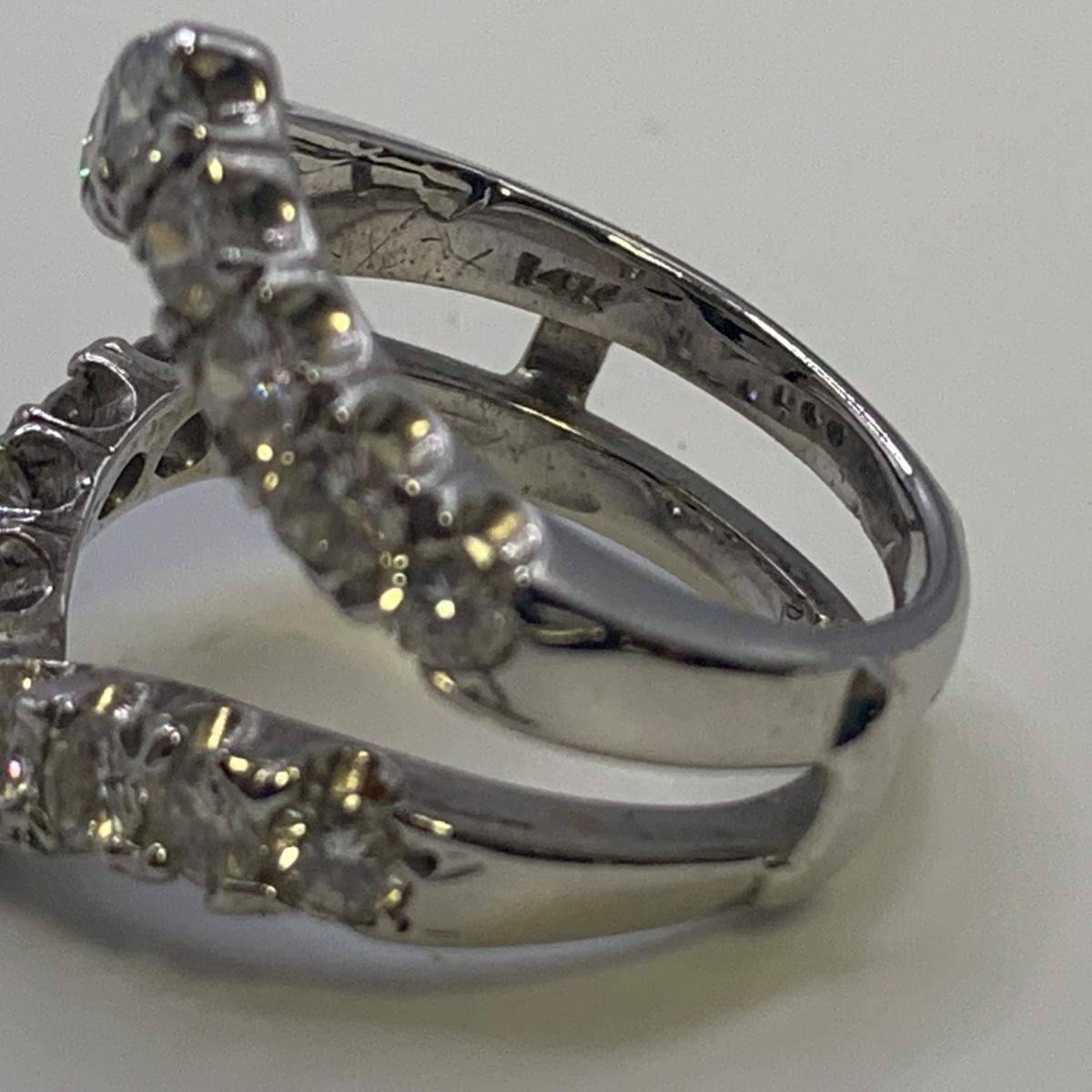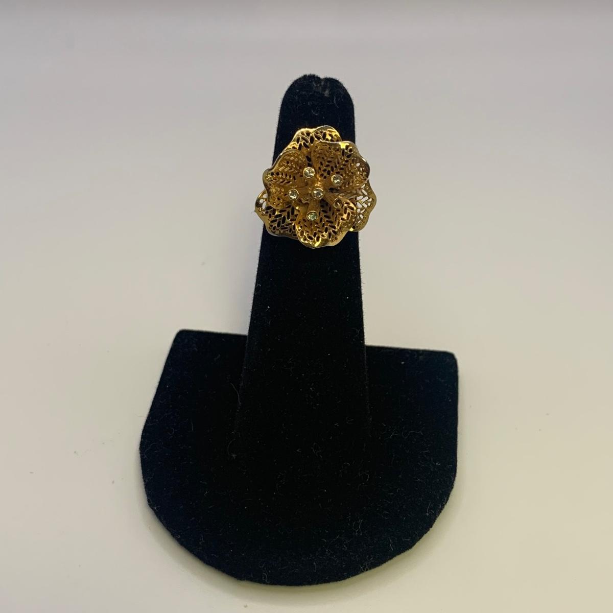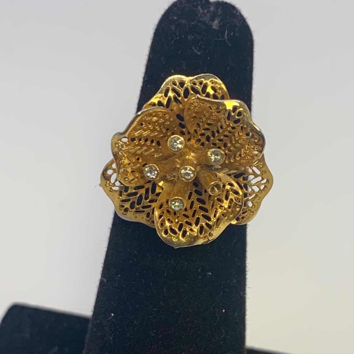 A variety of seven rings. All have clear sparkling gemstones. The gold flower is stamped ‘PSP 14K’. It is missing one small gemstone. The ring enhancer ring with the two bands is marked ‘14K’. One ring that fits perfectly inside the ring enhancer is missing its main stone. It was two gemstones in the band that both tested positive as diamonds with our diamond tester. Its band has hallmarks stamped but they are illegible. Please see photos for hallmarks on the other rings and all sizes. One is marked 925, others are illegible.