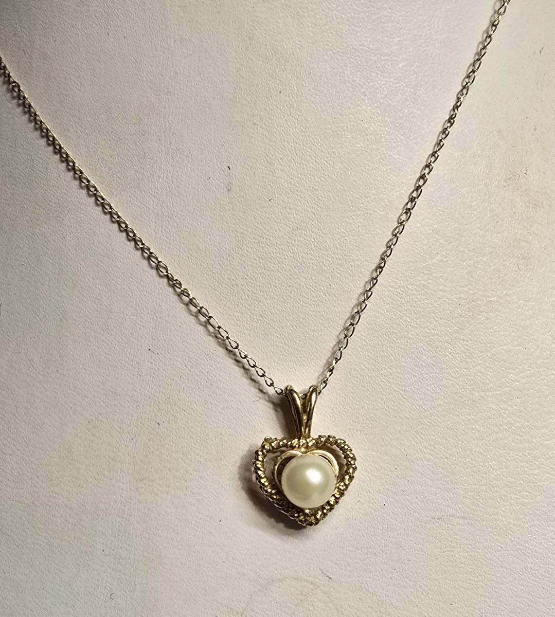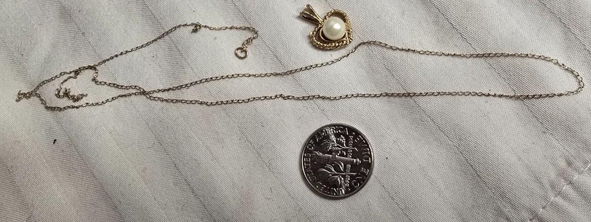 marked 14K pendant, with cultured pearl, chain is 14K, but it is broken. Weighs 1.7 grams. Dime pictured for size reference, not included in the sale