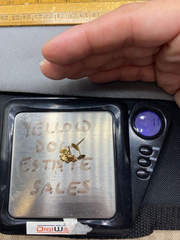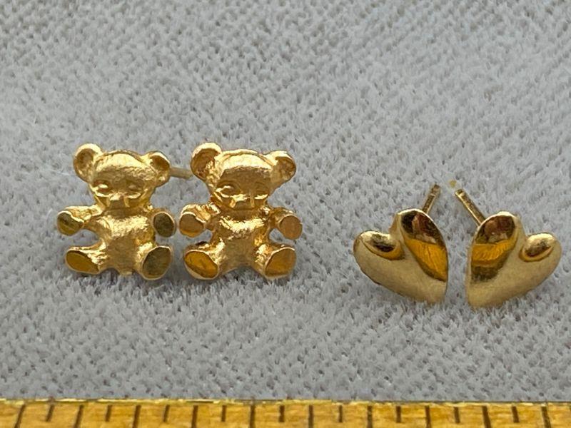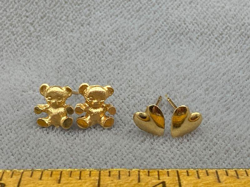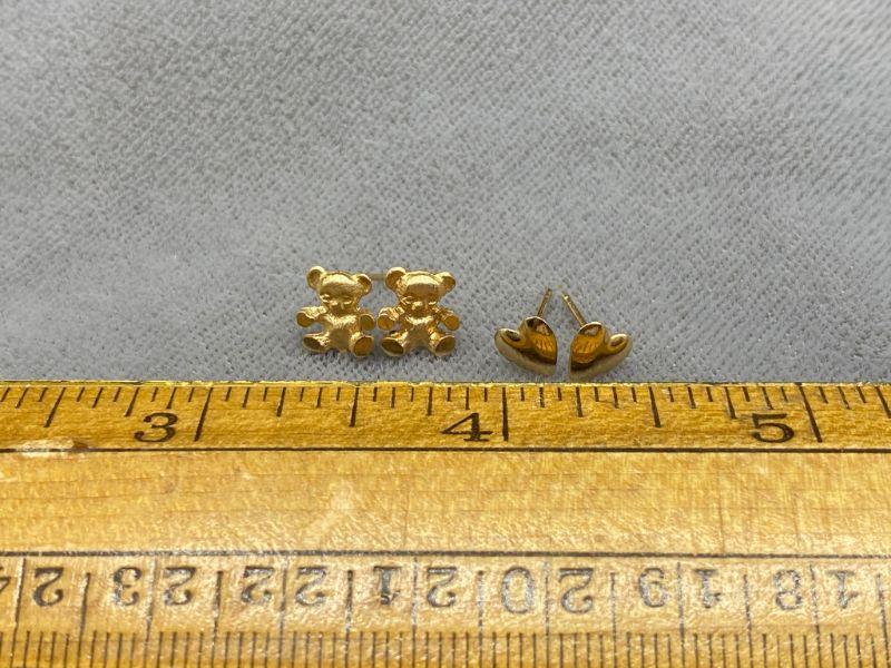 Two pairs of 14k earrings. Dainty little hearts and teddy bears. Stamped on the posts. Unfortunately these do not have earring backs. Really small, under 1/4". 1.1g t.w.