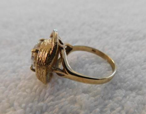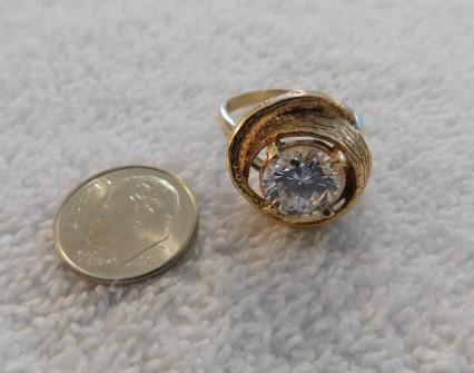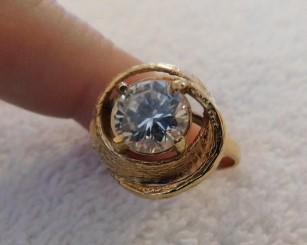14K Designer Gold Ring with Round Moissanite Diamond in 4 Prong Setting 7g Total. This ring is uncertified diamond. Our knowledge of this ring is based on description from third party. The diamond is extremely brilliant and reflects light as moissanite would. No scratches on surface were detected under loop.