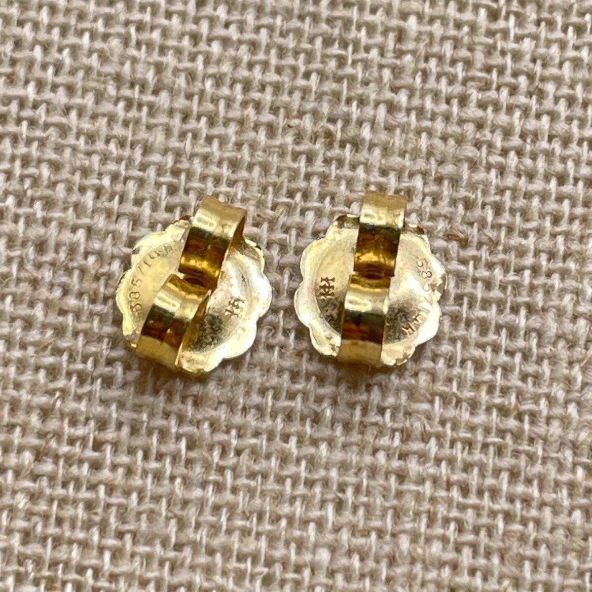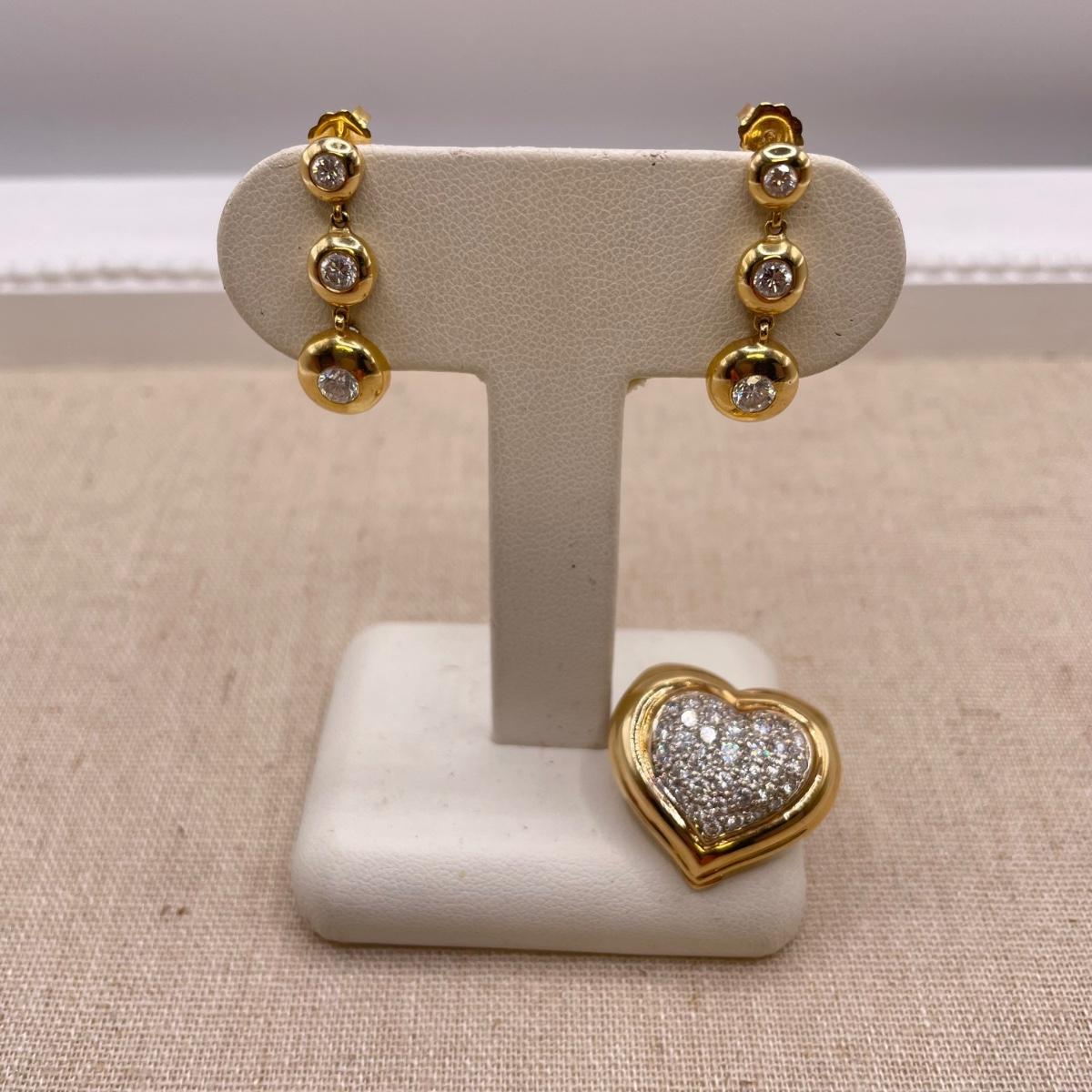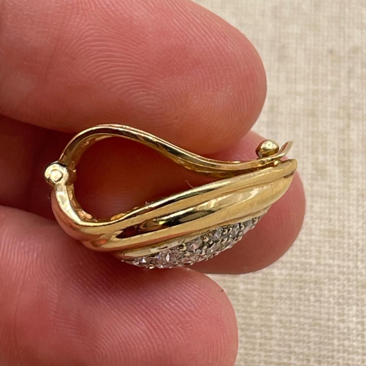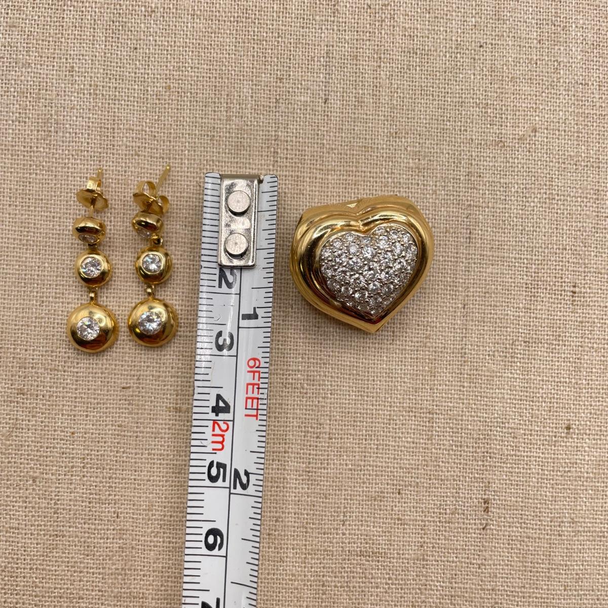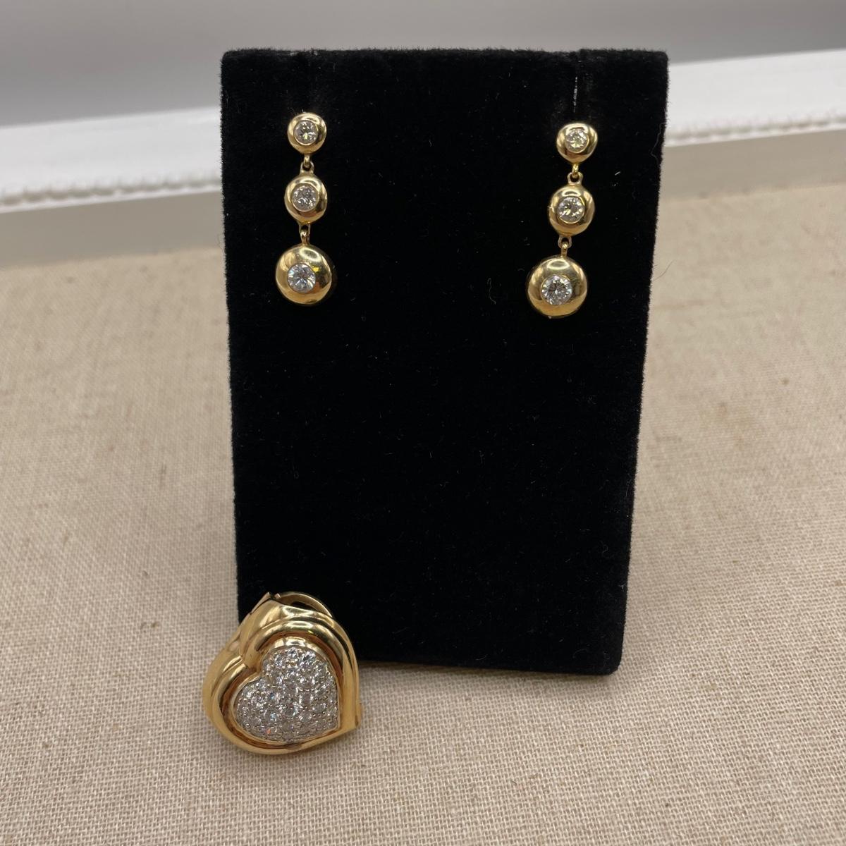 A pair of earrings with three gems registered as diamonds on our tester and 14K plus an infinity symbol found on the posts, these markings were difficult to photograph. The backs also have a brand mark, and 585/14K markings. Lot also features an unmarked brooch with gems that registered as diamonds and metal that registered as 14K gold on our testers. All pieces are close to 1” in length. The gold on the brooch has a small smudge in the lower left side near the diamonds. See images. Shipping available. All sales are final. No returns or refunds. Please bid accordingly.