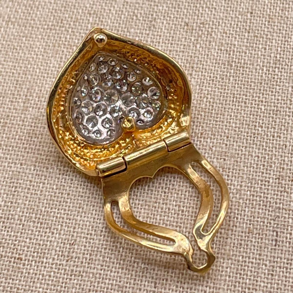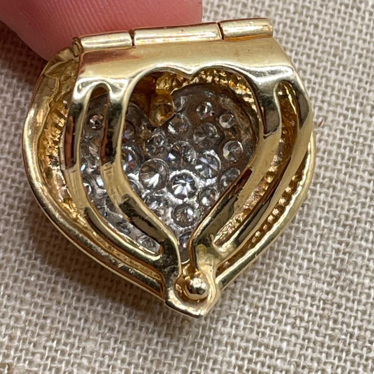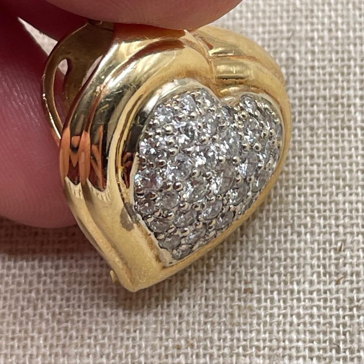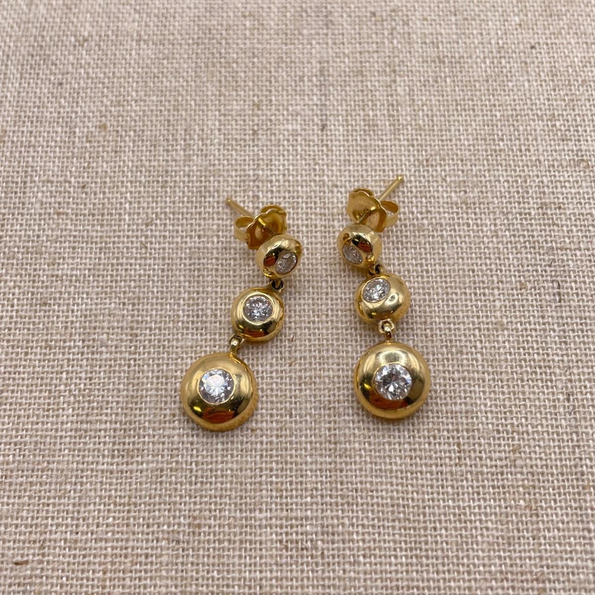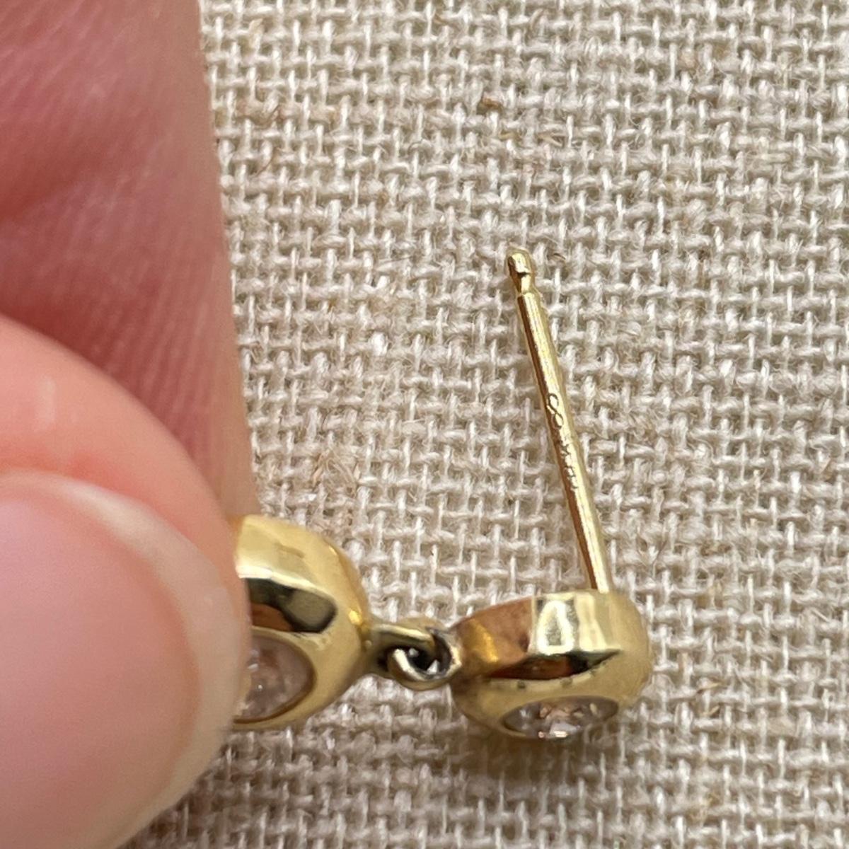 A pair of earrings with three gems registered as diamonds on our tester and 14K plus an infinity symbol found on the posts, these markings were difficult to photograph. The backs also have a brand mark, and 585/14K markings. Lot also features an unmarked brooch with gems that registered as diamonds and metal that registered as 14K gold on our testers. All pieces are close to 1” in length. The gold on the brooch has a small smudge in the lower left side near the diamonds. See images. Shipping available. All sales are final. No returns or refunds. Please bid accordingly.