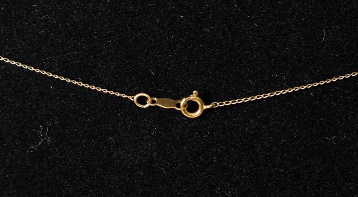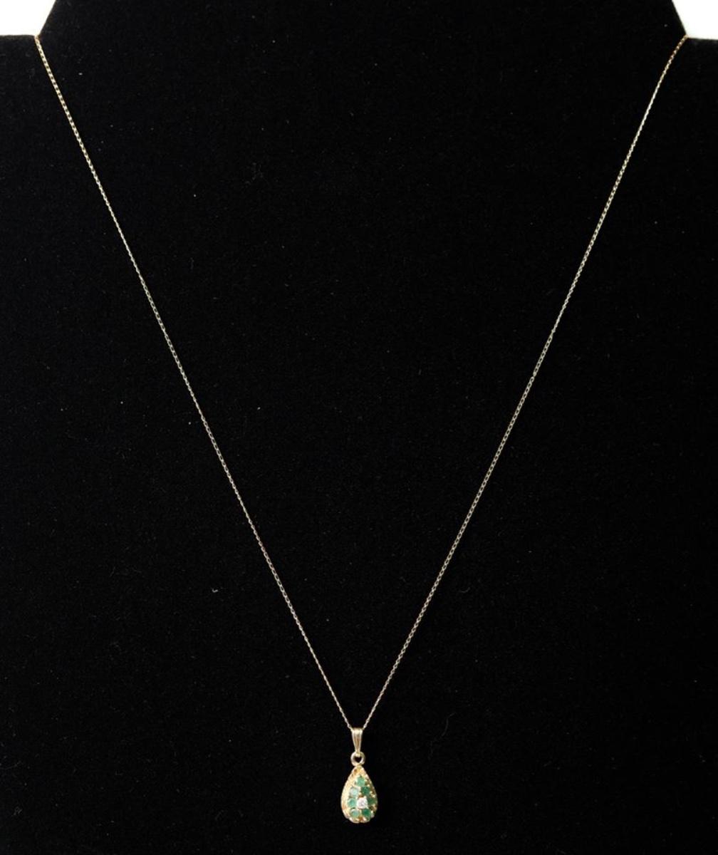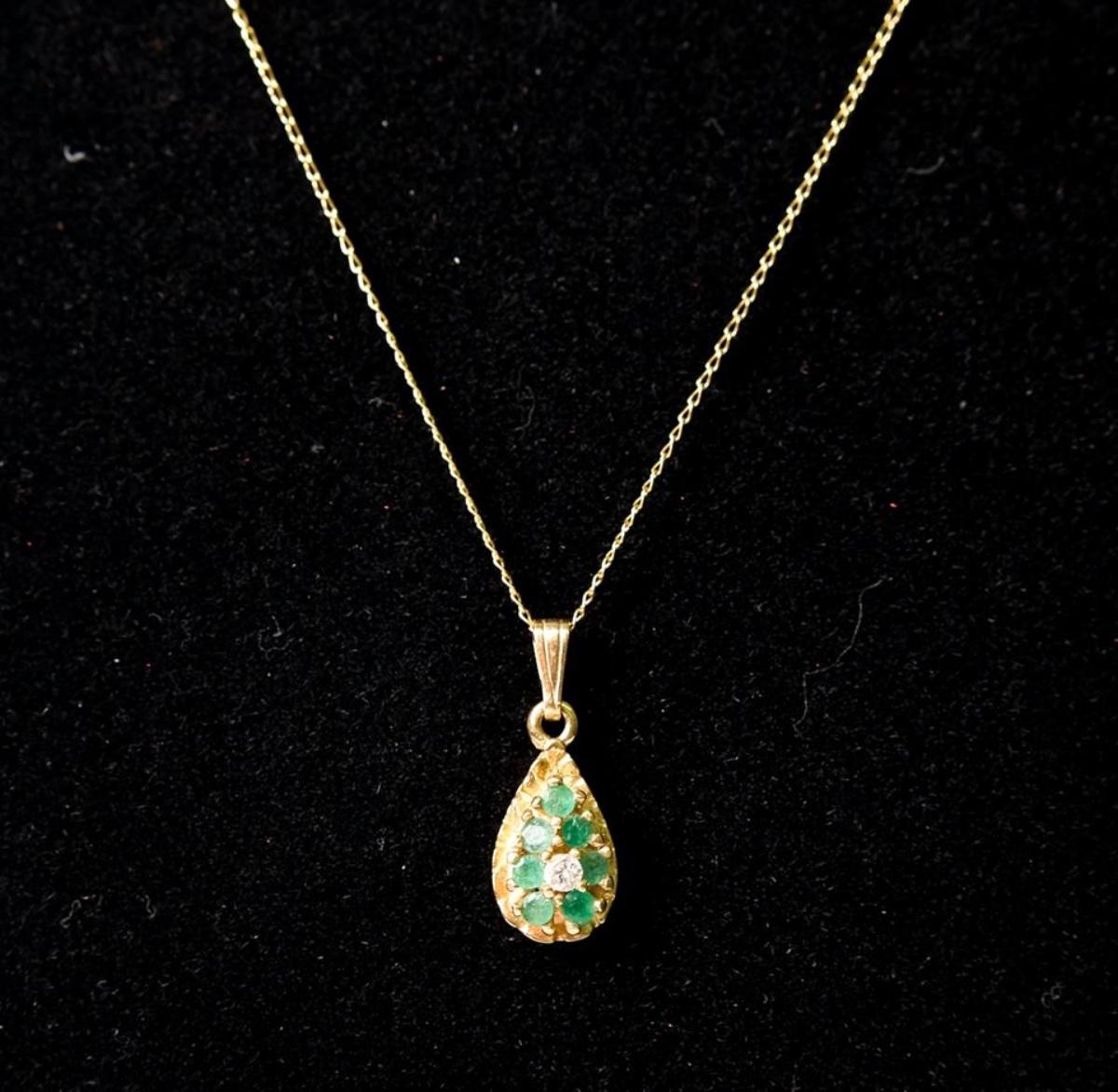 Testing as diamond & emeralds. Pendant stamped 14k, chain stamped 14k. Pendant measures approx. 3/4"(with bale), chain 18". Approx. combined weight 1.6g.