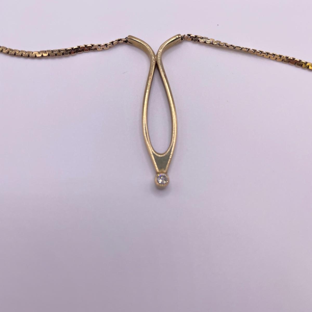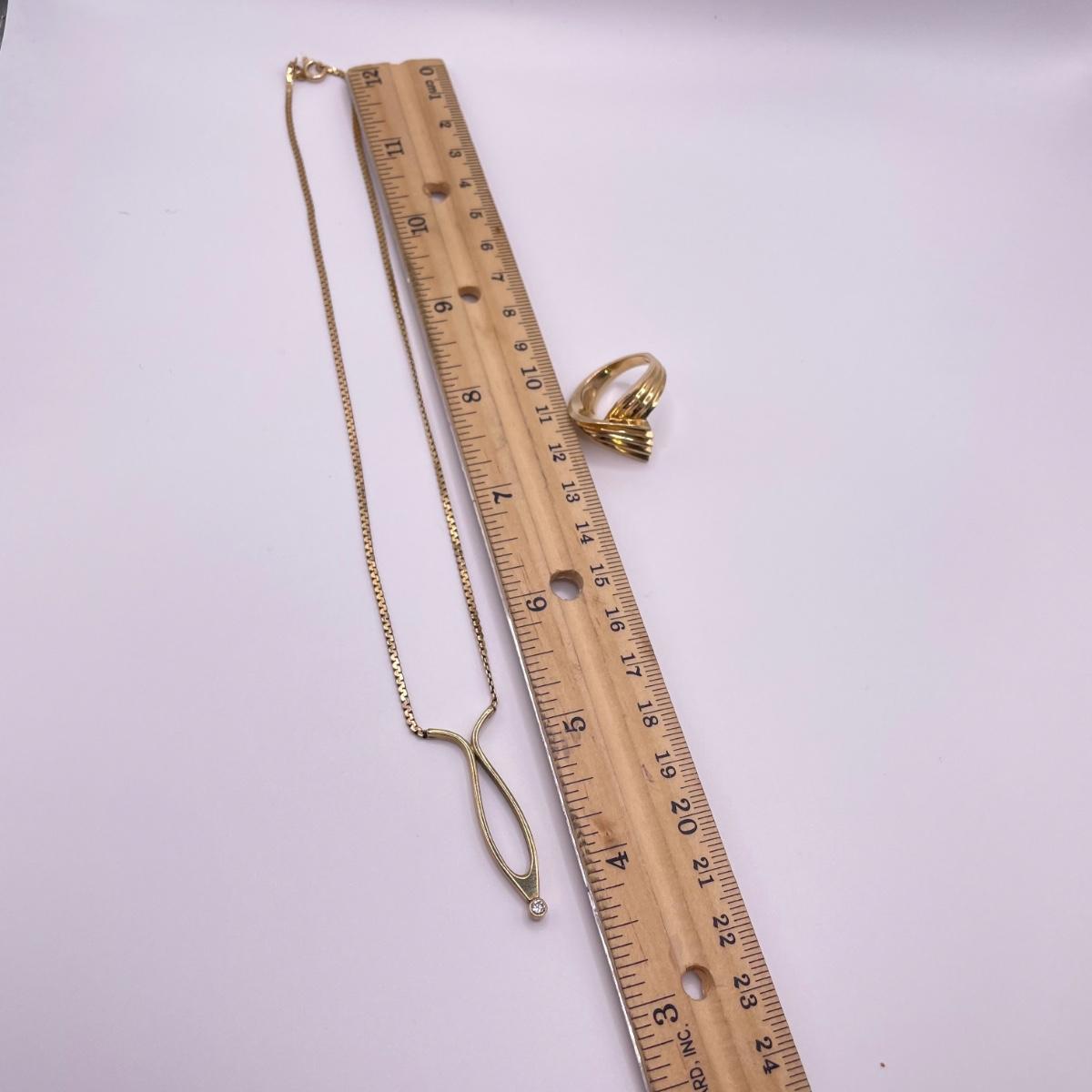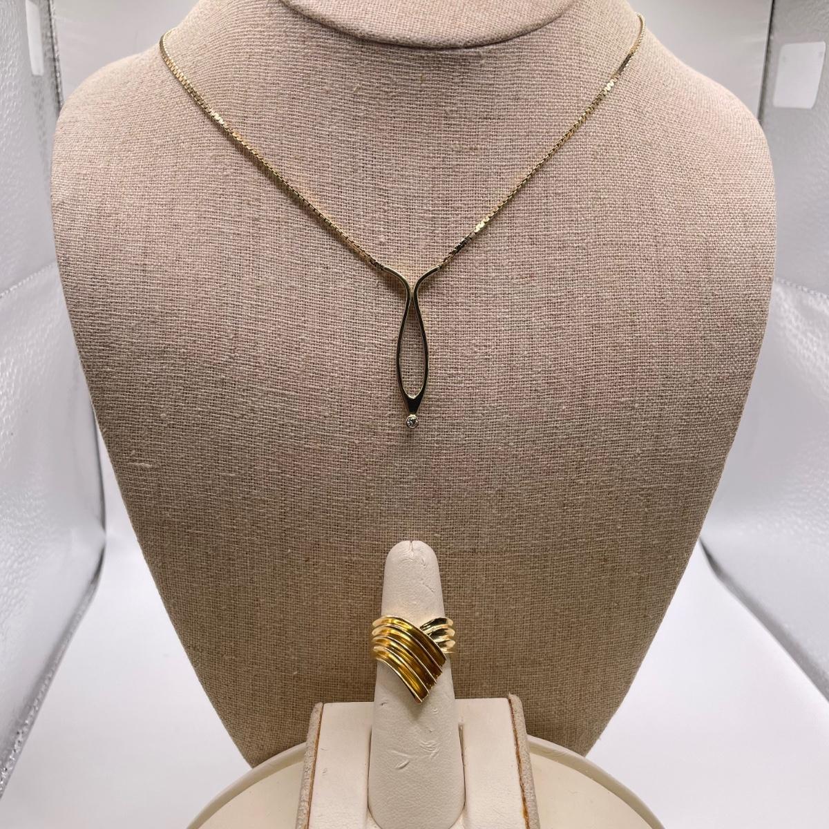 The lovely necklace's clasp is marked "14k, Italy" with a gem tested as a diamond in its fixed pendant. Necklace is paired alongside a large gold ring also marked "14k". See images. Starting bid is at or near melt value. We cannot guarantee the authenticity of the gemstone. All sales are final. No returns or refunds. Please bid accordingly.