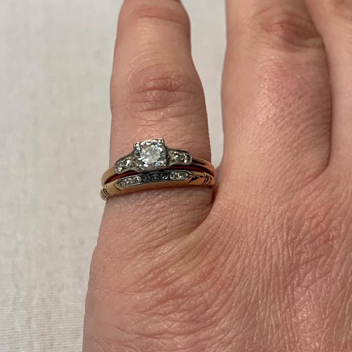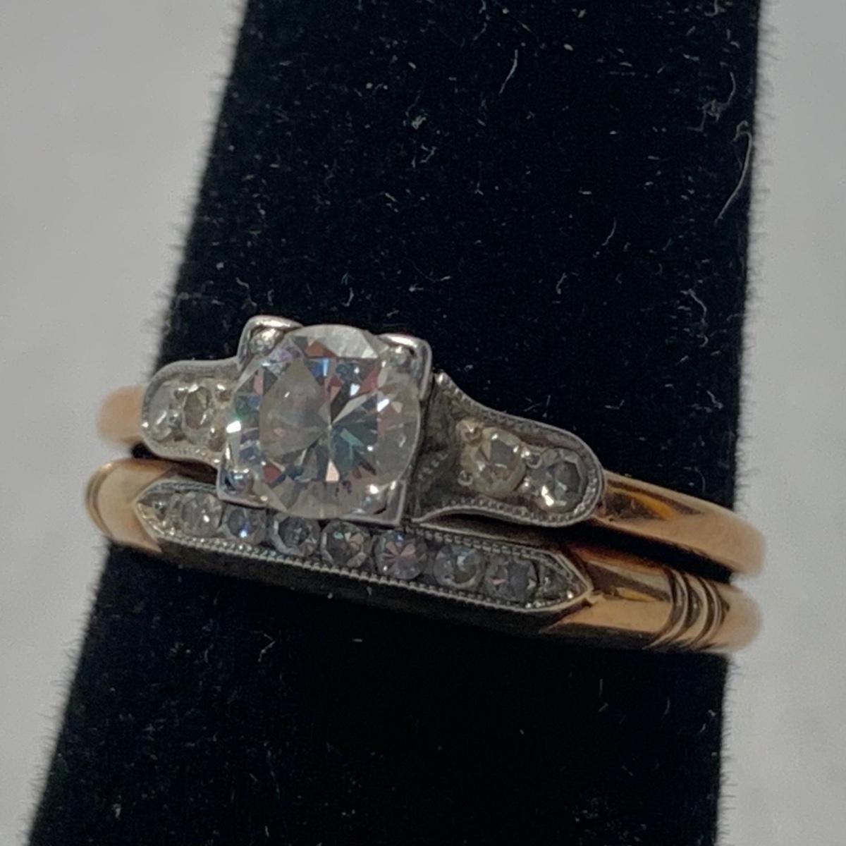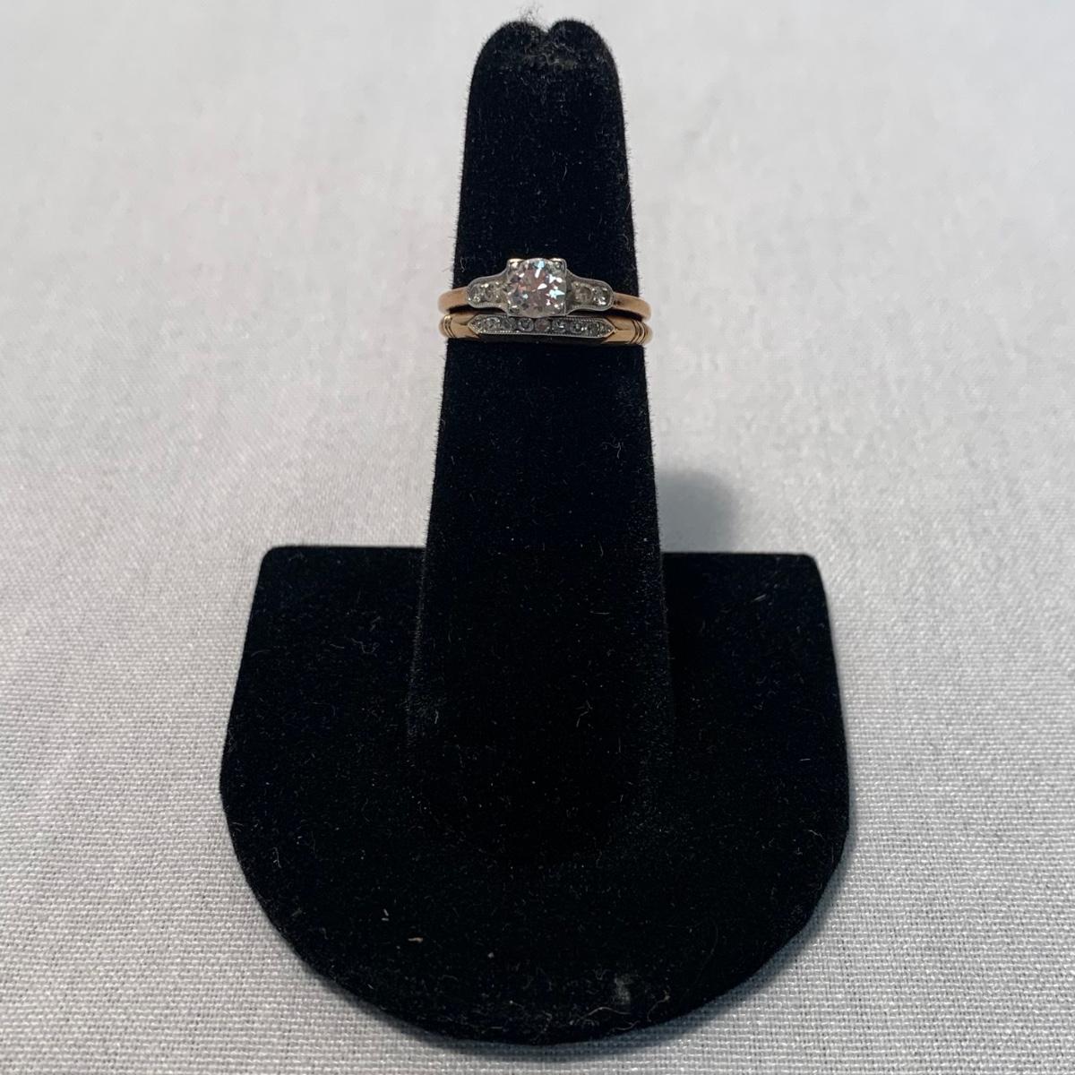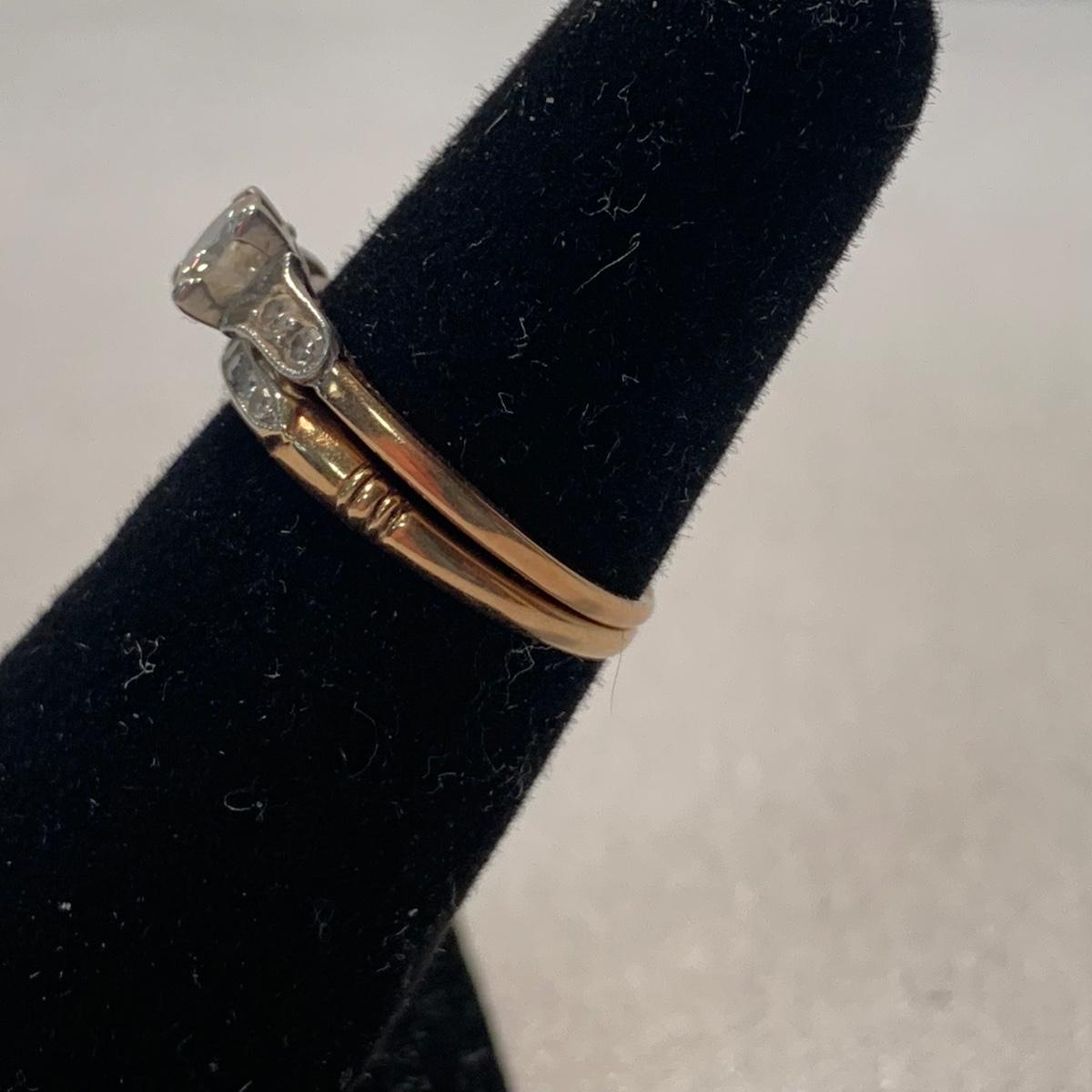 Two beautiful rings make up this set that includes a diamond side-stone engagement ring and a diamond-accented band. Both rings are stamped 14K and our diamond tester indicated that all stones are diamonds. The engagement ring has one main stone with two small ones on each side, and the band has seven small stones. Rings are both size 5.5.