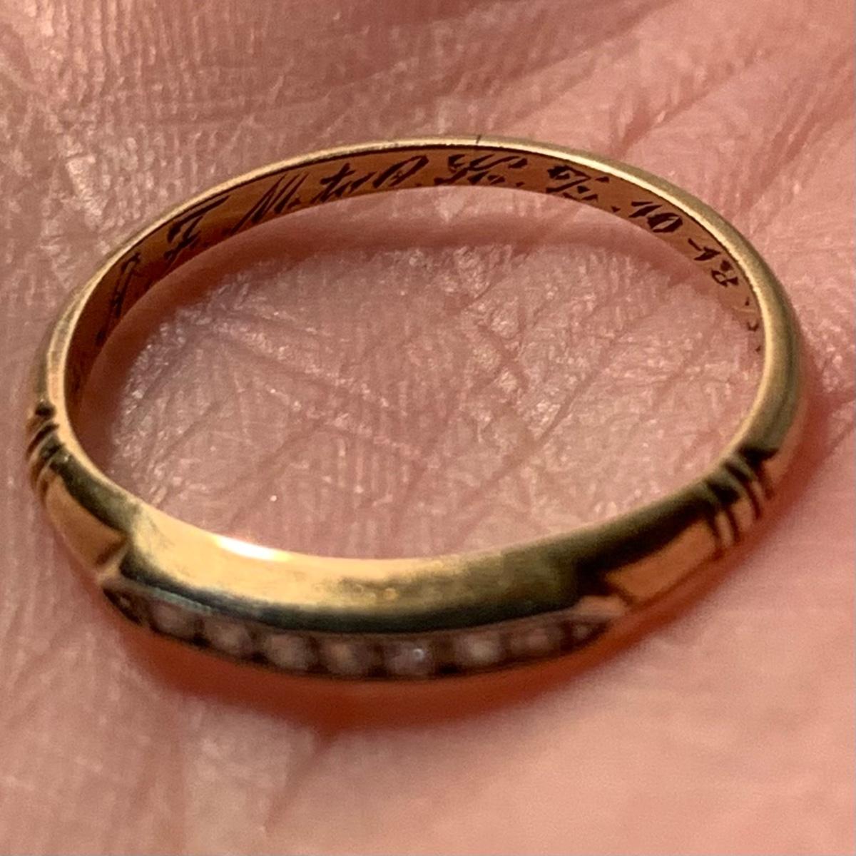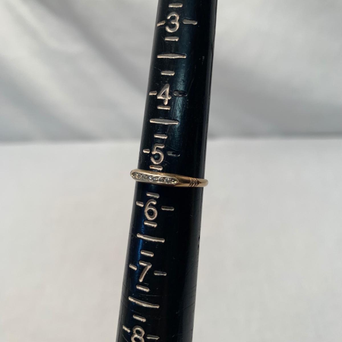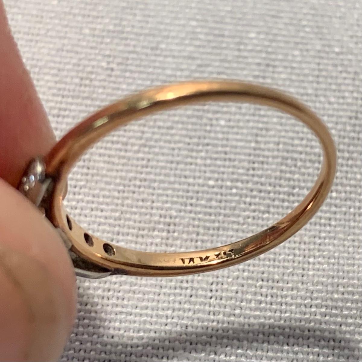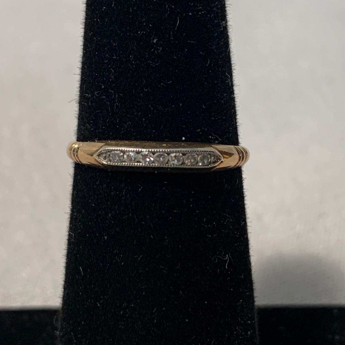 Two beautiful rings make up this set that includes a diamond side-stone engagement ring and a diamond-accented band. Both rings are stamped 14K and our diamond tester indicated that all stones are diamonds. The engagement ring has one main stone with two small ones on each side, and the band has seven small stones. Rings are both size 5.5.