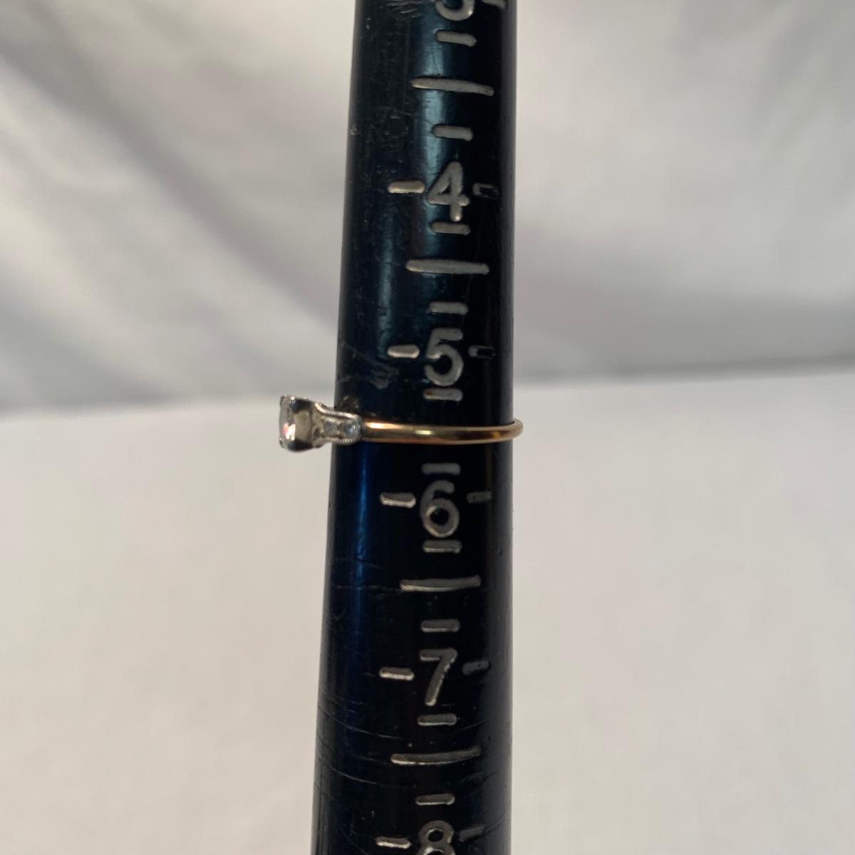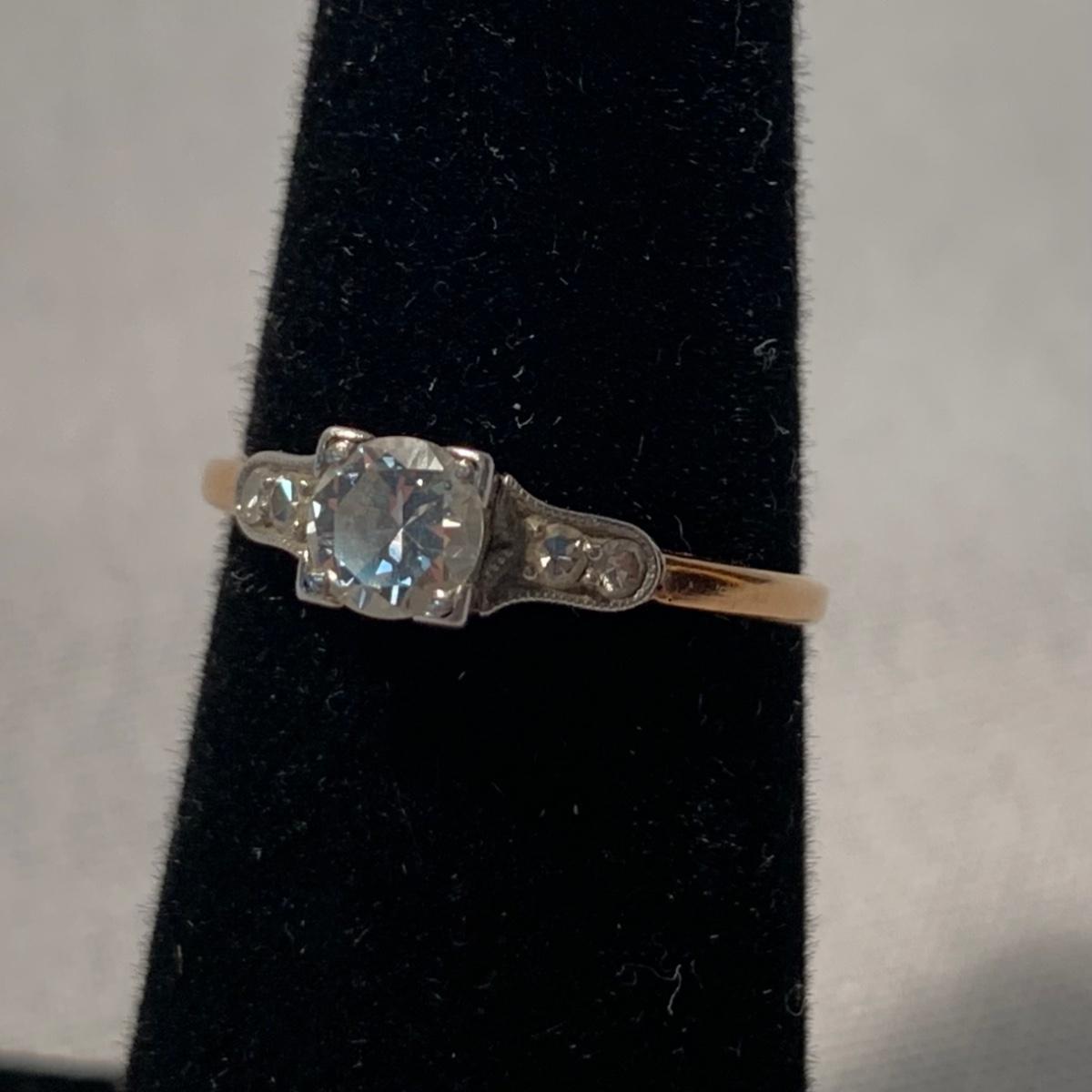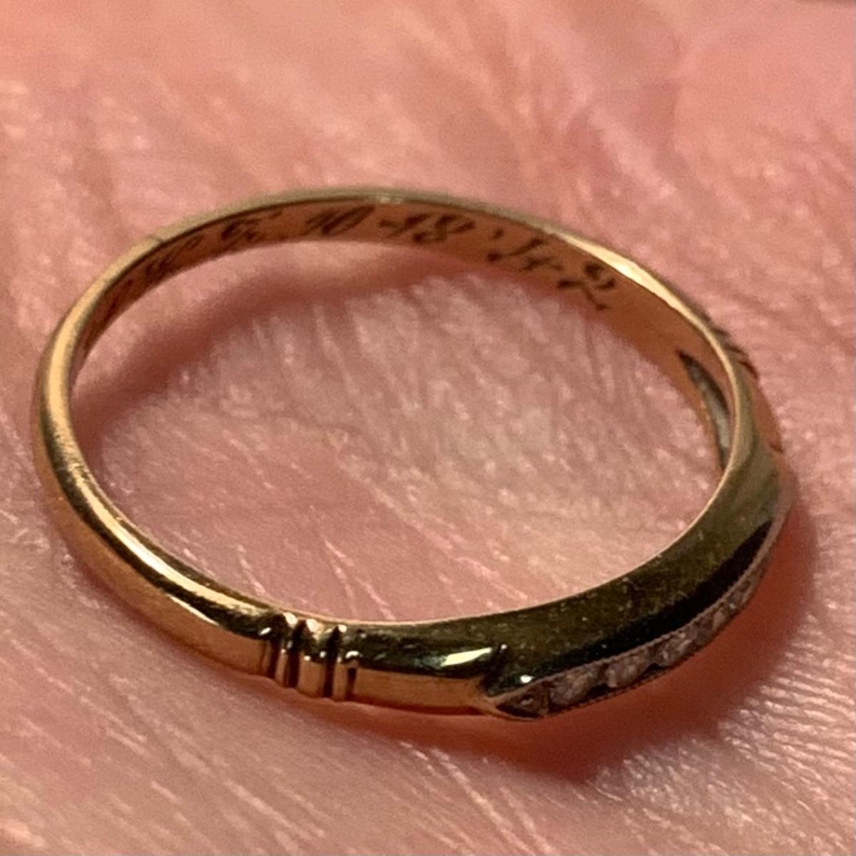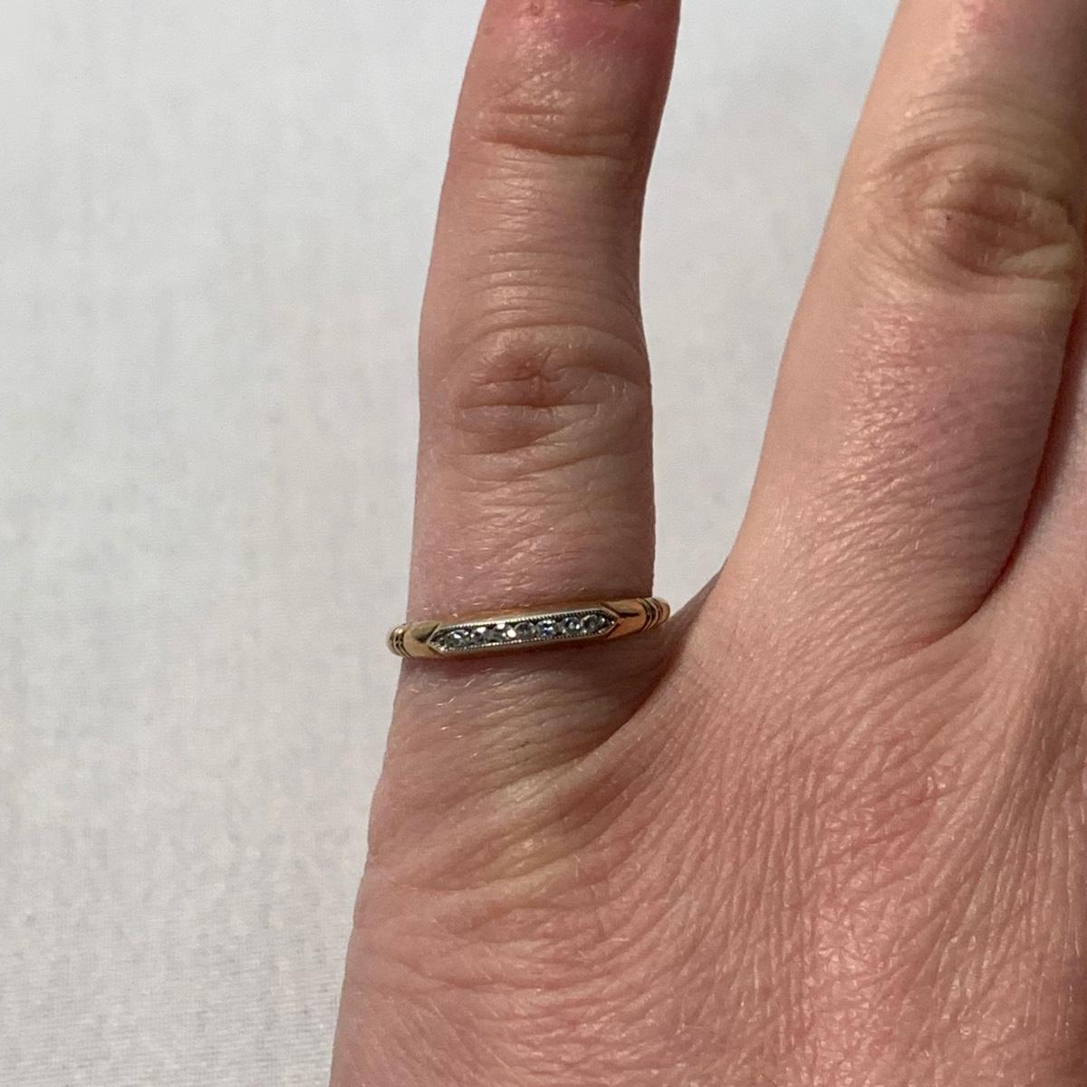 Two beautiful rings make up this set that includes a diamond side-stone engagement ring and a diamond-accented band. Both rings are stamped 14K and our diamond tester indicated that all stones are diamonds. The engagement ring has one main stone with two small ones on each side, and the band has seven small stones. Rings are both size 5.5.