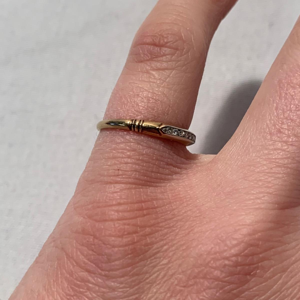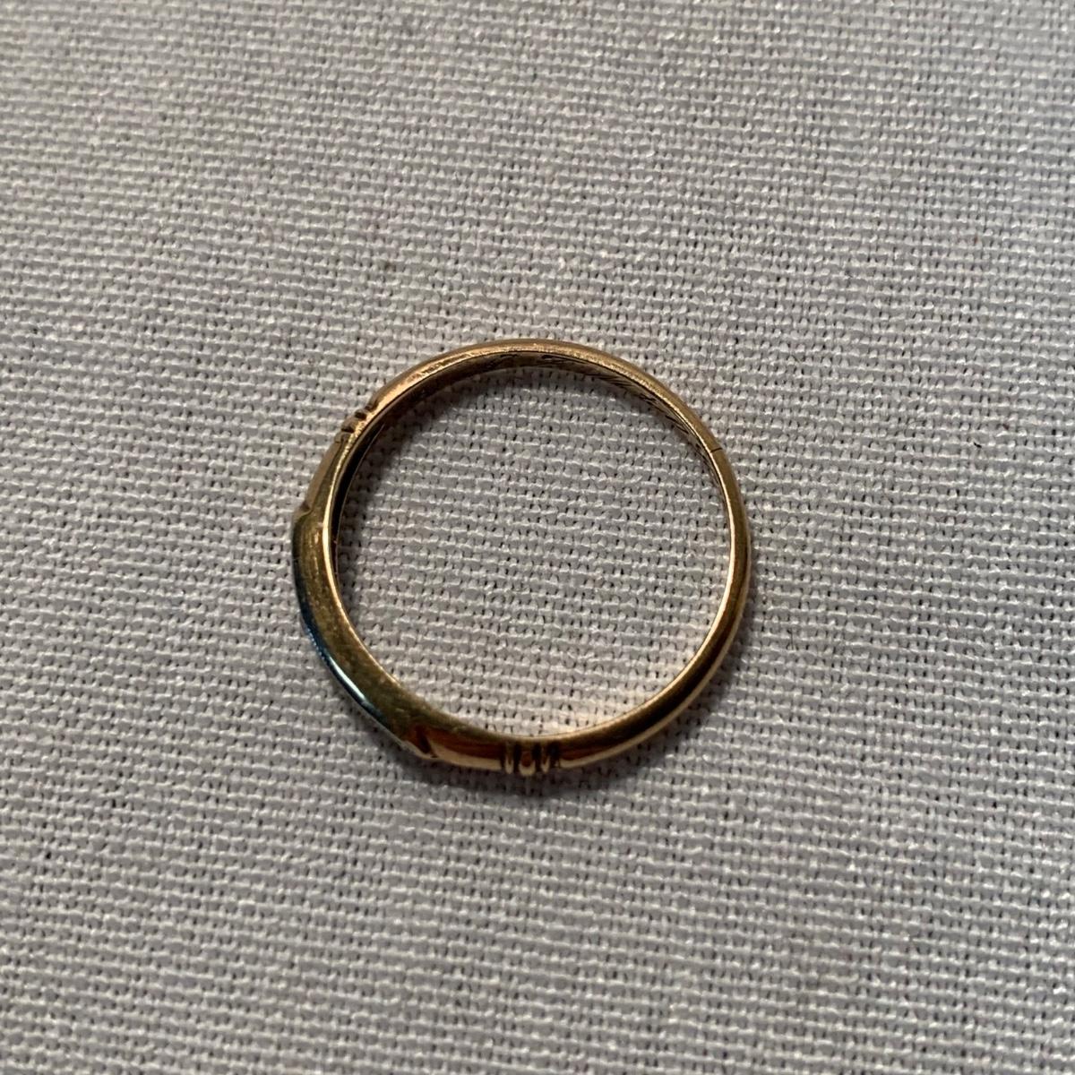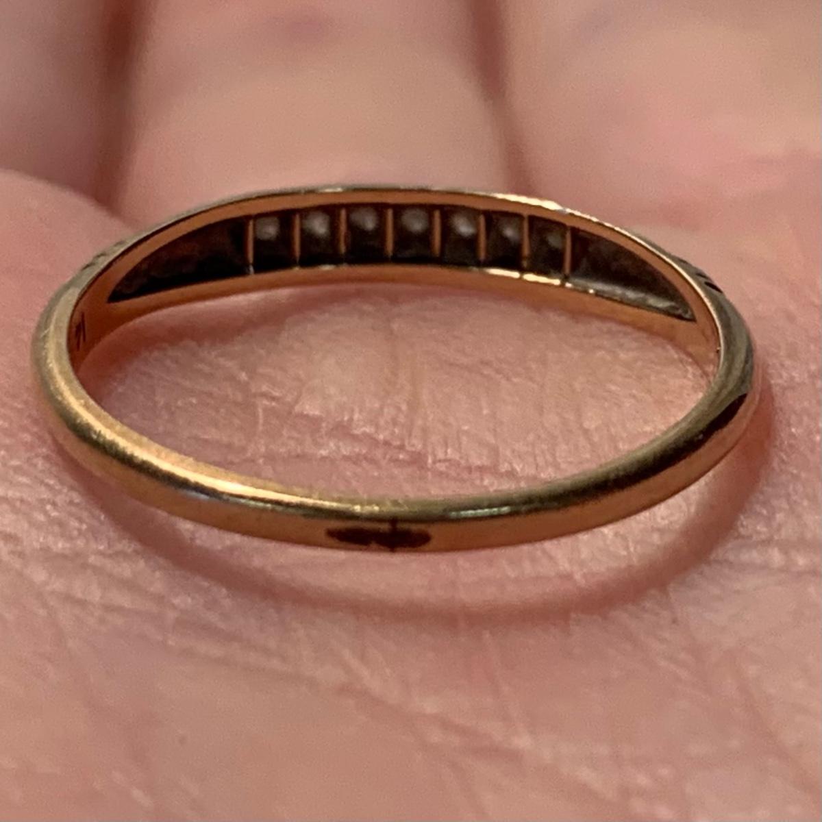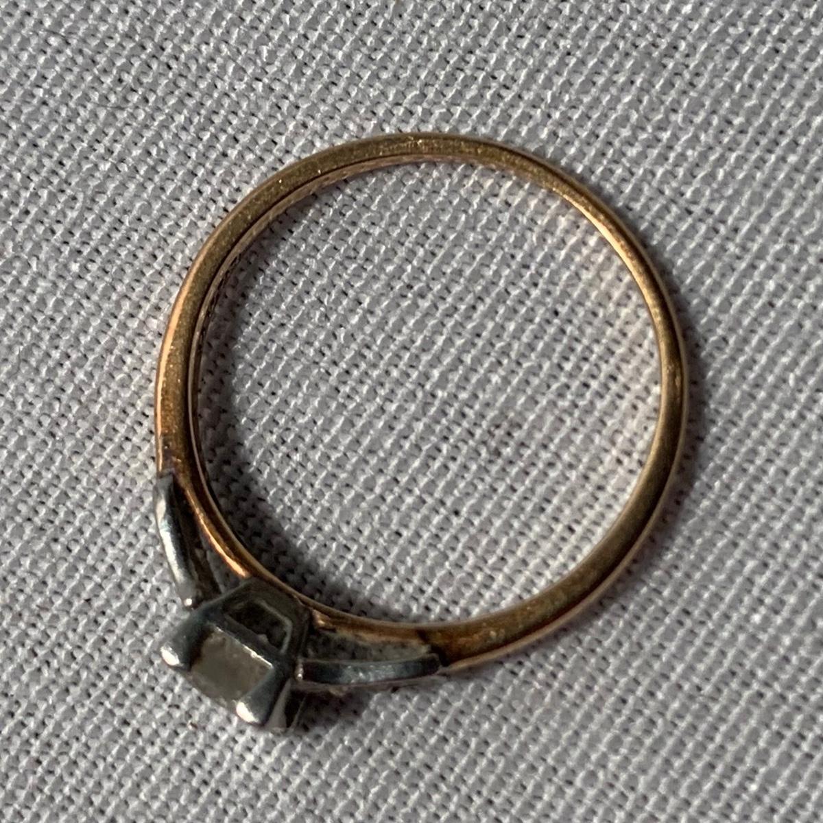 Two beautiful rings make up this set that includes a diamond side-stone engagement ring and a diamond-accented band. Both rings are stamped 14K and our diamond tester indicated that all stones are diamonds. The engagement ring has one main stone with two small ones on each side, and the band has seven small stones. Rings are both size 5.5.