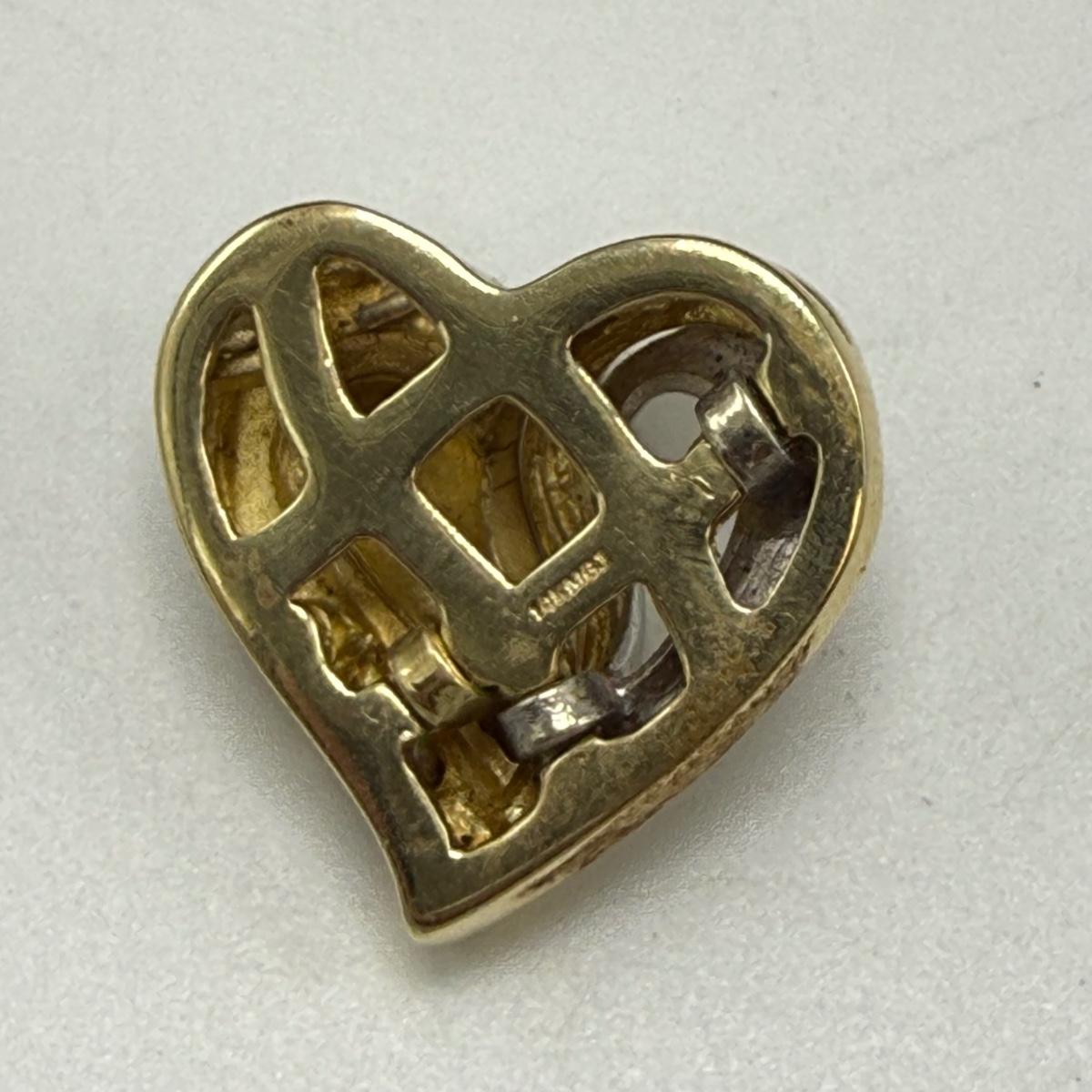 Heart shaped pendant with yellow and white gold. Pendant is stamped 14KMGJ and has a clasp for a chain to lay at an angle. Starting bid is at or near melt value. All sales are final. No returns or refunds. Please bid accordingly. Shipping available.