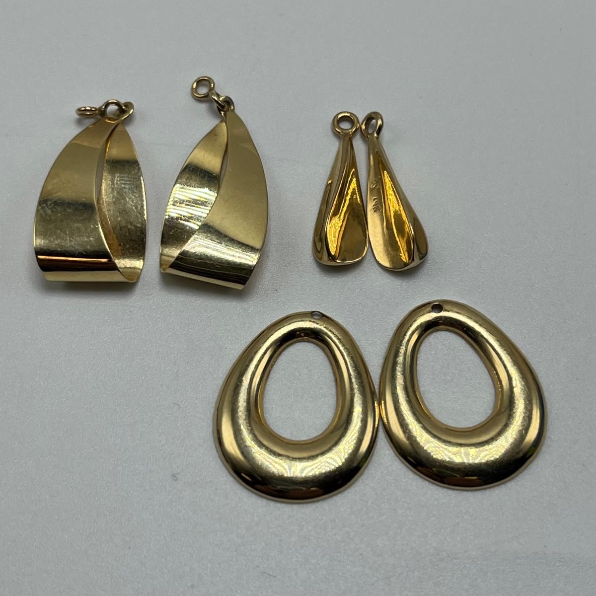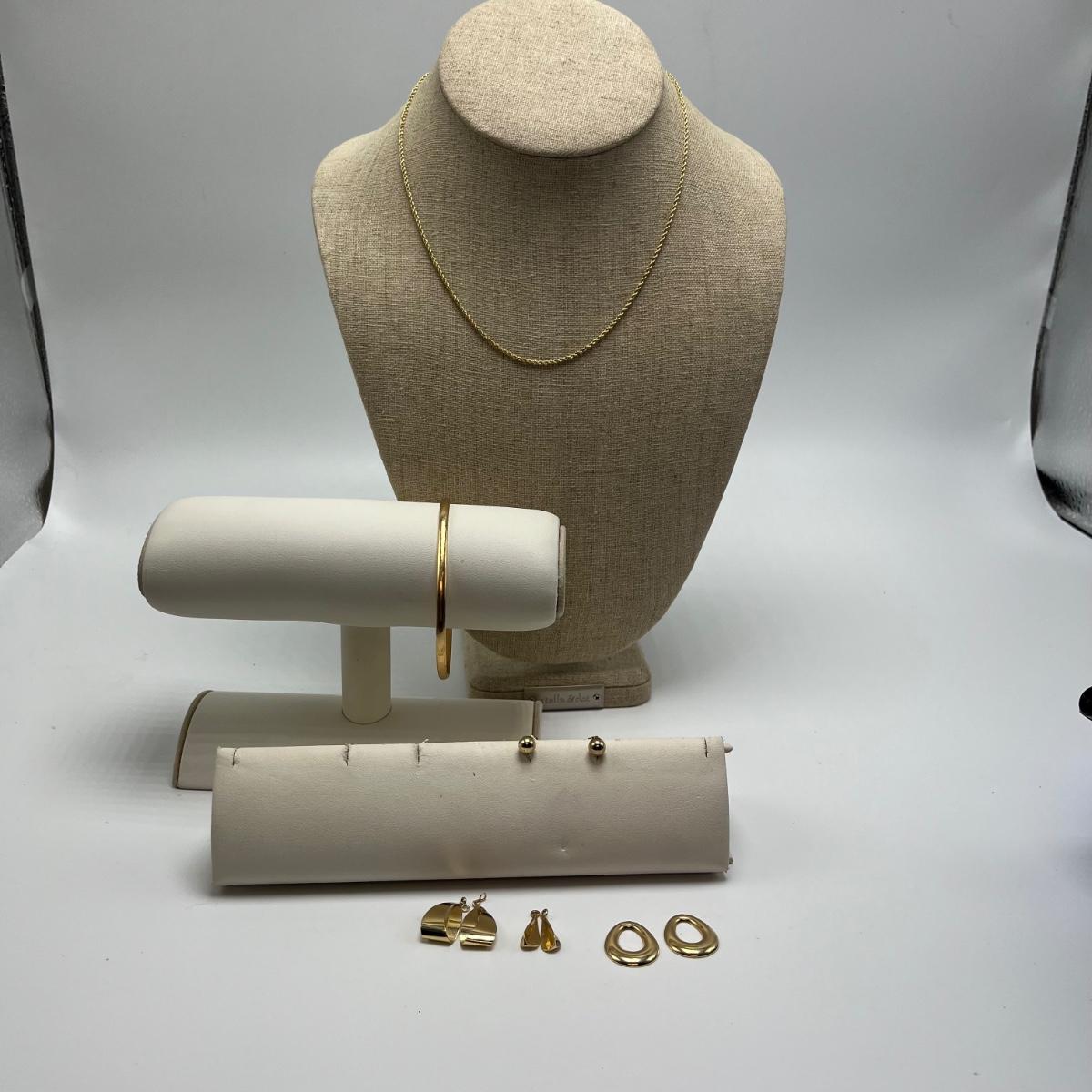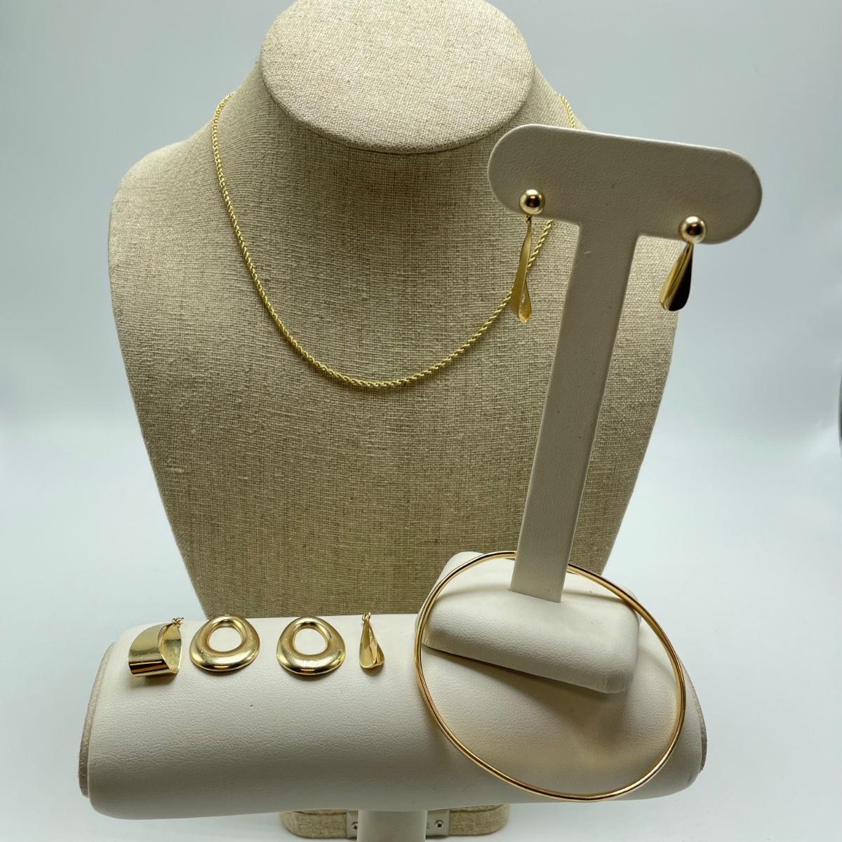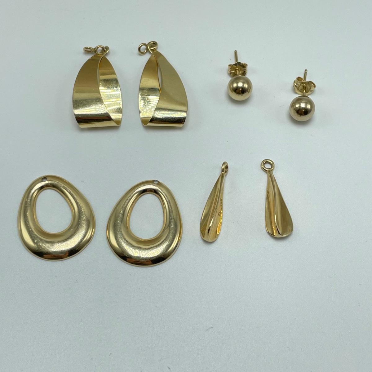 Lot includes a gold necklace marked 14k, gold bracelet marked 14k, gold colored post earrings (markings found on earring backs are 14K and 585, no known markings on earrings), two gold earring accessories pairs marked 14k and one earring accessory marked 585. Other markings are shown in photos as well. All sales are final. No returns or refunds. Please bid accordingly.