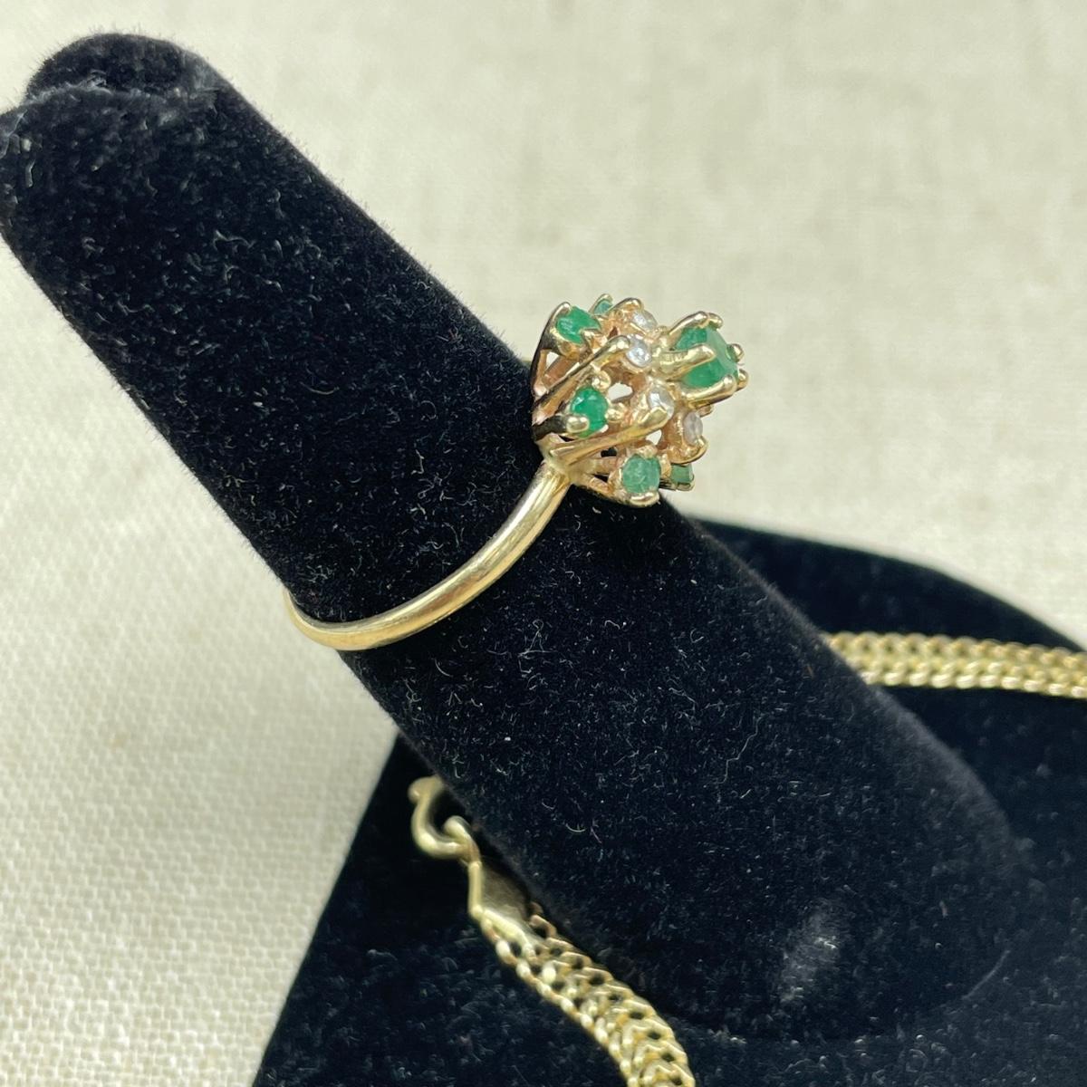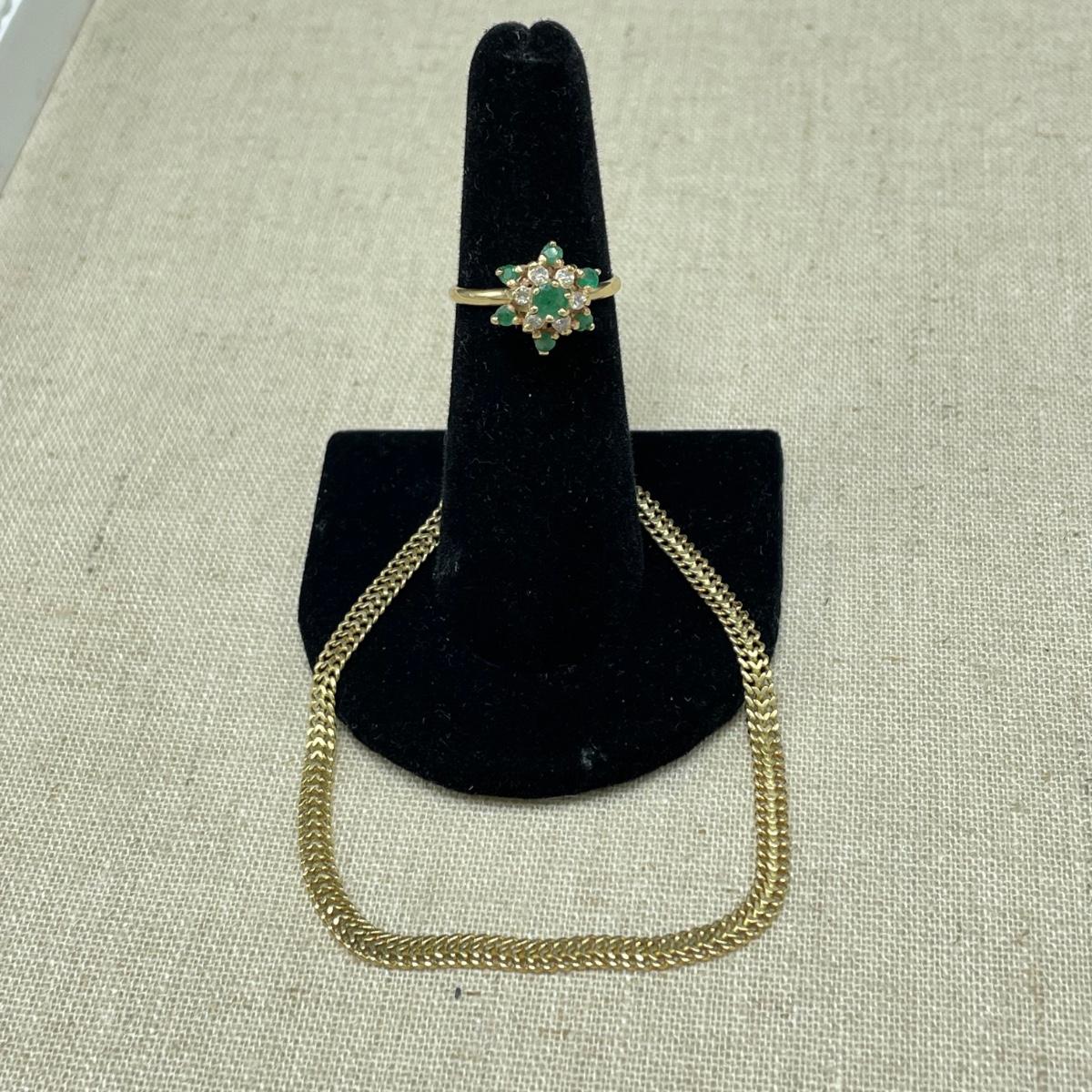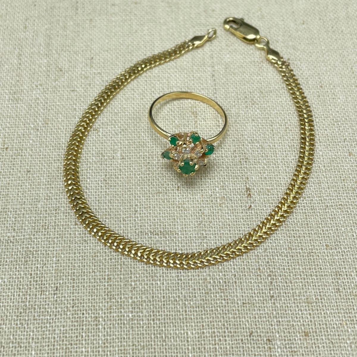 Ring with emerald-like gems marked 14K and a unique link bracelet marked 585. Bracelet is 7.25” long. See images. Shipping available.
