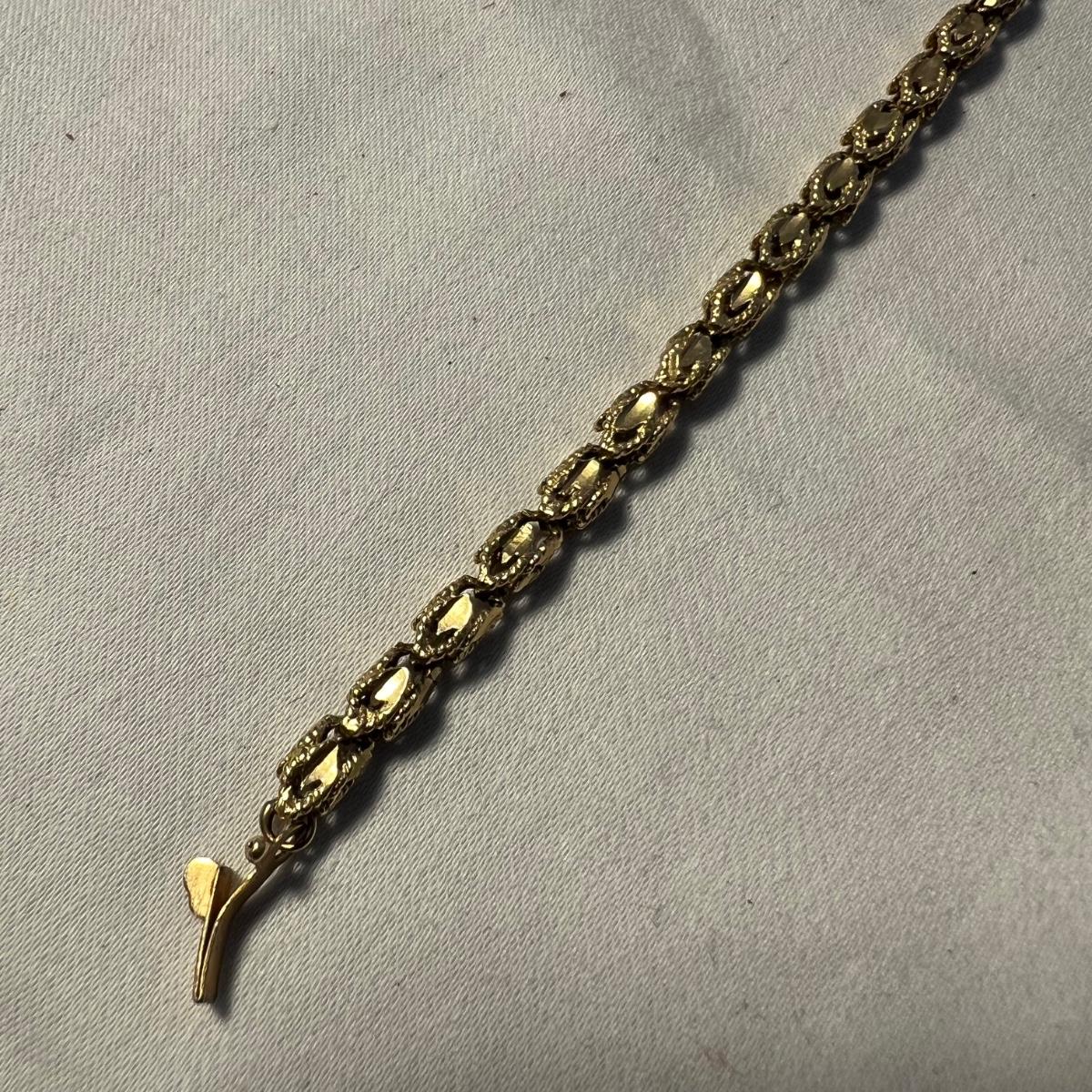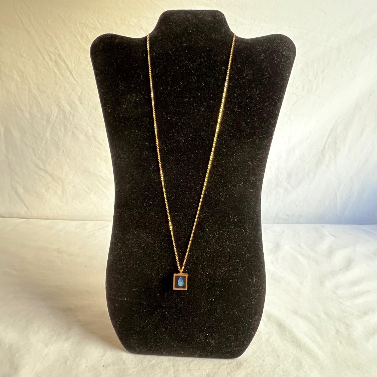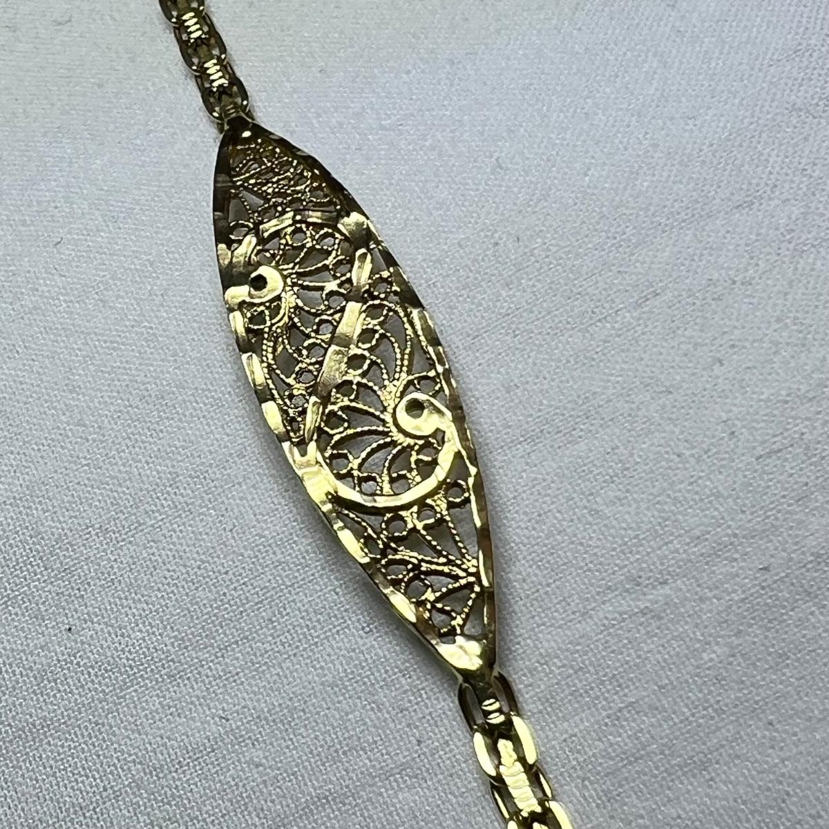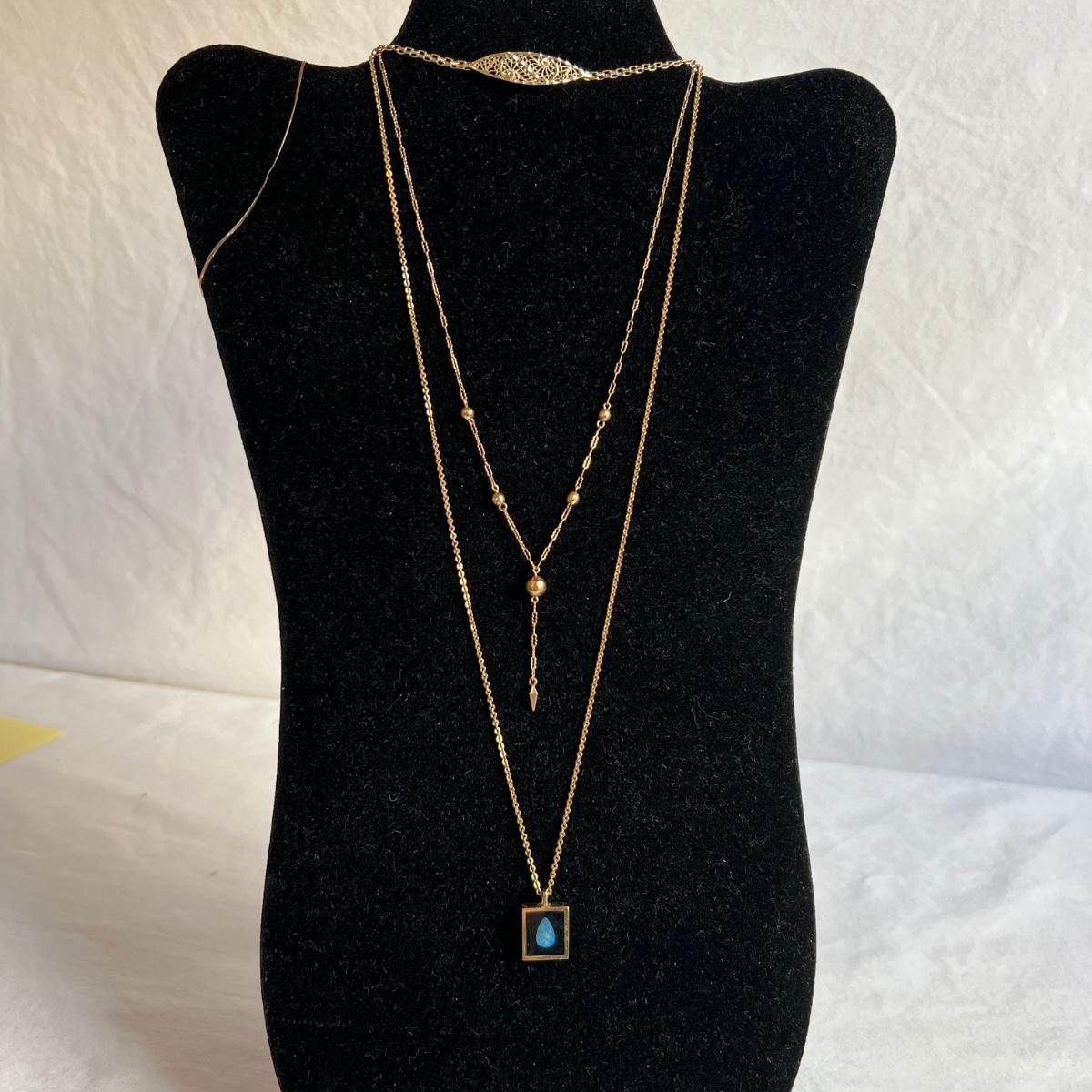 Five pieces of 14K jewelry includes two necklaces and three bracelets. The longest necklace has a pendant which has an opal like stone set within a box with a black backdrop to highlight the luminosity of the stone within; its chain measures 24” long. All sales are final. No returns or refunds. Please bid accordingly. Starting price is at or near melt value.