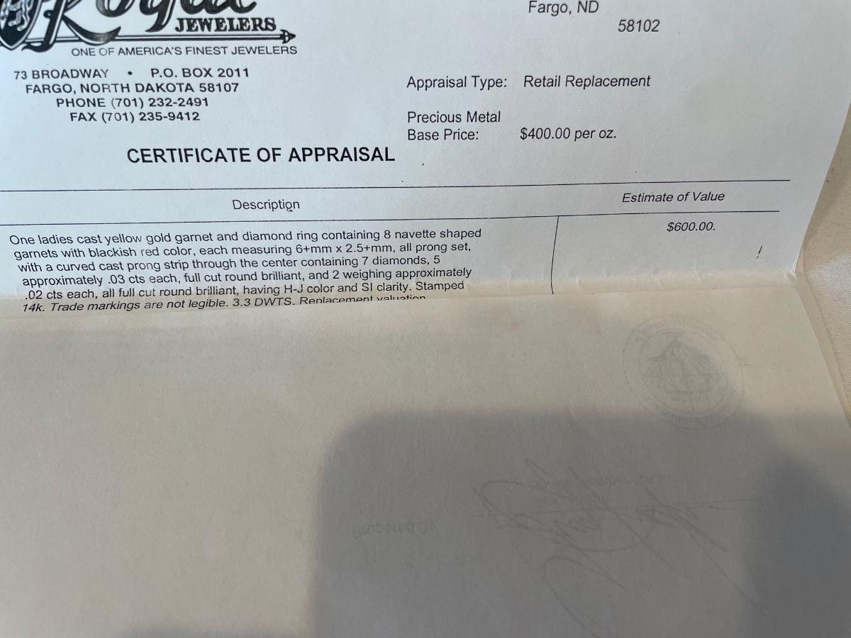 Appraisal from Royal Jewelers is pictured with all of the details on ring