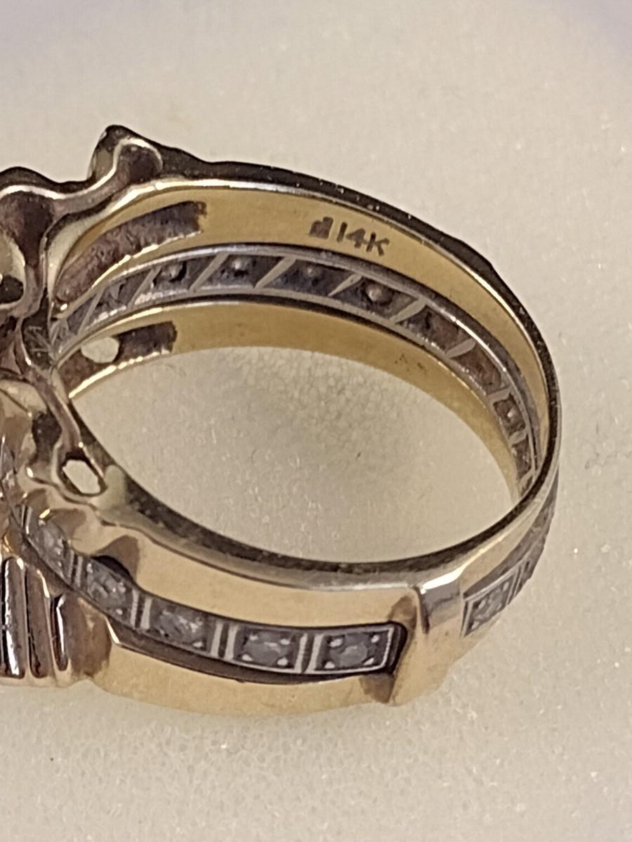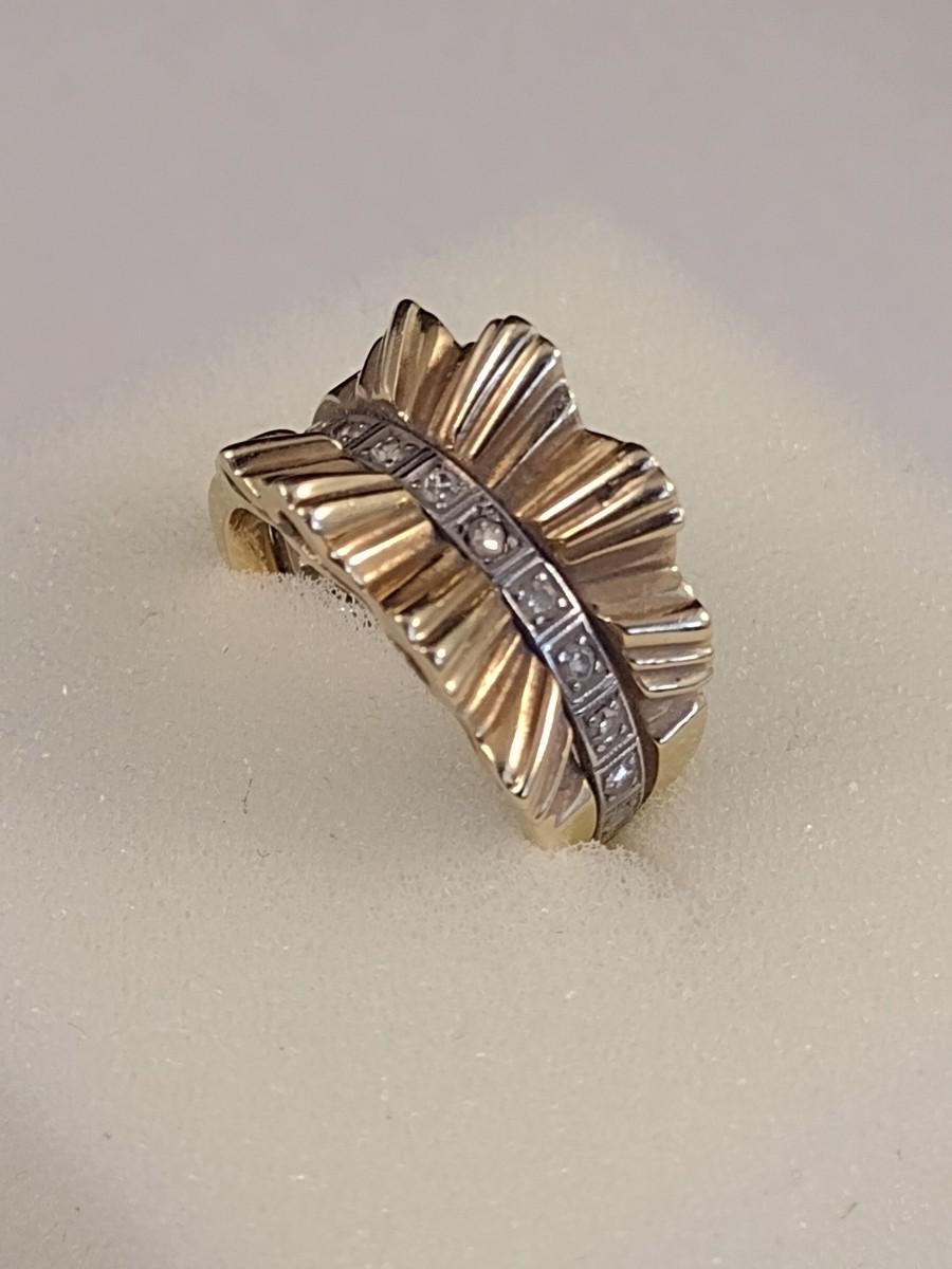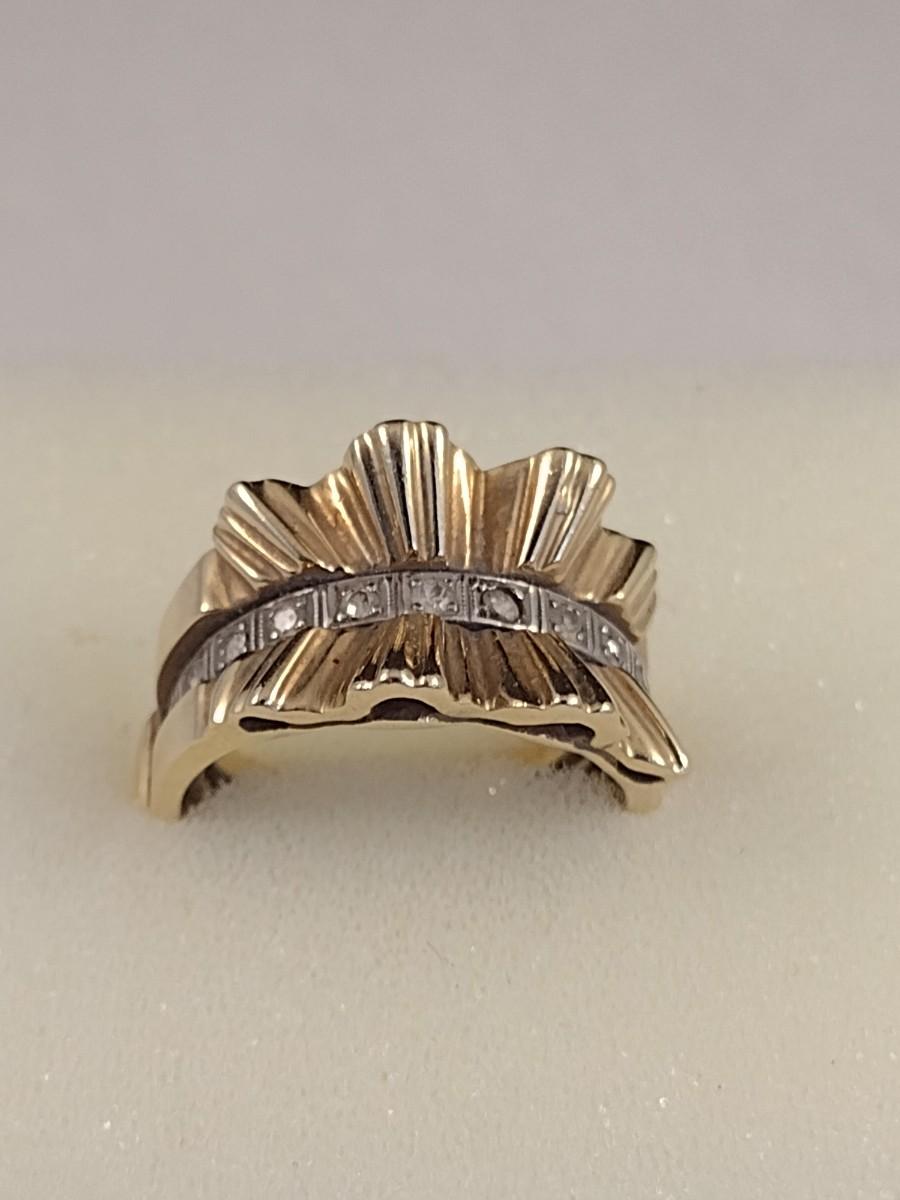 14K Gold Sunburst Design Ring with Diamond Chip Accents Set in Center Channel 7.8 grams