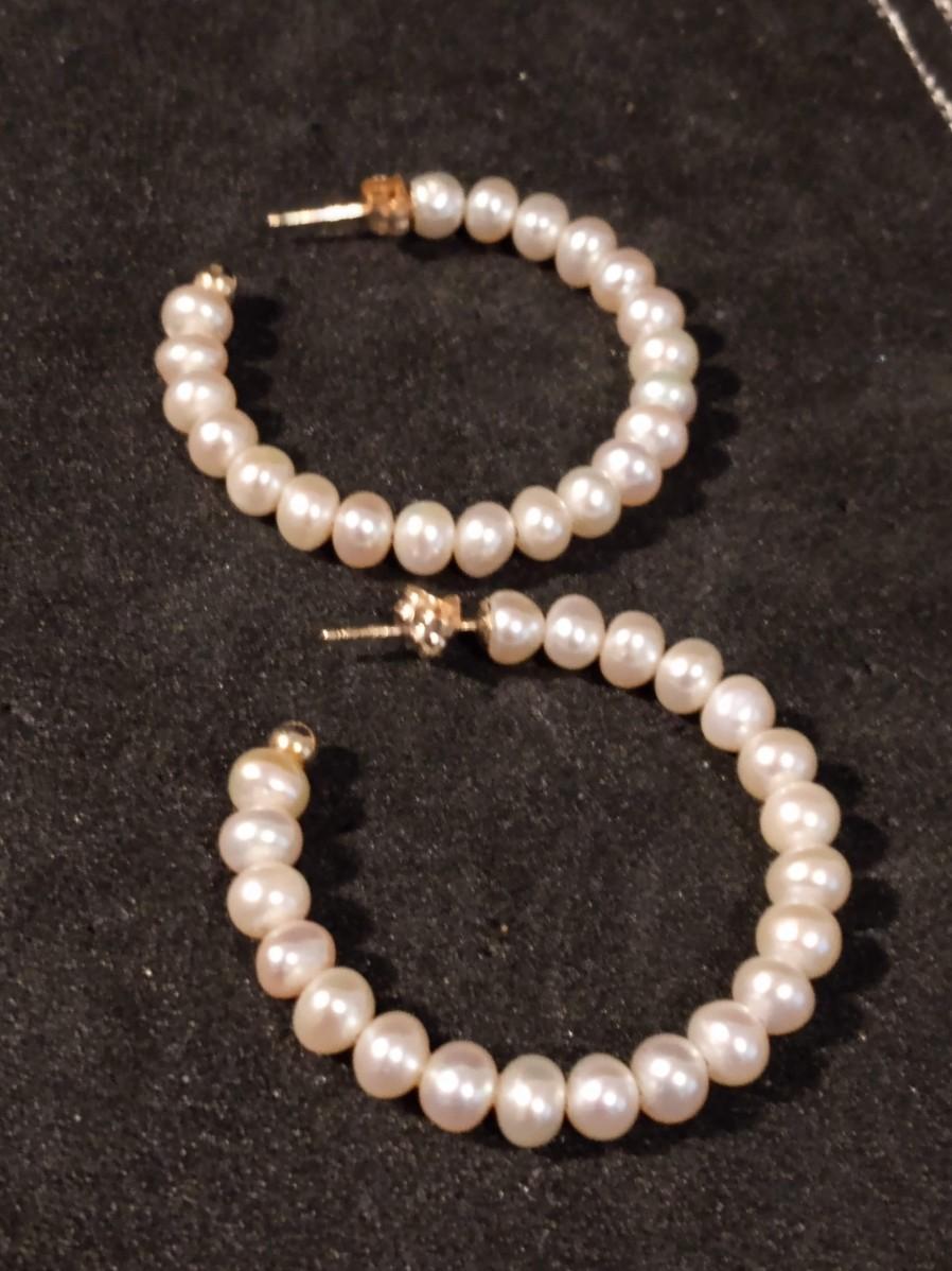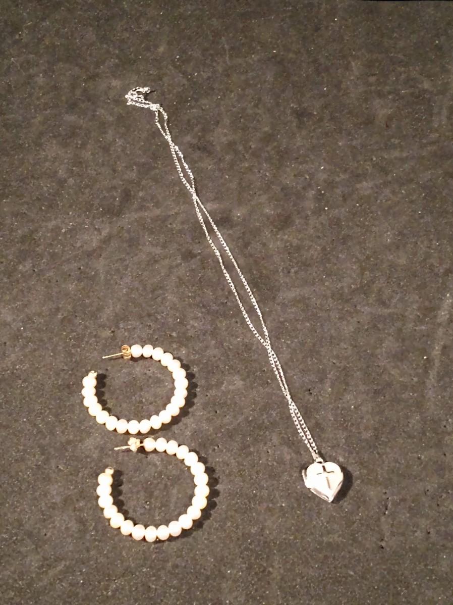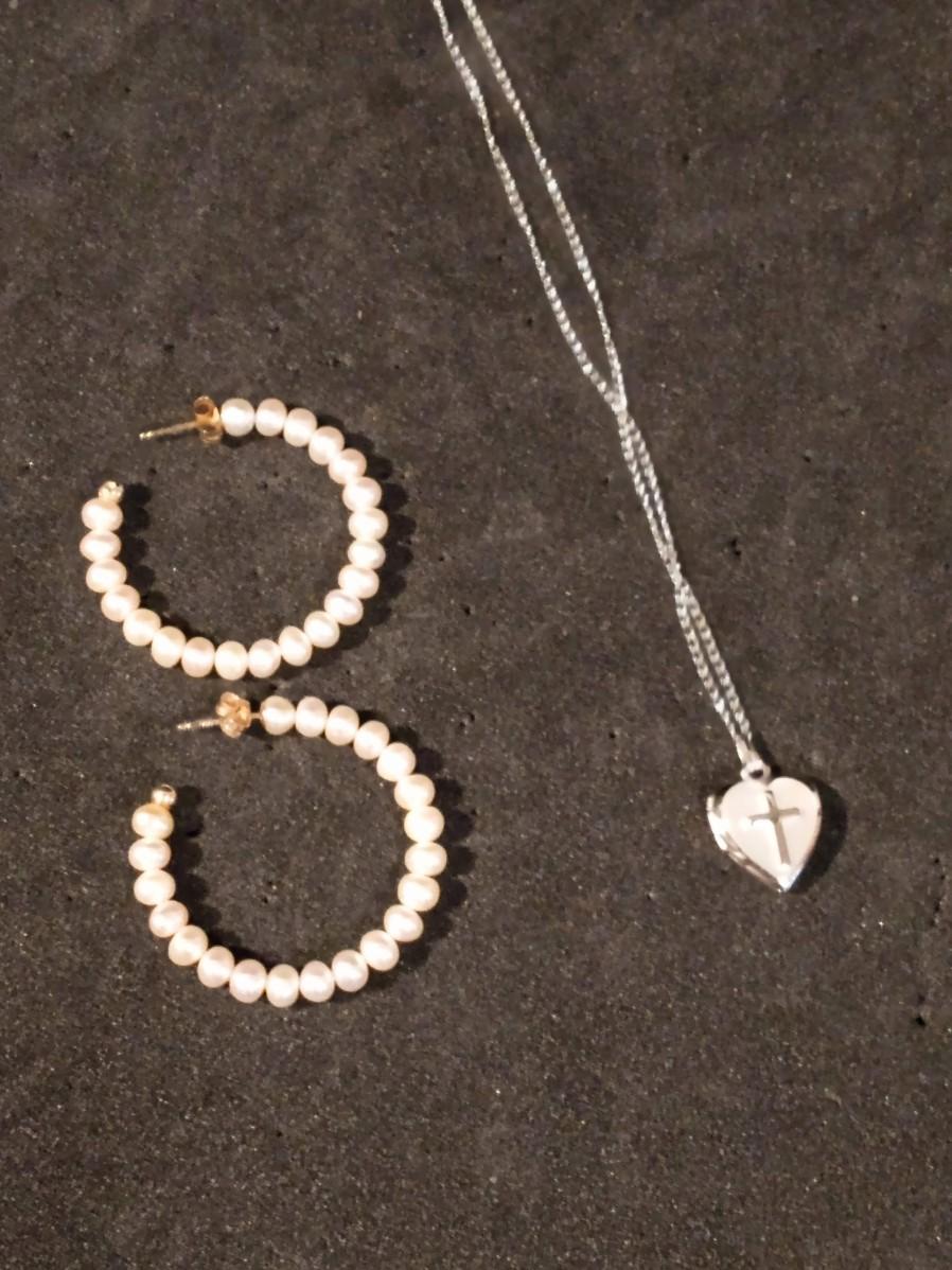 14K GOLD AND PEARL HOOP EARRINGS, HEART LOCKET WITH CROSS