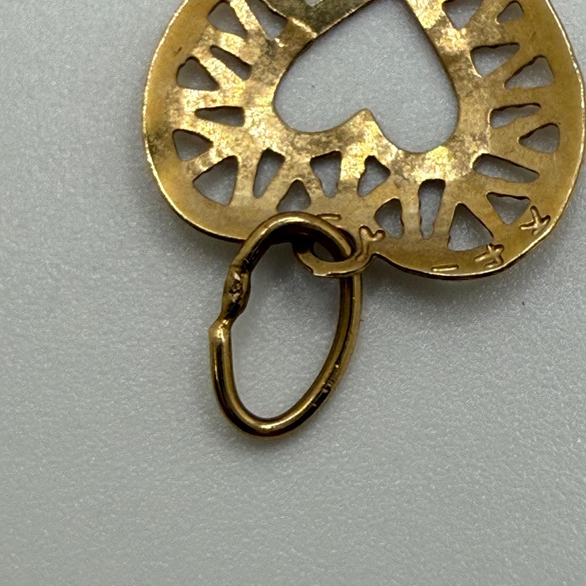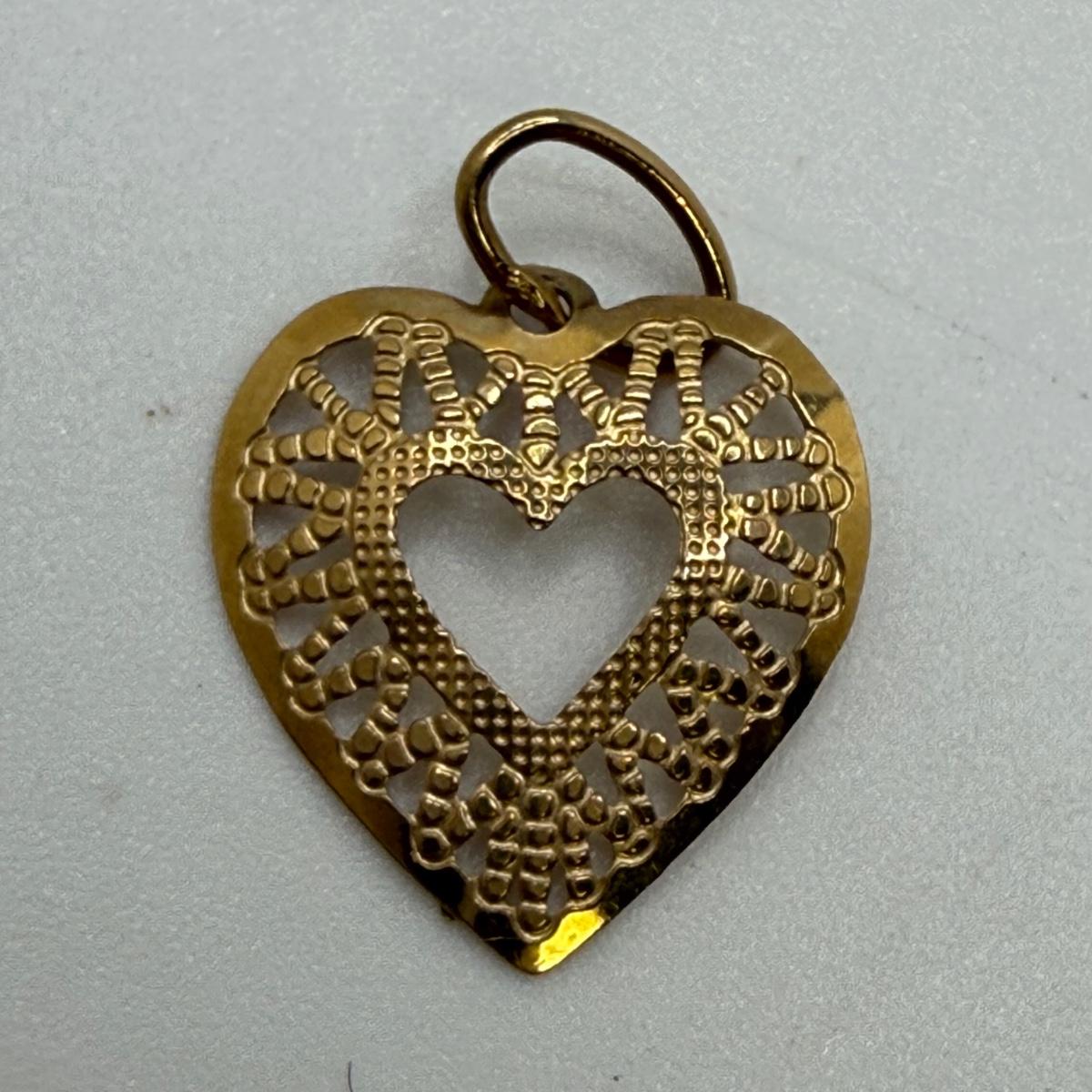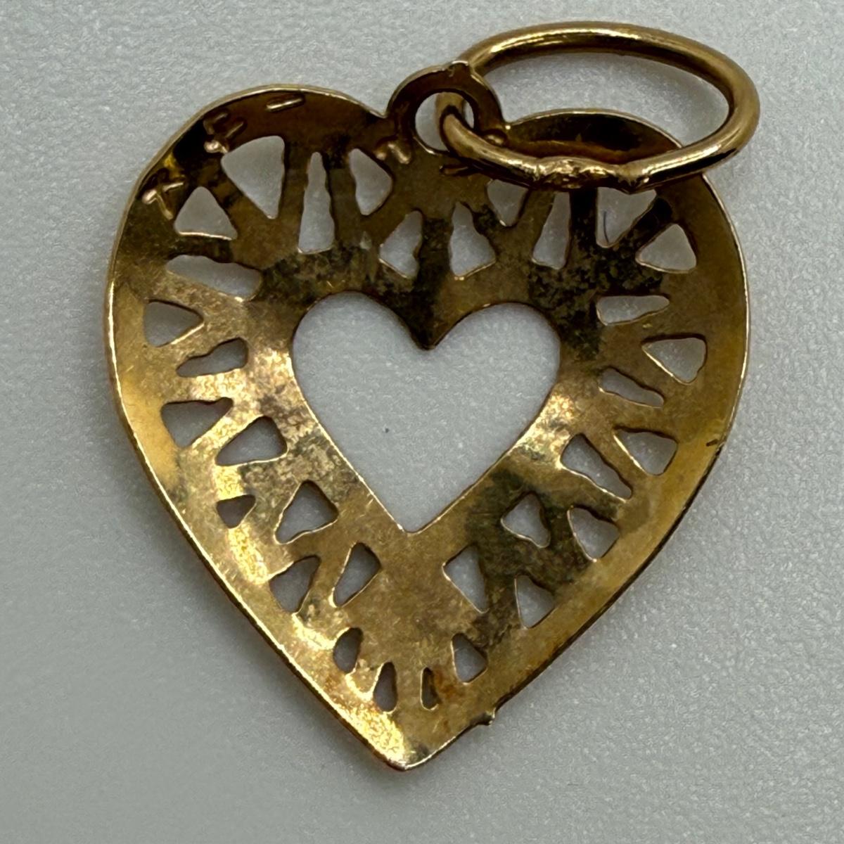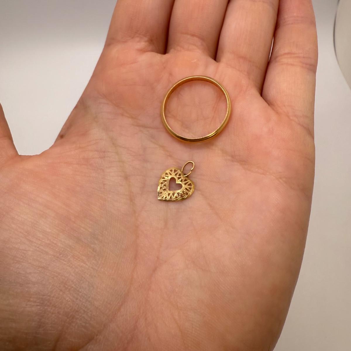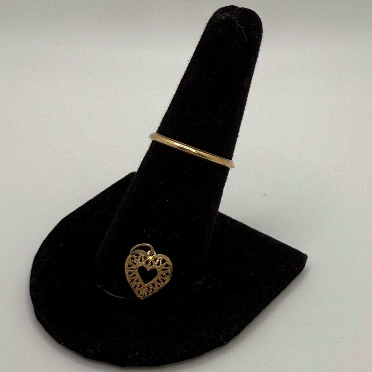 Thin ring band is stamped 14K. Ring appears to be size 8.25. Small gold heart pendant included as well. Pendant is stamped 14K.
