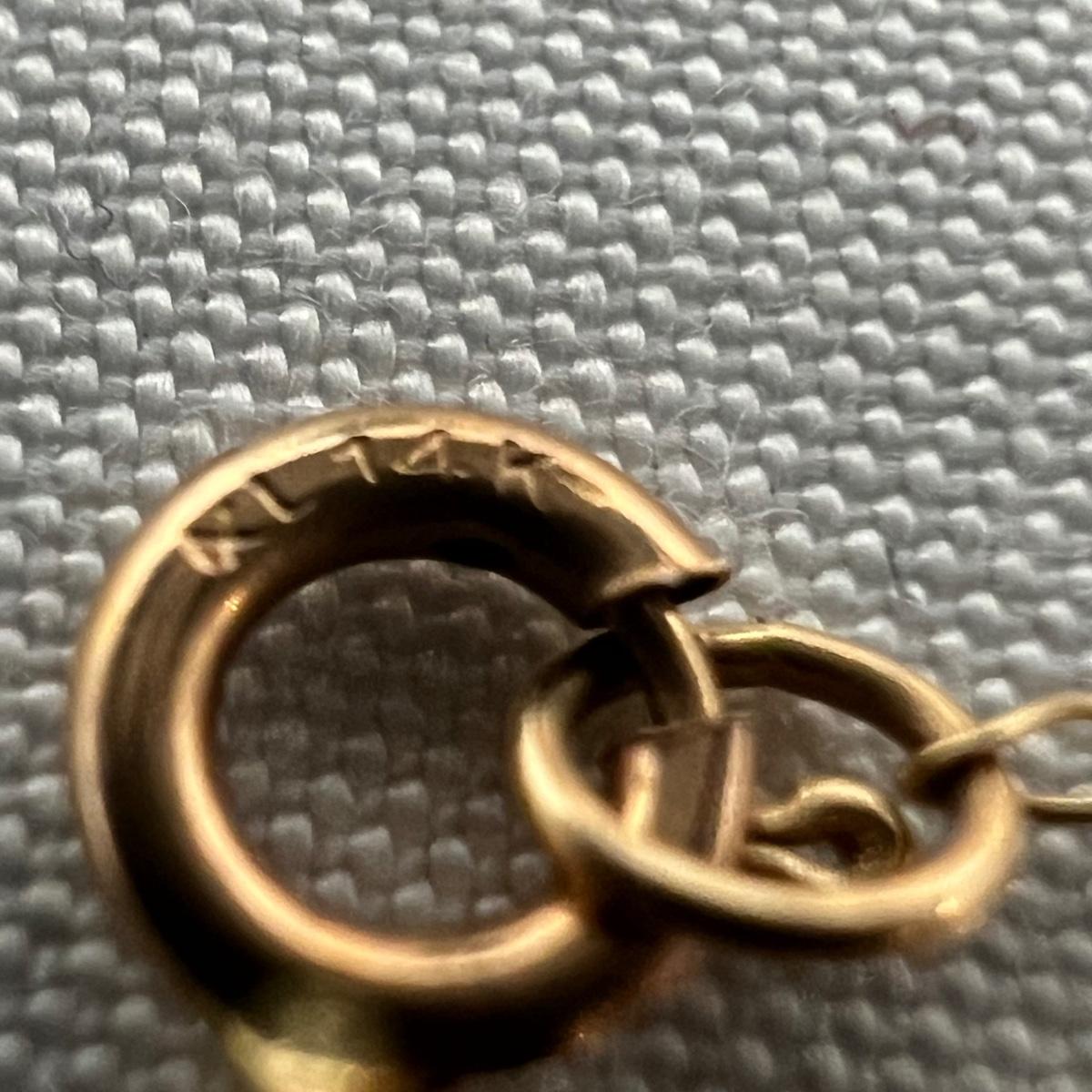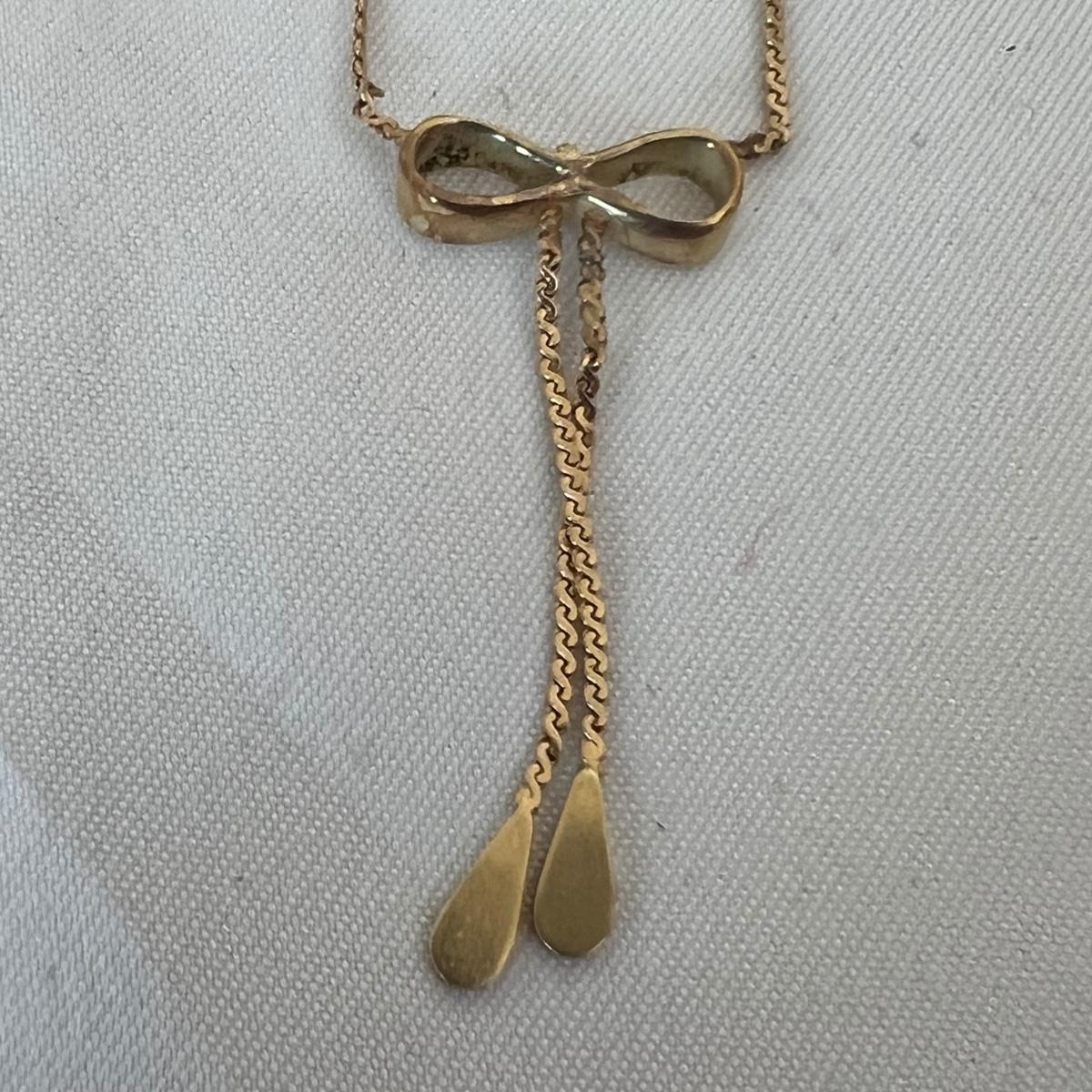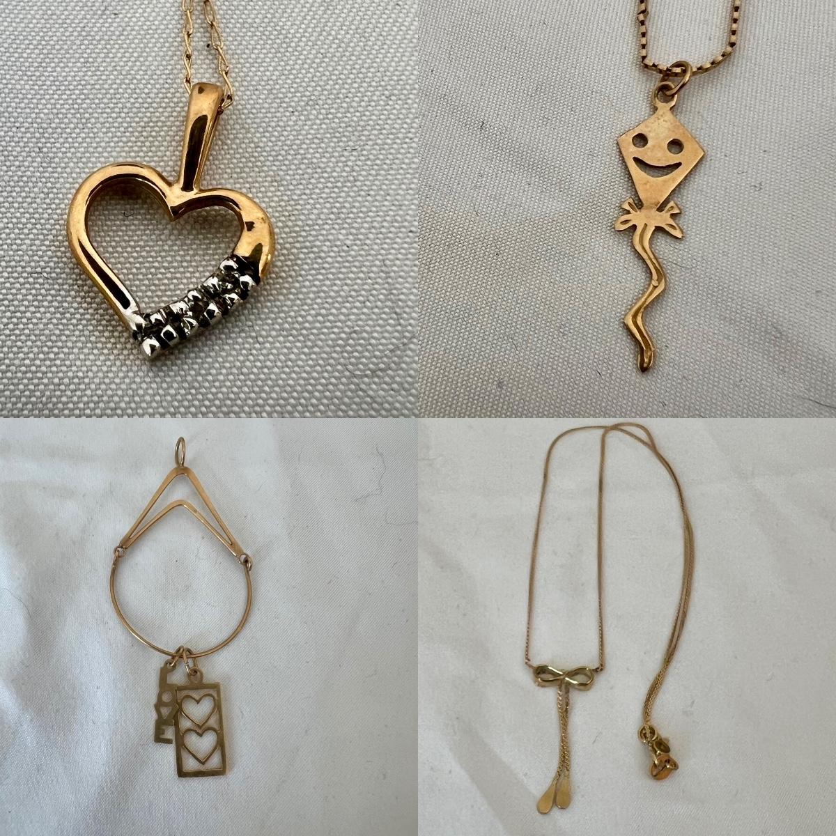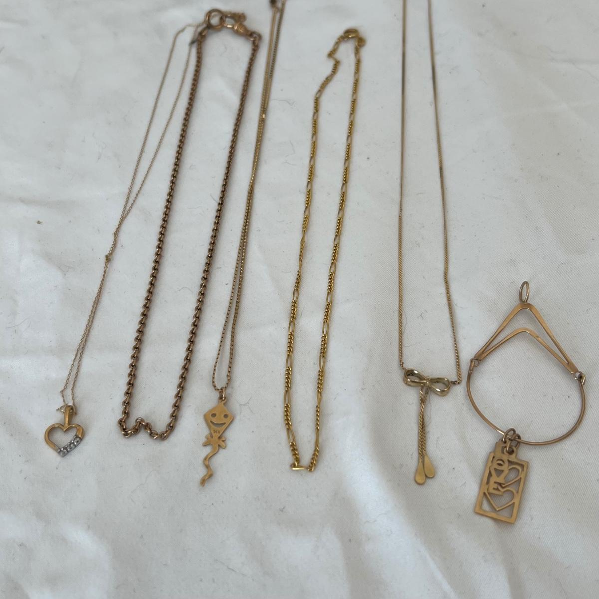 Five necklaces and a large pendant are all marked 14K gold. The only item that is unmarked is the bow shaped pendant. The chain for the heart shaped pendant has a small knot that needs untangling; it is also the longest chain measuring 16” long.