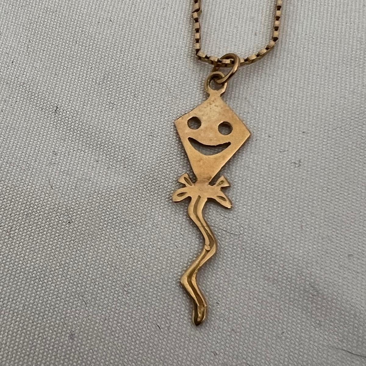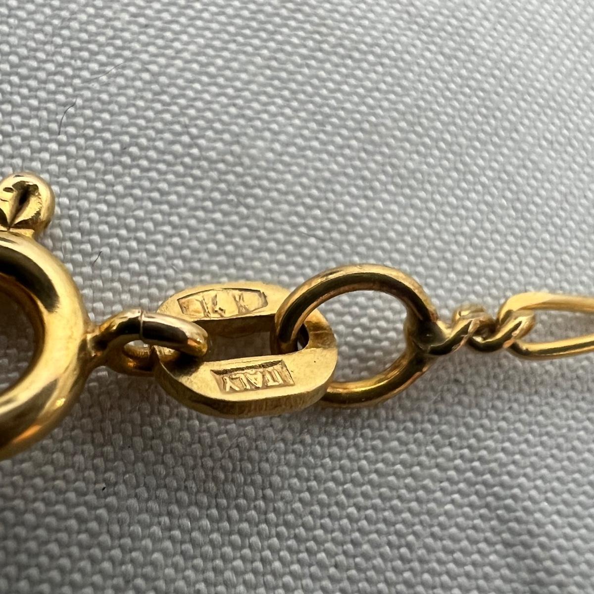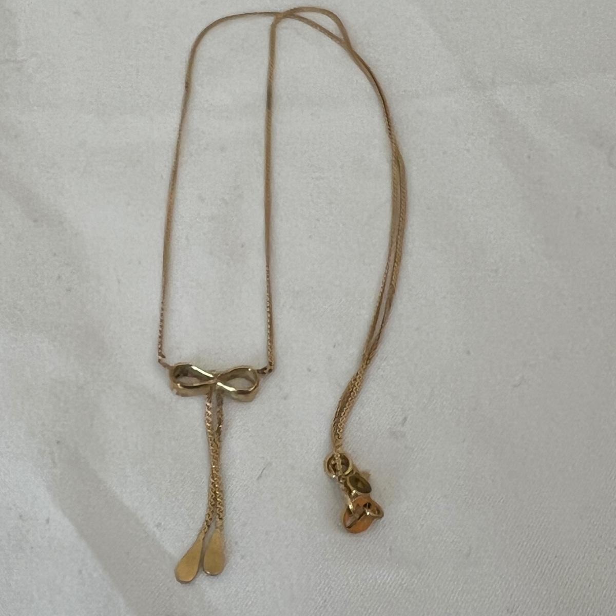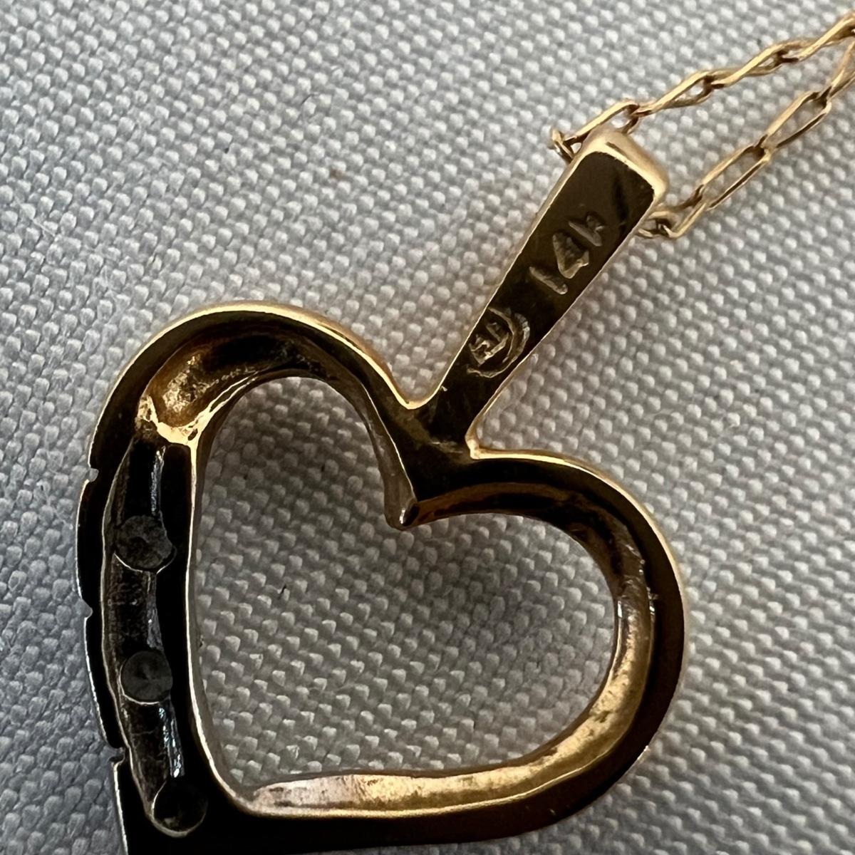Five necklaces and a large pendant are all marked 14K gold. The only item that is unmarked is the bow shaped pendant. The chain for the heart shaped pendant has a small knot that needs untangling; it is also the longest chain measuring 16” long.