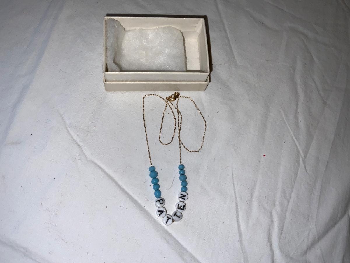 Dainty necklace with word Patten spelled out. Not verified or tested.