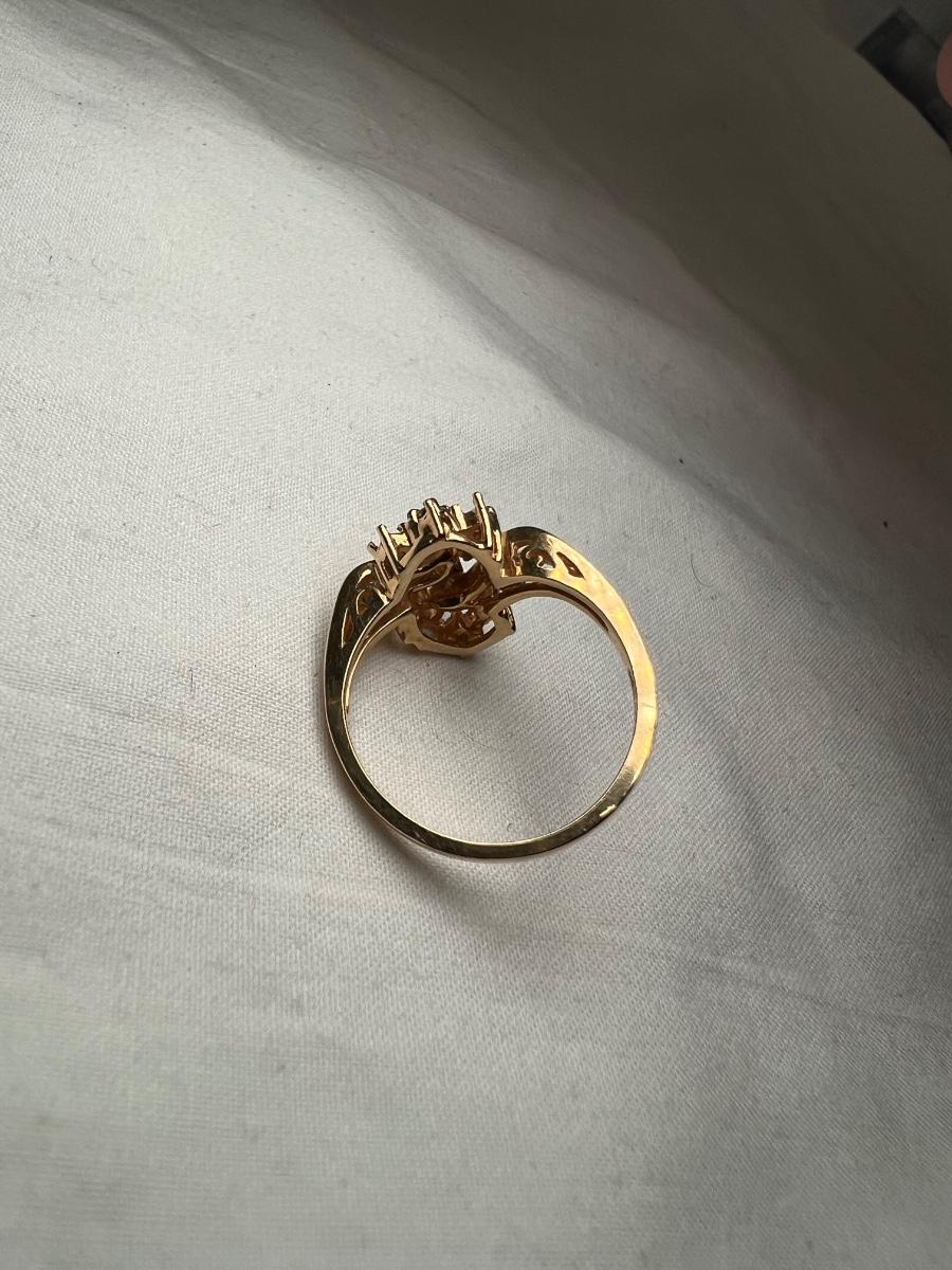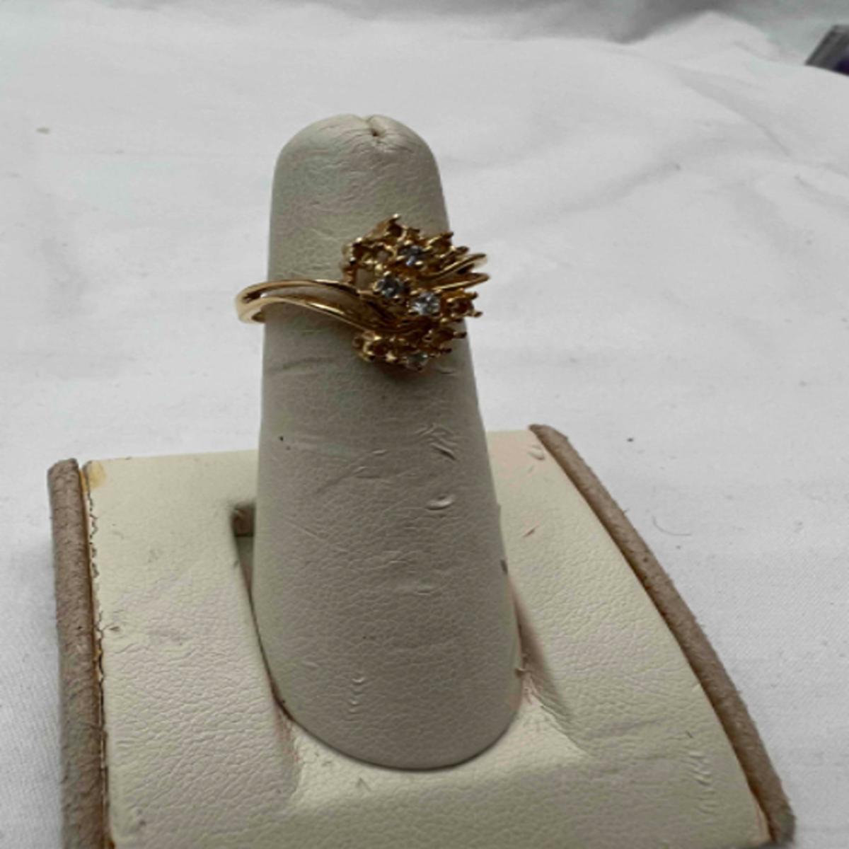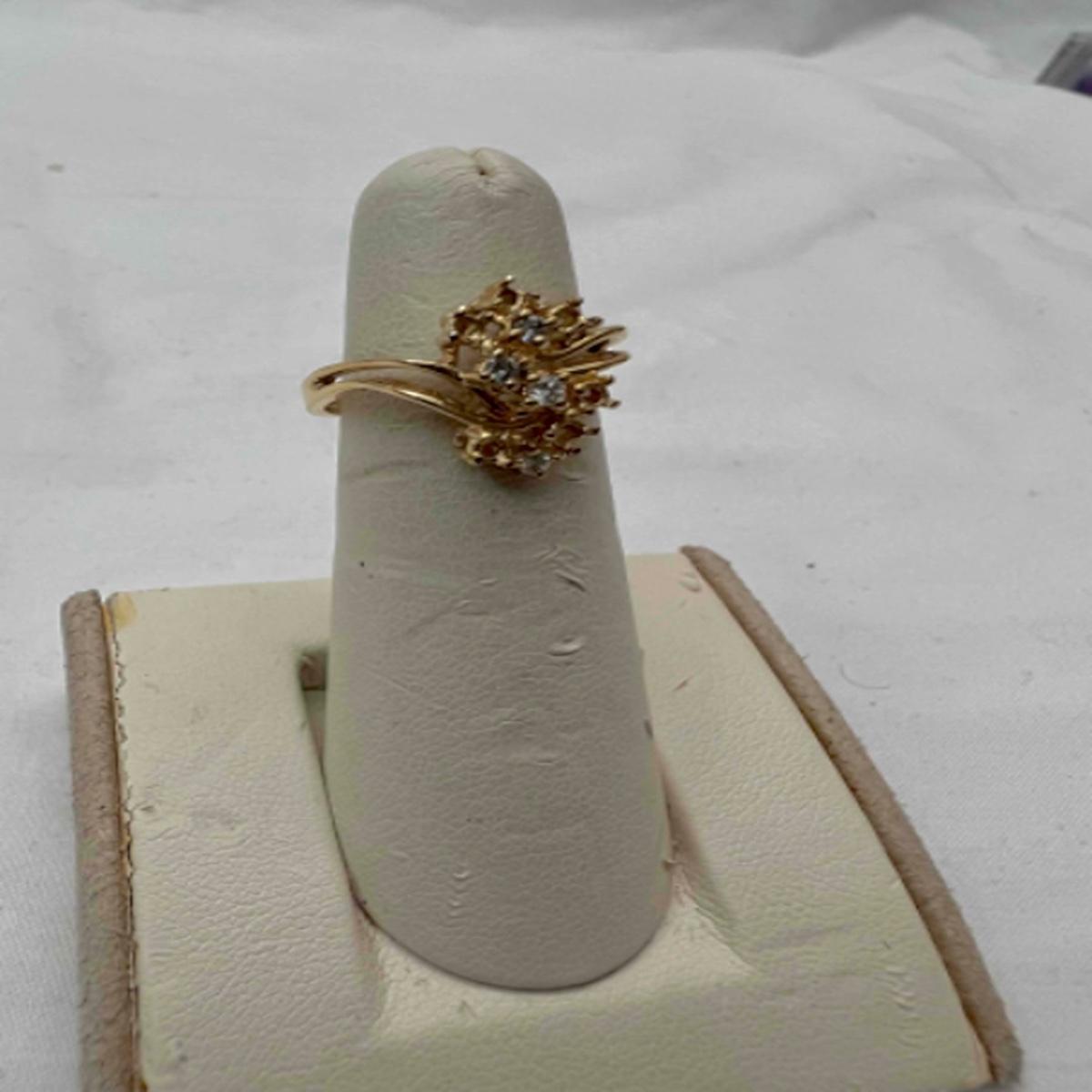 Stunning 14k gold ring with a cluster of diamonds; these did not test positive for diamonds. Please note that some of the stones might be missing, see images. Ring is size 6. Case is included.