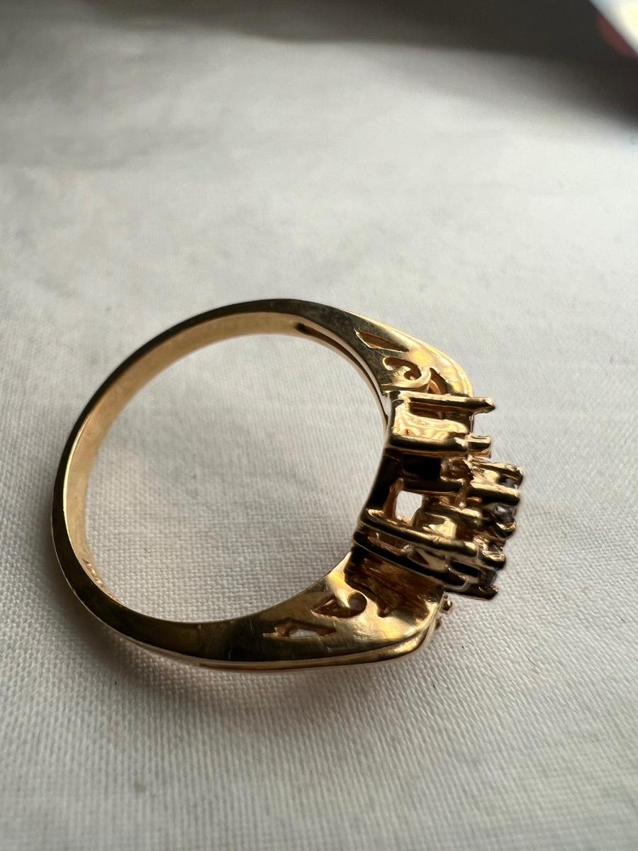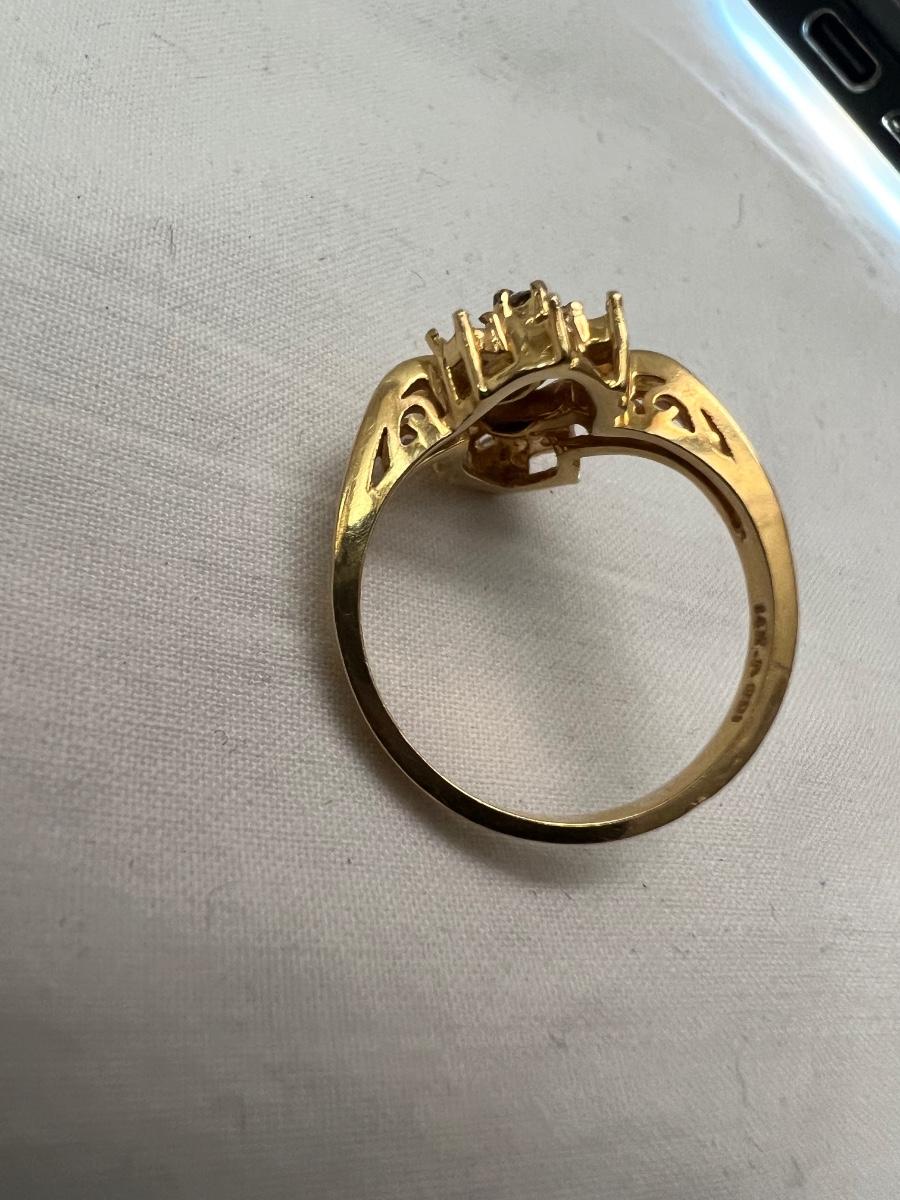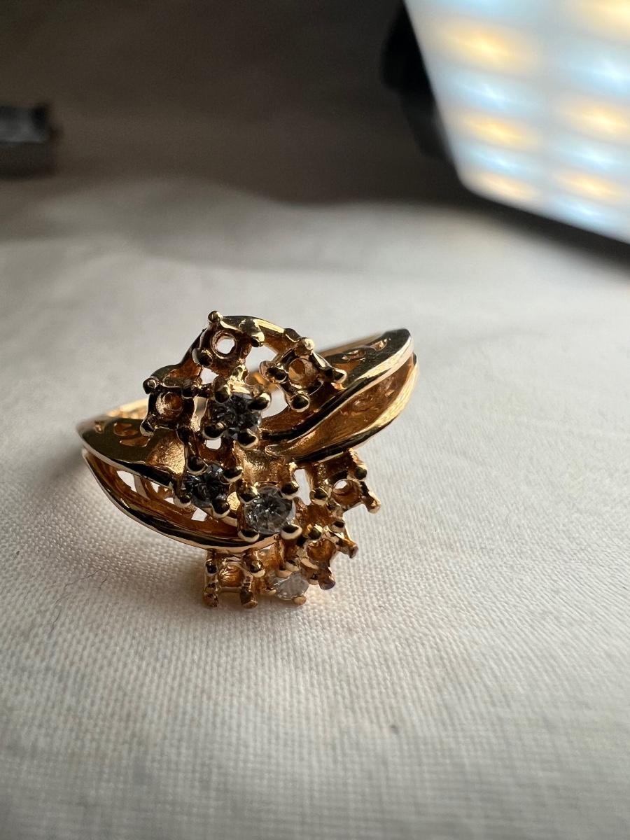 Stunning 14k gold ring with a cluster of diamonds; these did not test positive for diamonds. Please note that some of the stones might be missing, see images. Ring is size 6. Case is included.